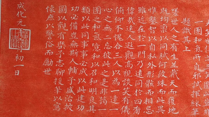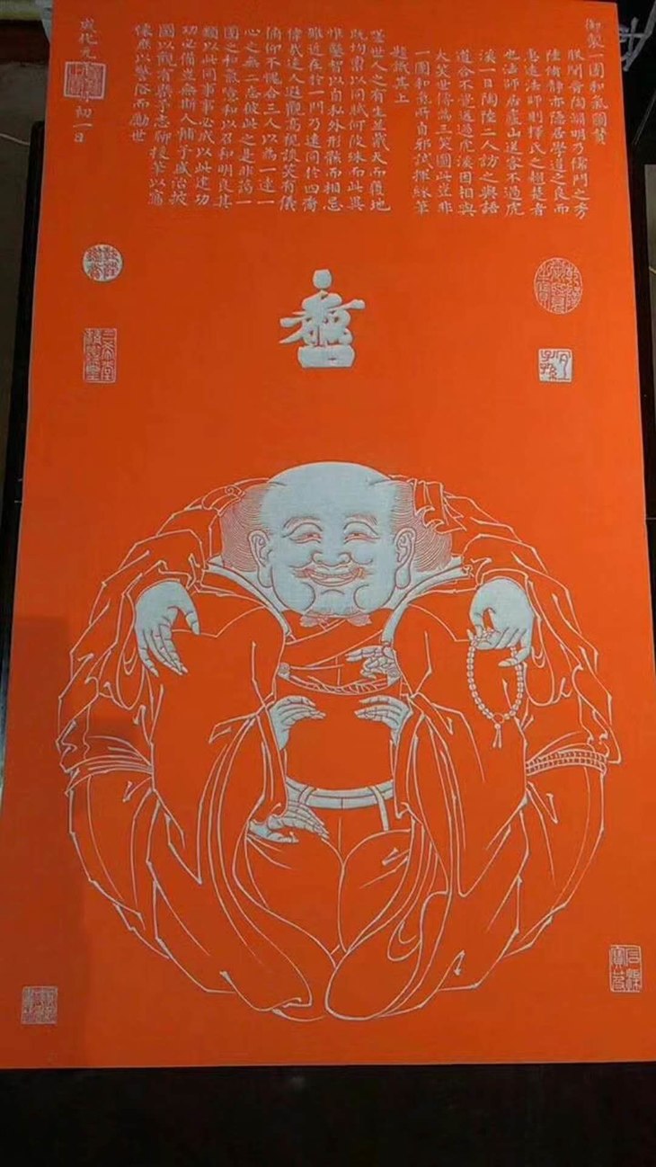 作品简介:此图是明朝成化帝宪宗朱见深登基不久绘制的,并附《御制一团和气图赞》一首。在“和合致祥”四字之下,一笑面弥勒盘腿而坐,体态浑圆,细看却是三人合一。左为一着道冠的老者,右为一戴方巾的儒士,二人各执经卷一端,团膝相接,相对微笑,第三人则手搭两人肩上,露出光光的头顶,手捻佛珠,是佛教中人。作品构思绝妙,人物造型诙谐,用图像的形式揭示了儒、释、道“三教合一”的主题思想。