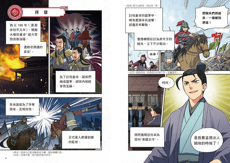特色1:精采漫畫重現自東漢末年黃巾之亂起義,至曹操的魏、劉備的蜀、孫權的吳三強鼎立,到最終司馬氏統一天下,建立晉朝,這將近100年間,英雄們馳騁戰場、征戰不斷,謀士間鬥智鬥力、突破僵局的歷史故事。針對艱深字詞與史實真相,隨頁附有補充注釋與歷史人文知識提點,幫助讀者通盤了解並澄清史實。