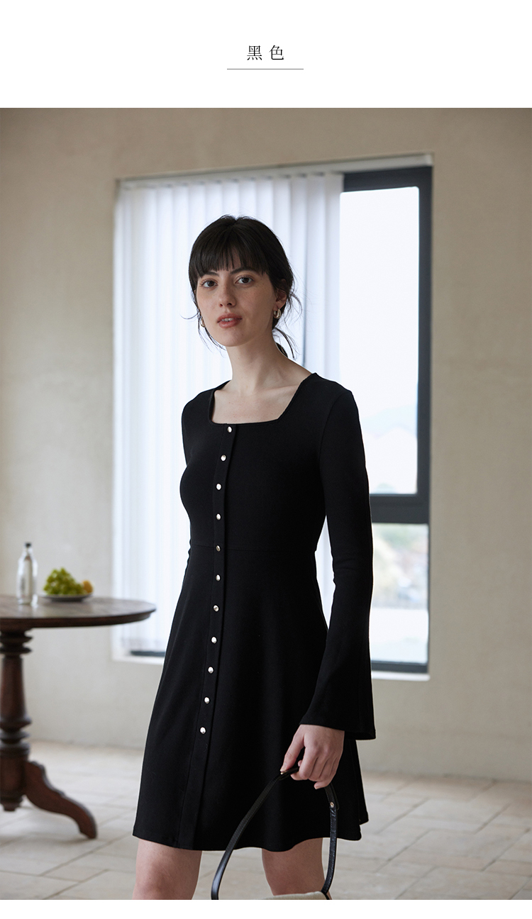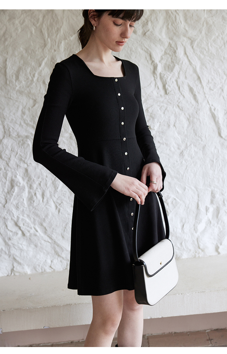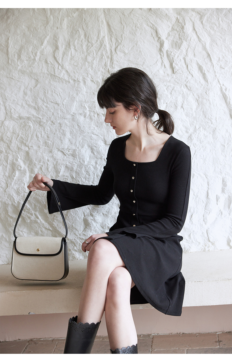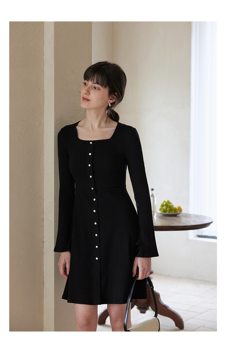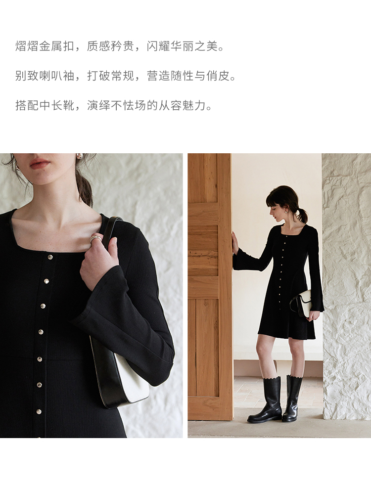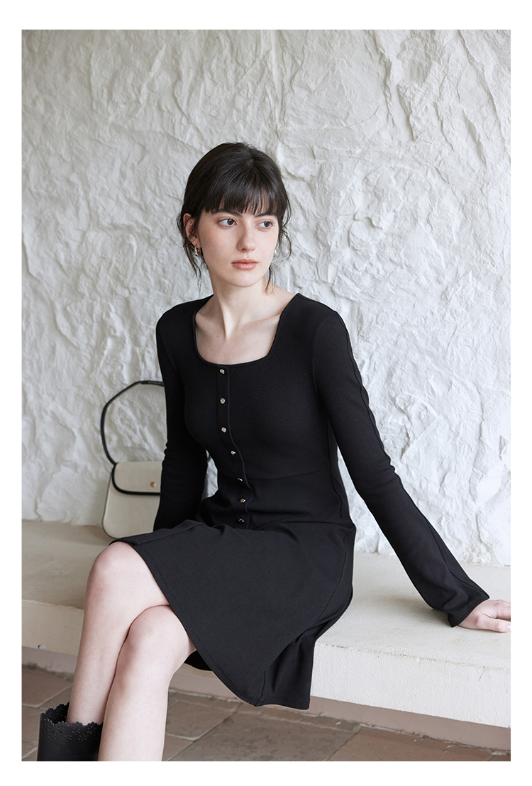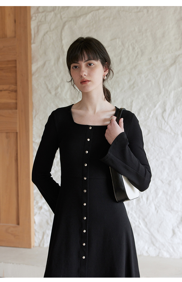 HeyDress法式方领针织连衣裙女春季复古排扣收腰设计长袖黑色裙子