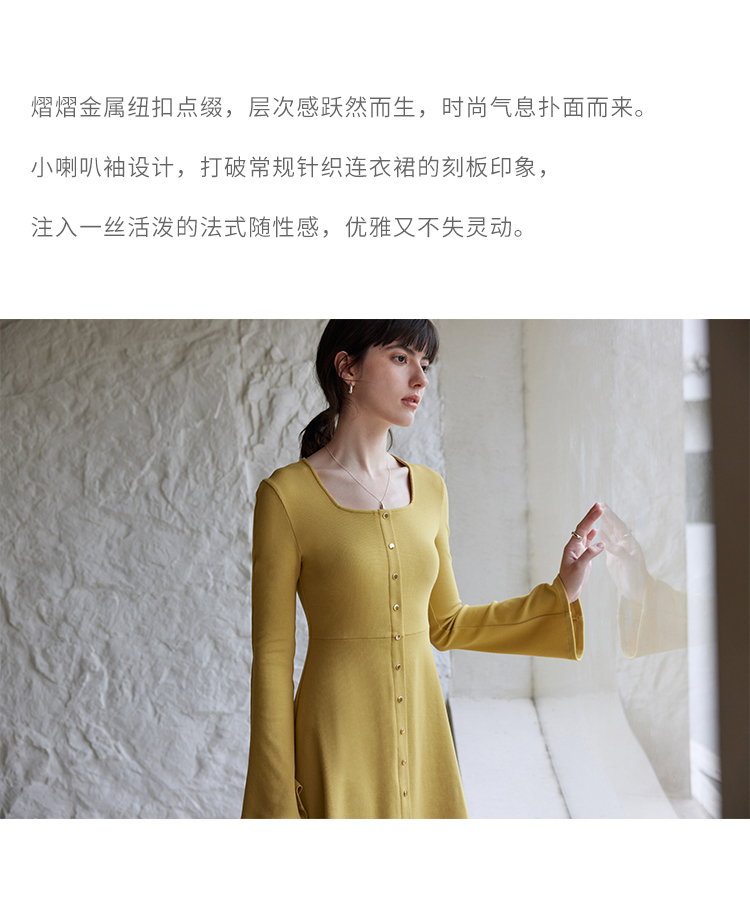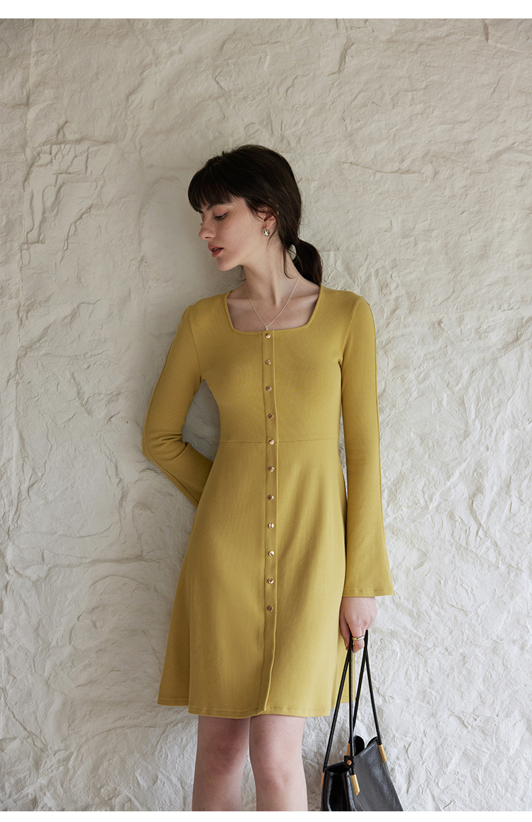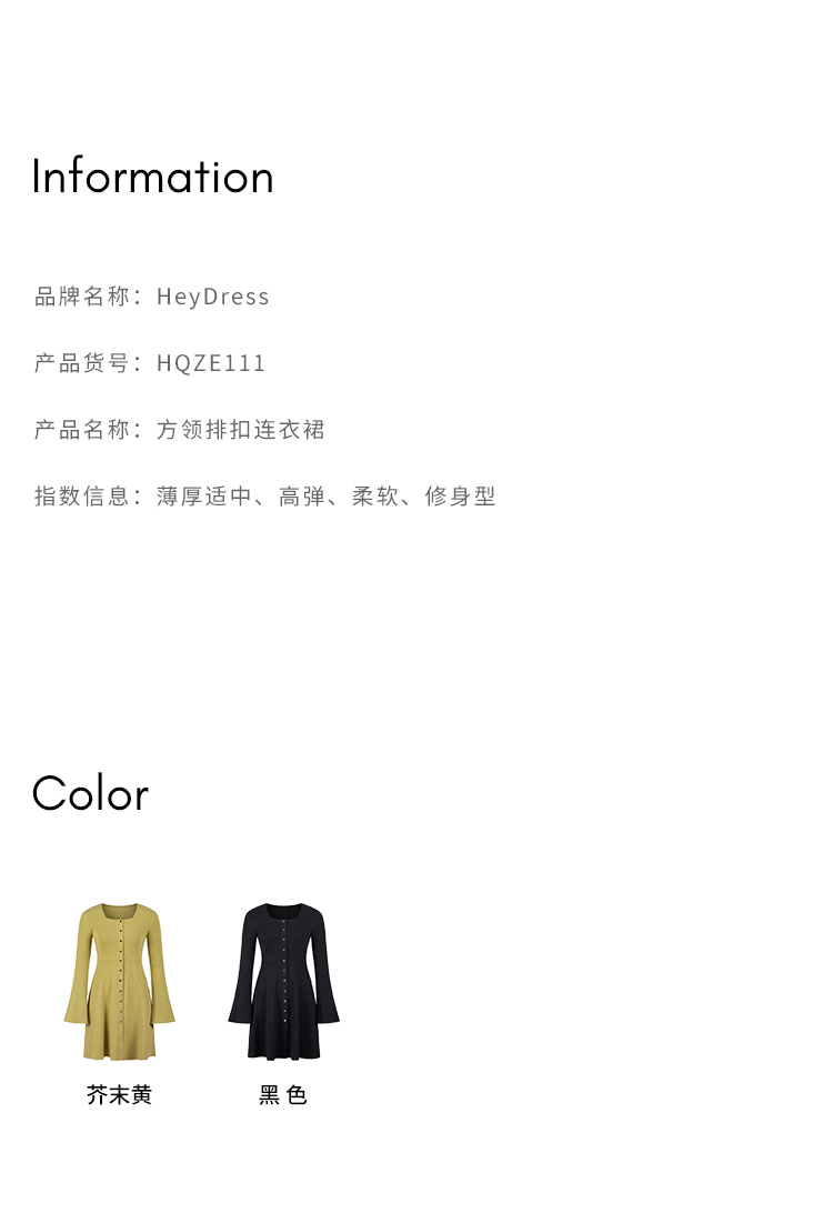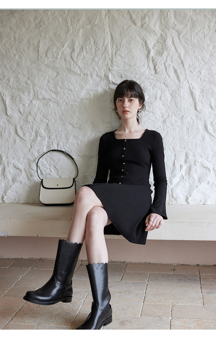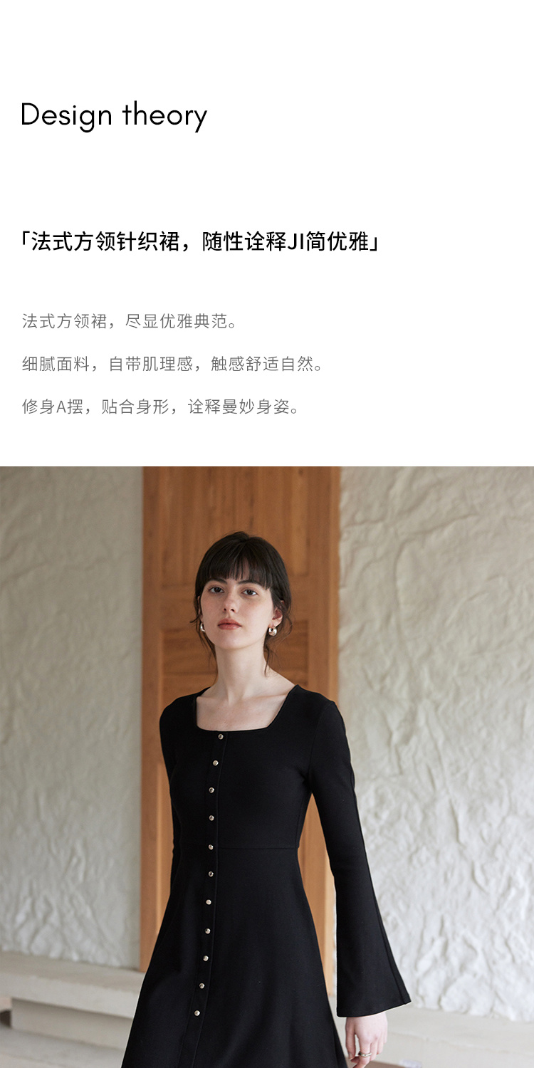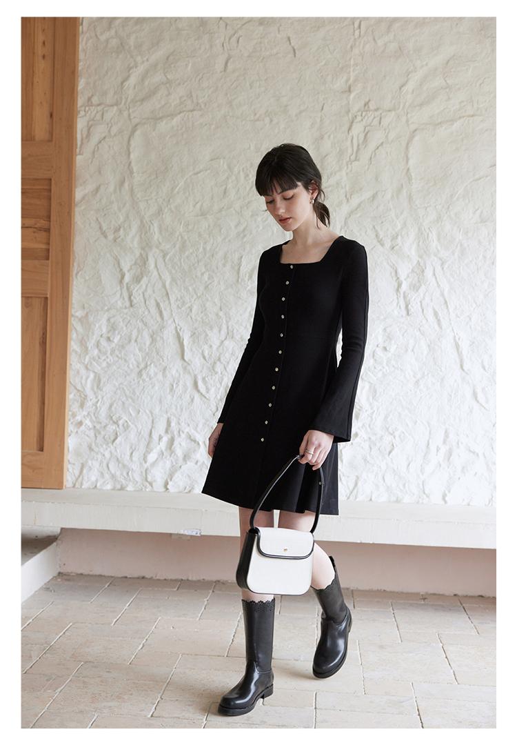 HeyDress法式方领针织连衣裙女春季复古排扣收腰设计长袖黑色裙子