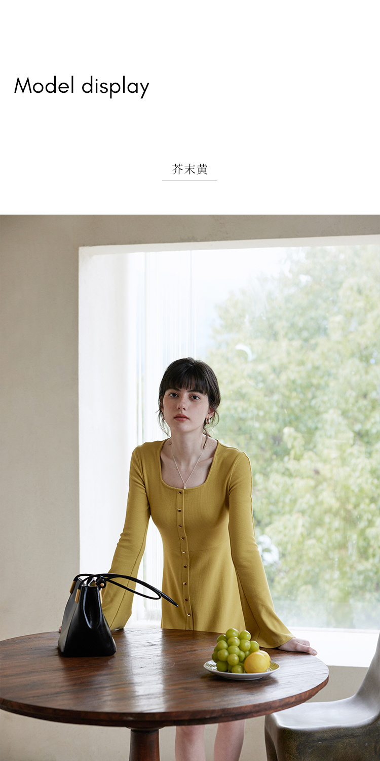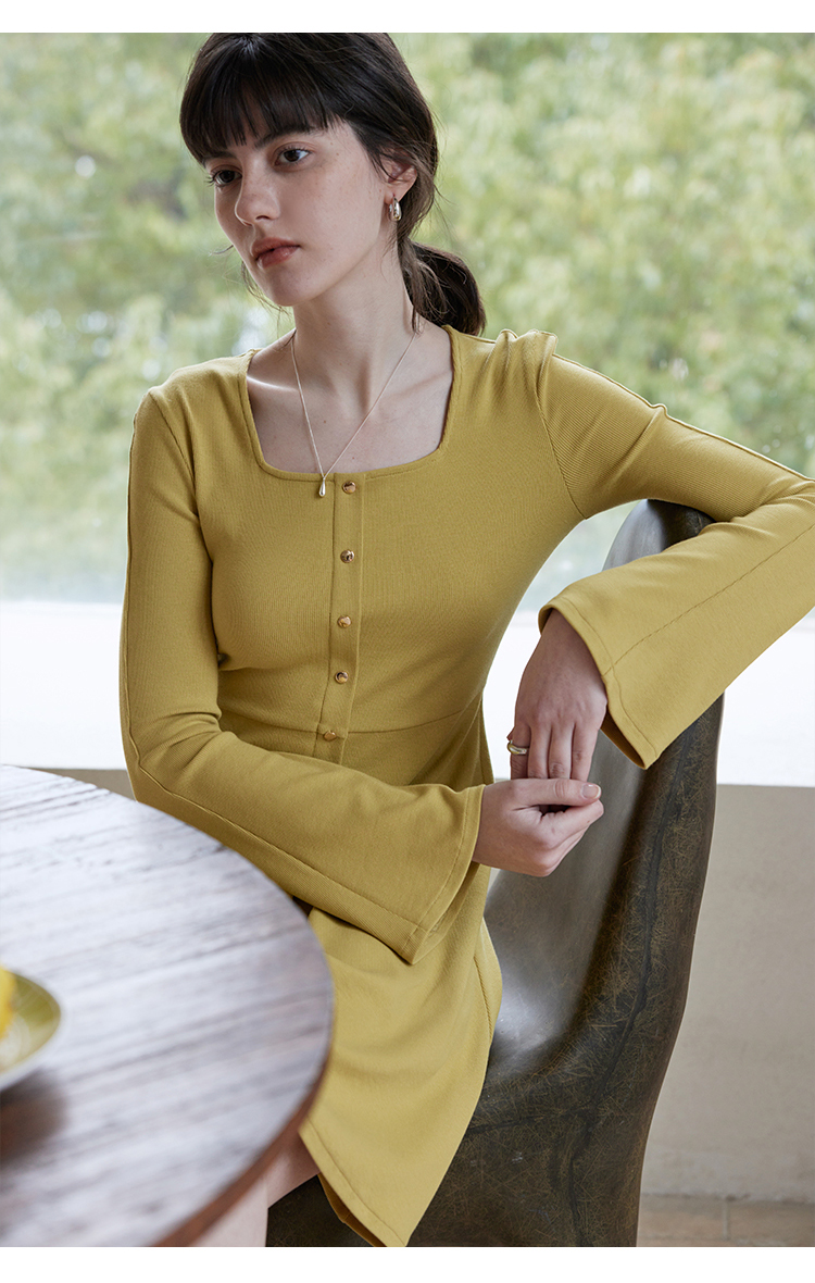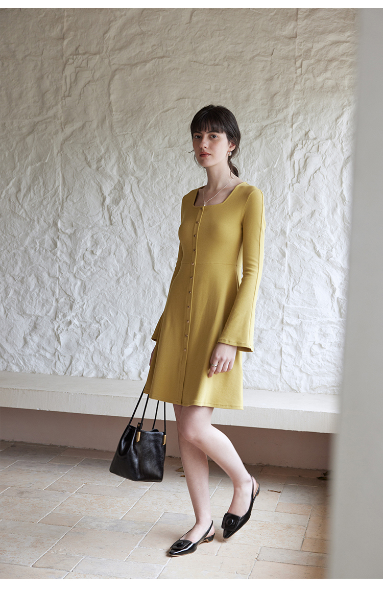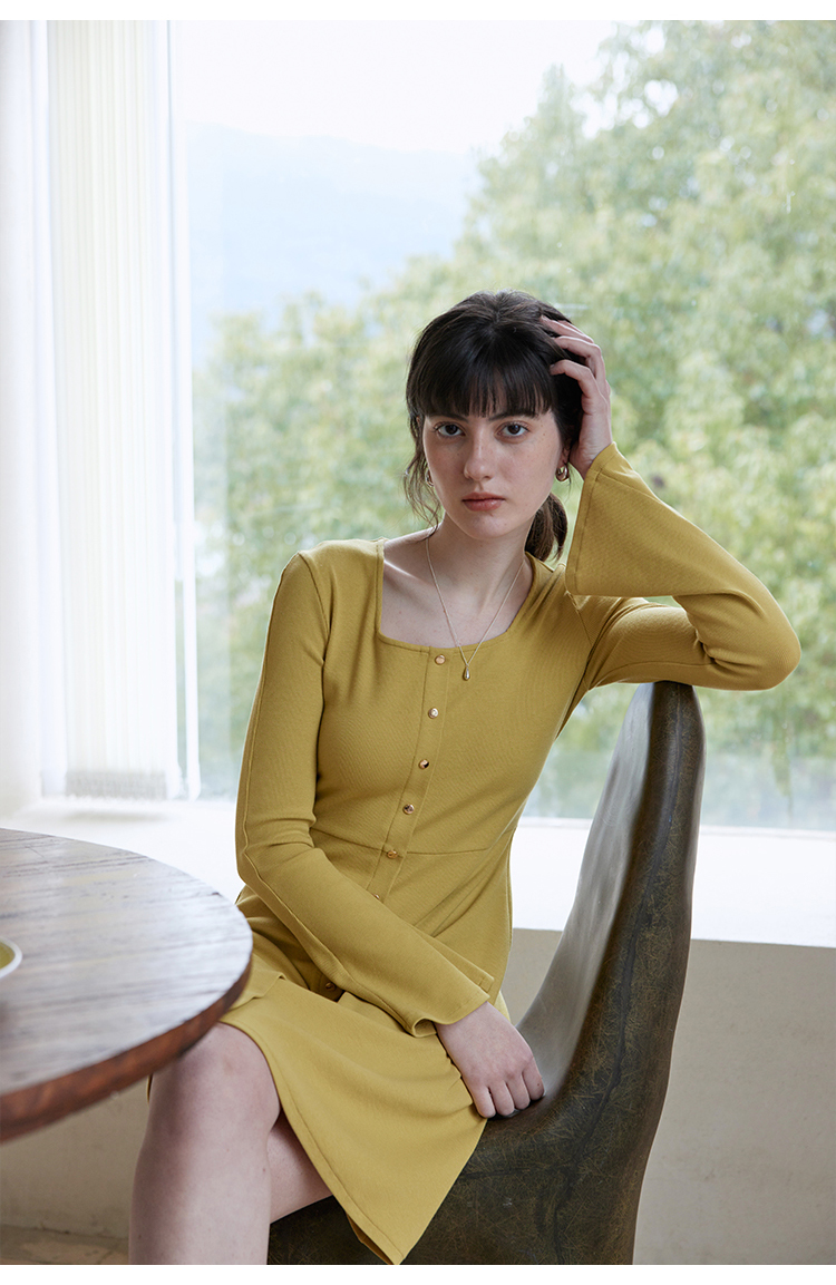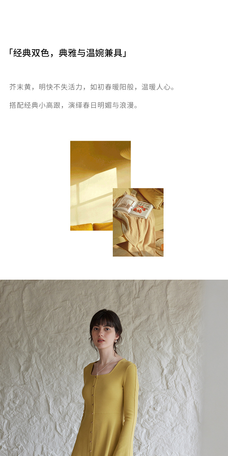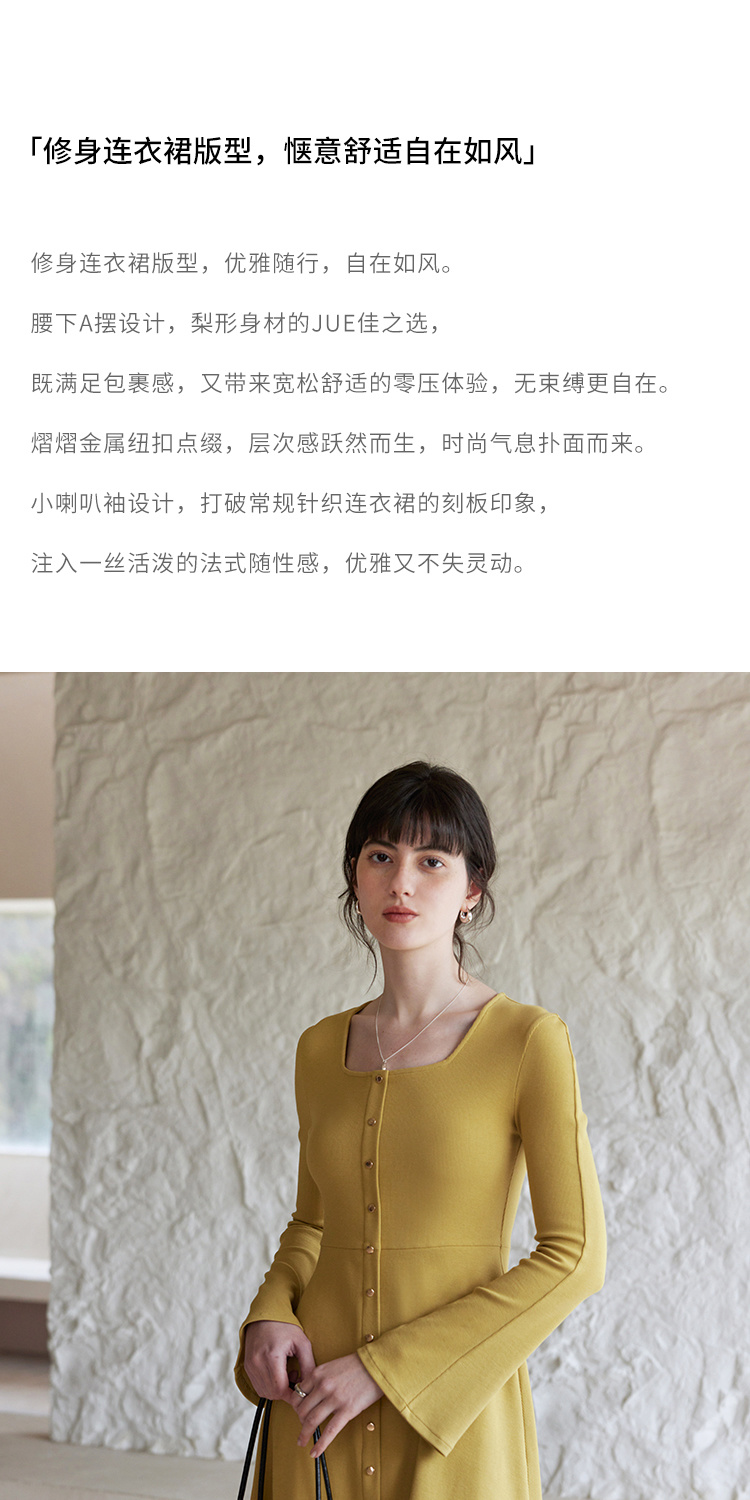 HeyDress法式方领针织连衣裙女春季复古排扣收腰设计长袖黑色裙子