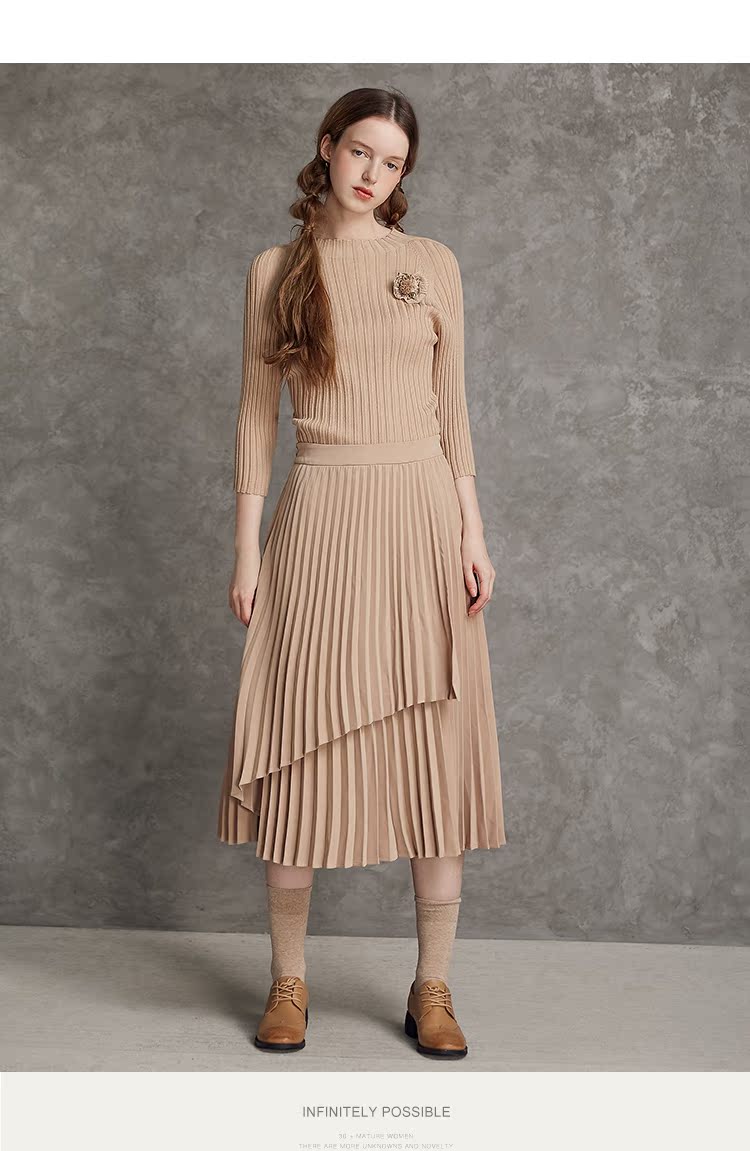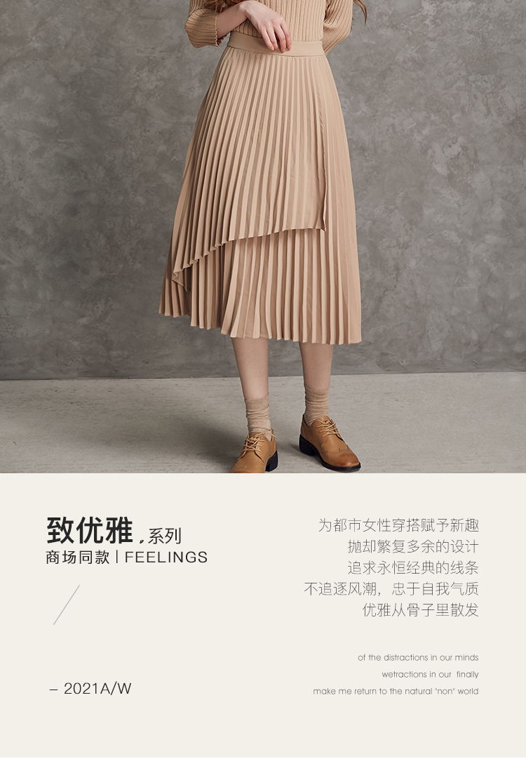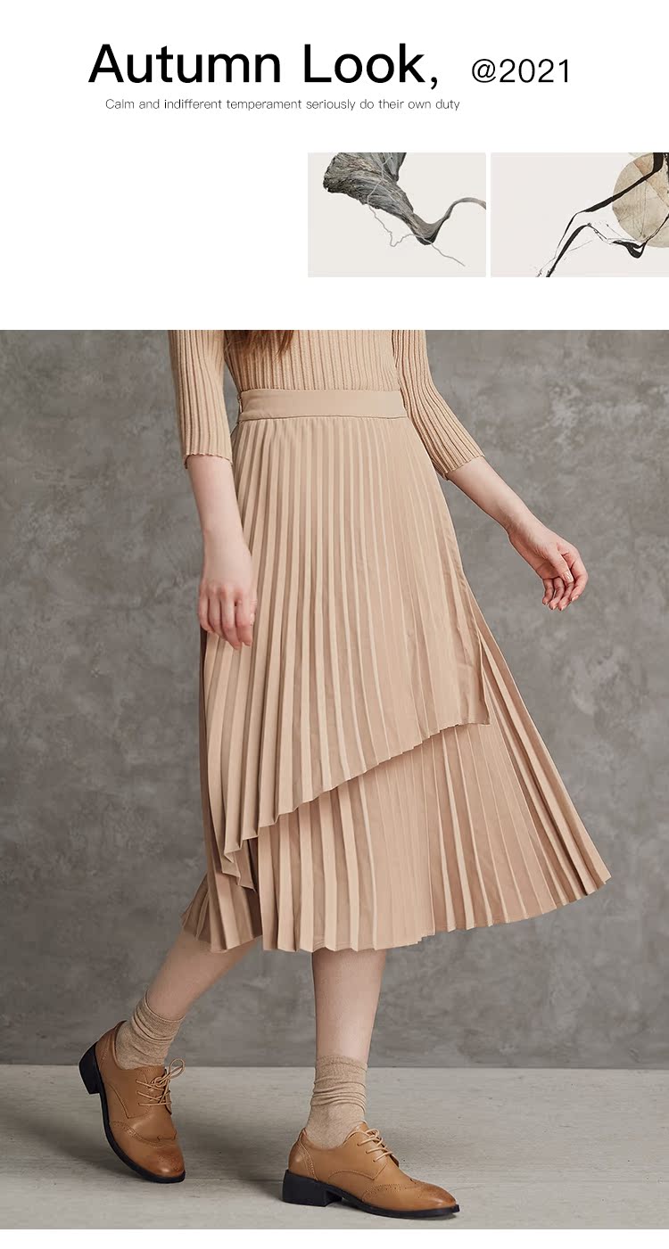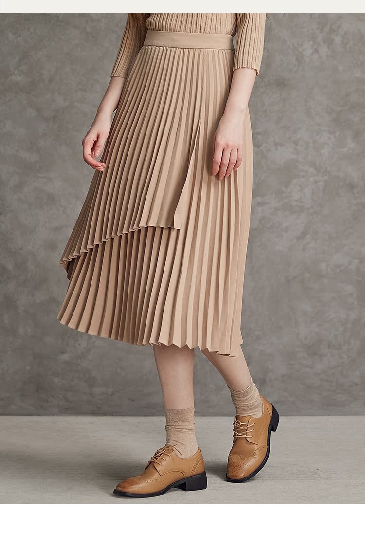 famecoco范可儿不对称百褶半身裙春秋季卡其色裙子女a字遮肚显瘦F185HA003