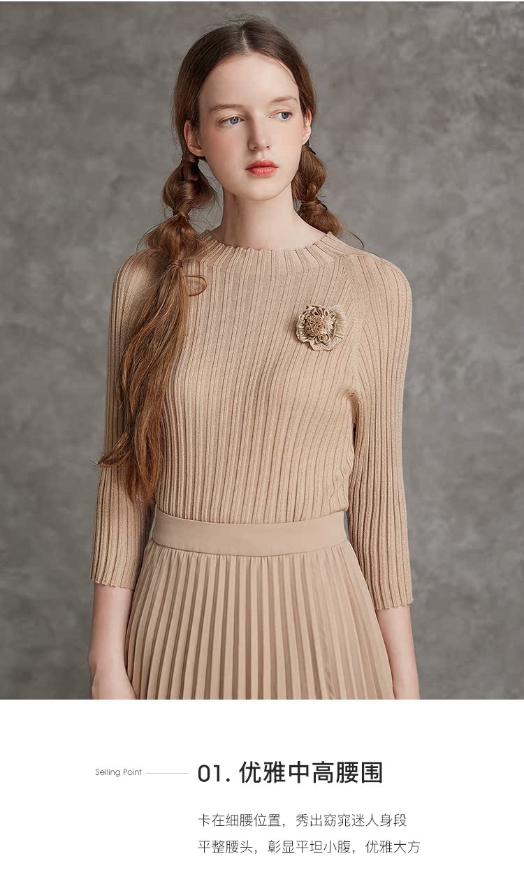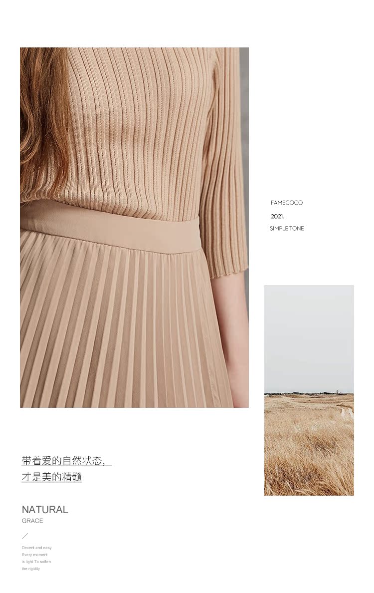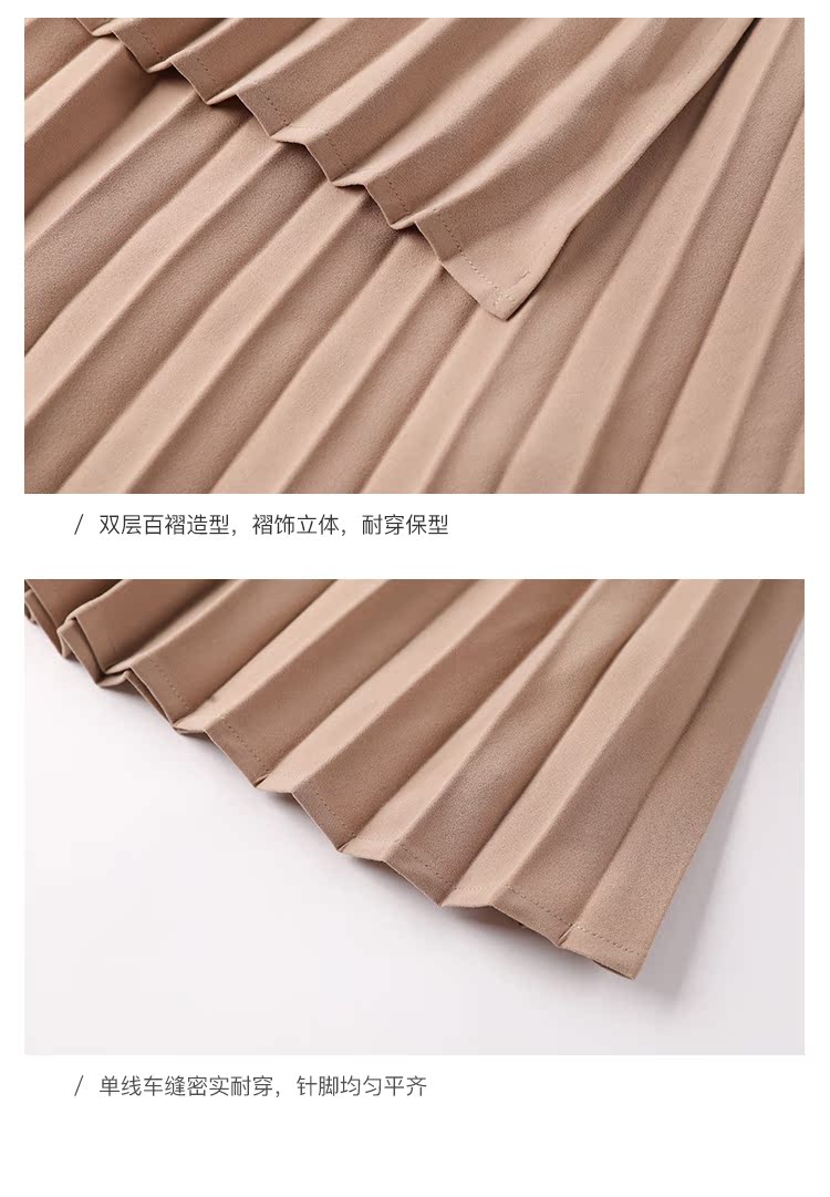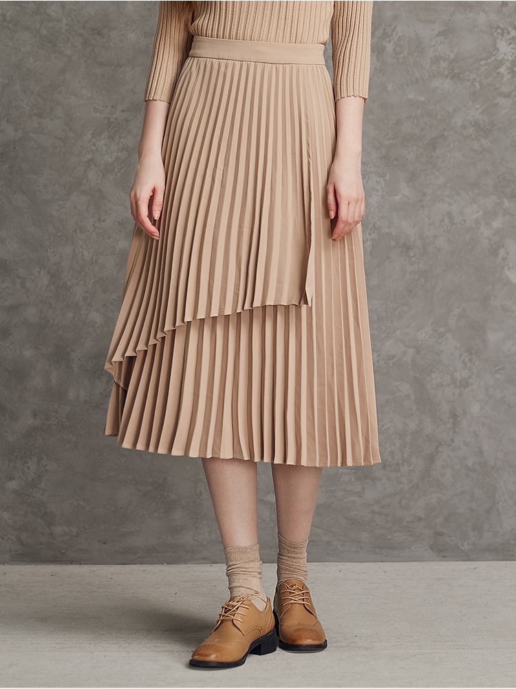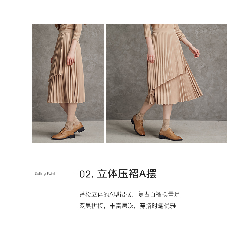 famecoco范可儿不对称百褶半身裙春秋季卡其色裙子女a字遮肚显瘦F185HA003