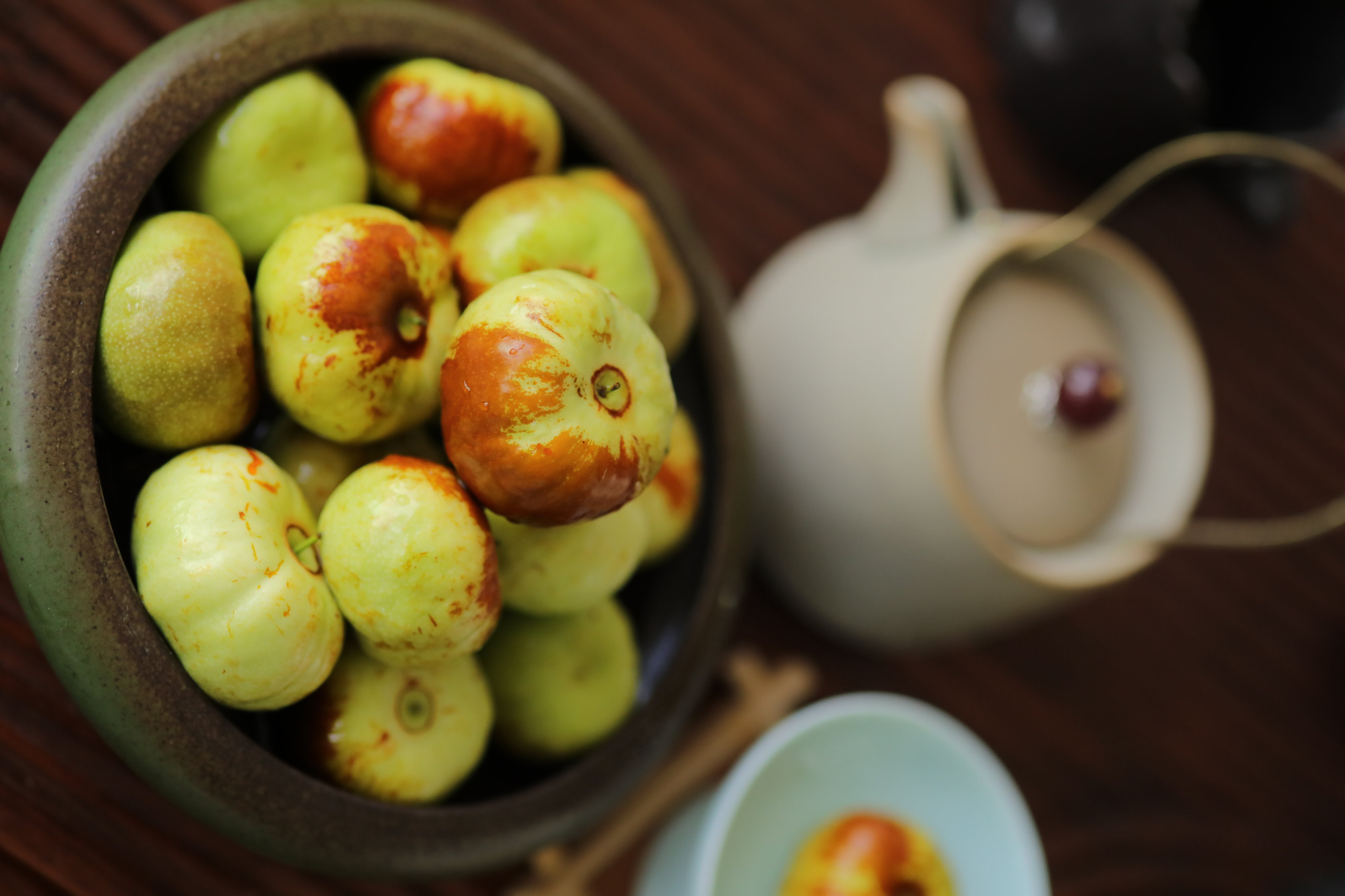 初看蟠枣,个头壮实饱满,长得像个小青苹果,但是近看,却比苹果精致漂亮得多;外皮光滑亮泽,颜色也清新可爱,细细地闻,还能闻到清淡的枣香,令人心情舒畅。