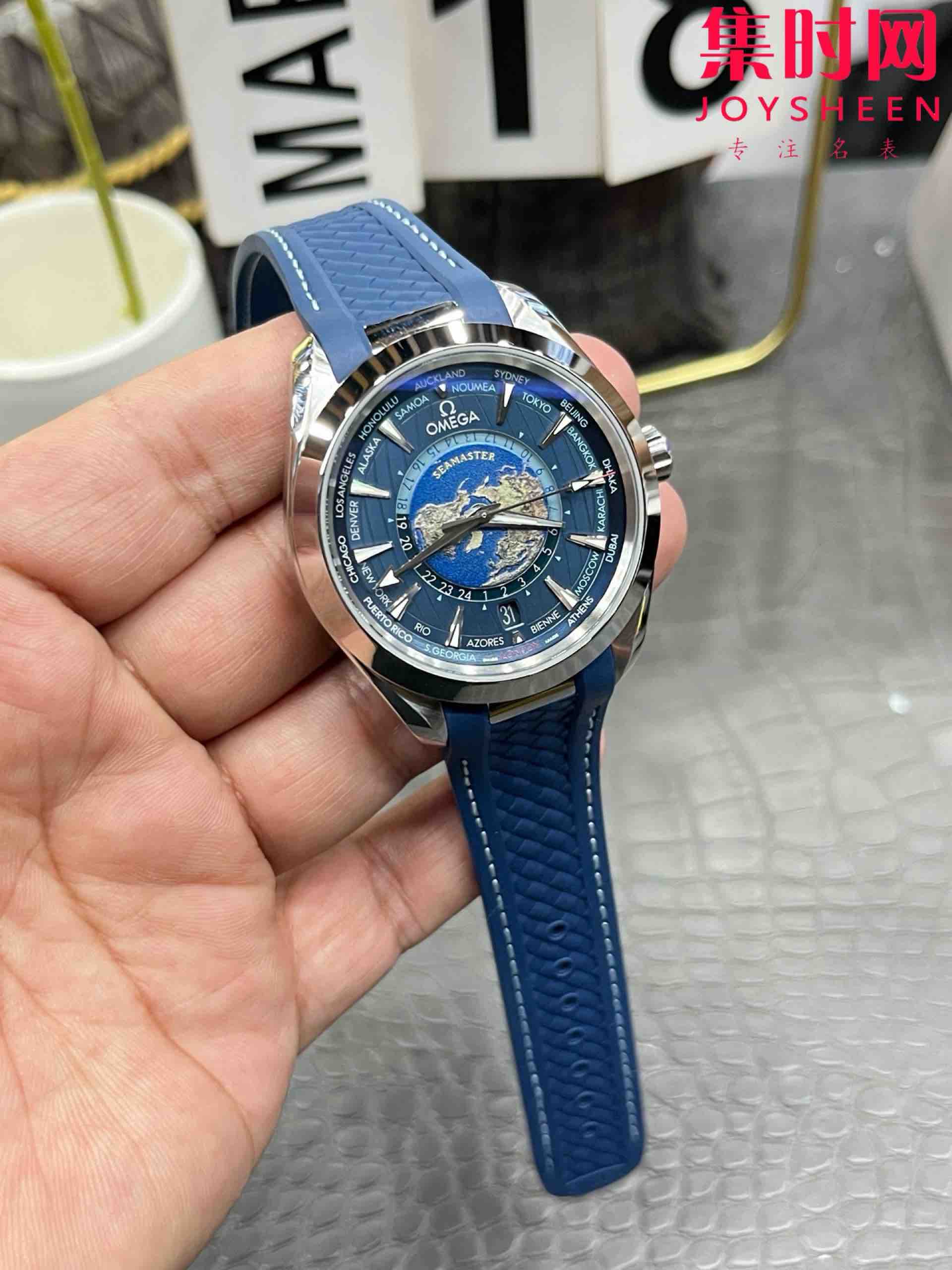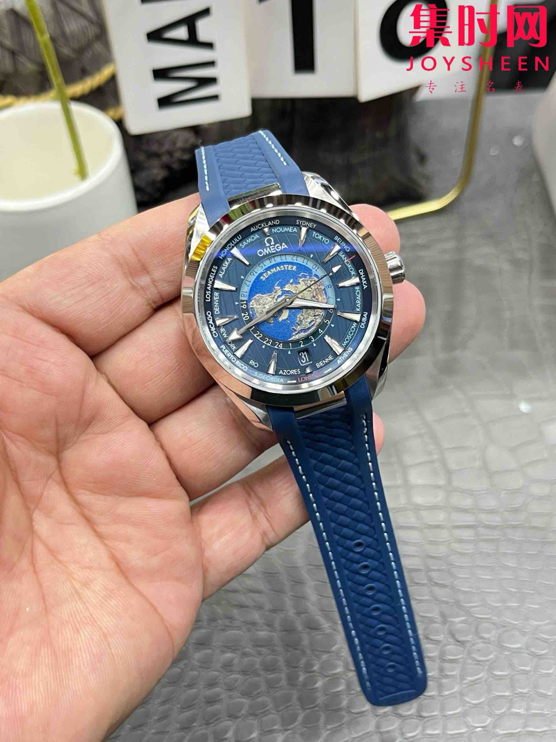 VS欧米茄海马世界时系列 VS海马世界时深海之蓝 蓝海马 海马世界时胶带款 男士腕表 表径43mm Aqua Terra 世界时腕表。一款可以戴着环游世界的世界时腕表,激光烧蚀蓝色海洋,陆地浮雕勾勒,24小时hesalite水晶环。辽阔世界尽在掌握,于方寸之间伴您开启环球之旅!搭载VS定制Cal.8938多功能全自动机械机芯,蓝宝石水晶镜面,316L精钢表壳,定制橡胶表带,原装折叠扣,功能同步原装真实可用!表径43mm