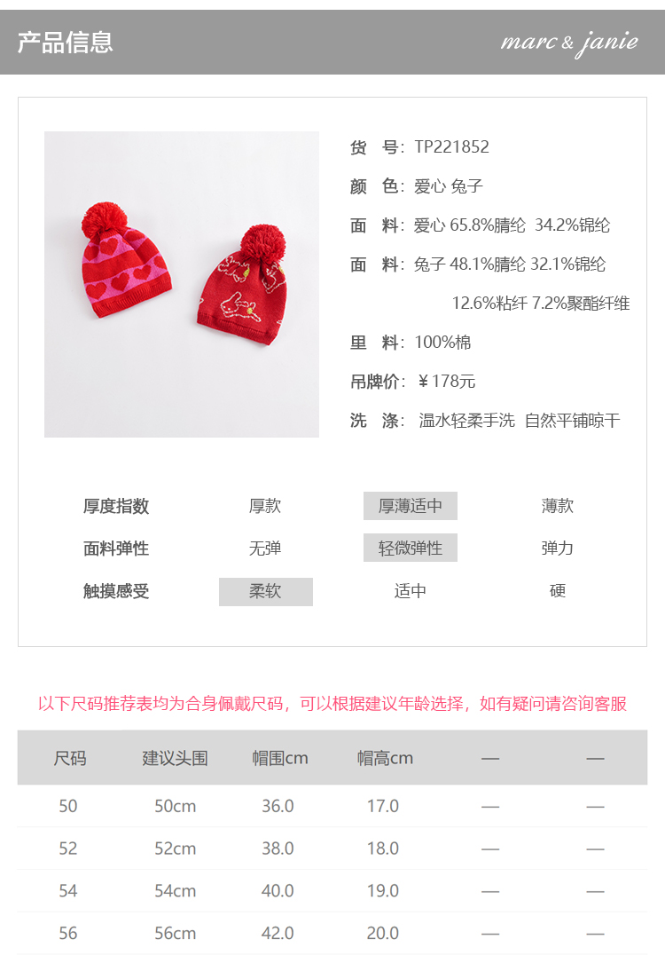 【柔蓝绒】马克珍妮冬装 男女童提花毛线帽 宝宝帽子221852