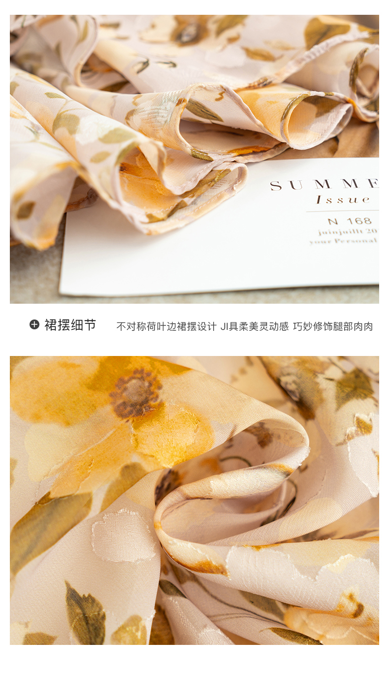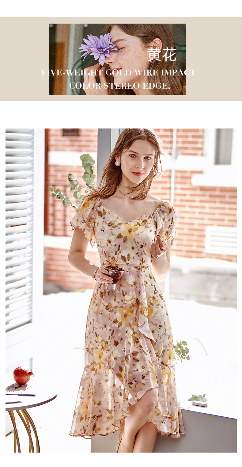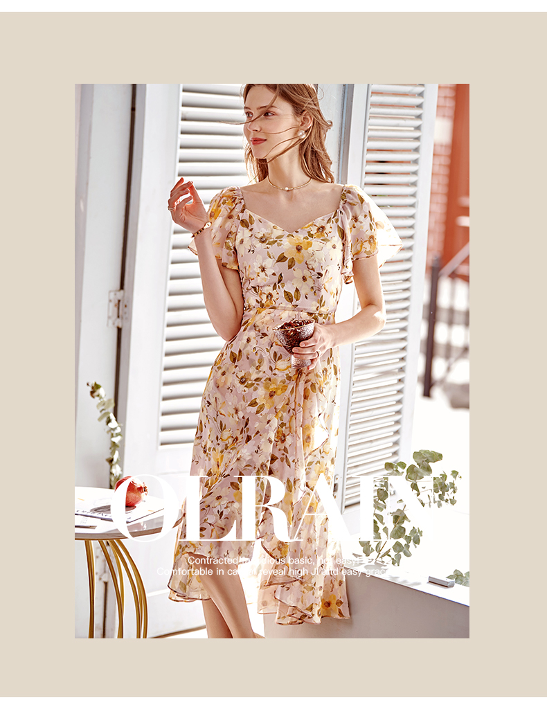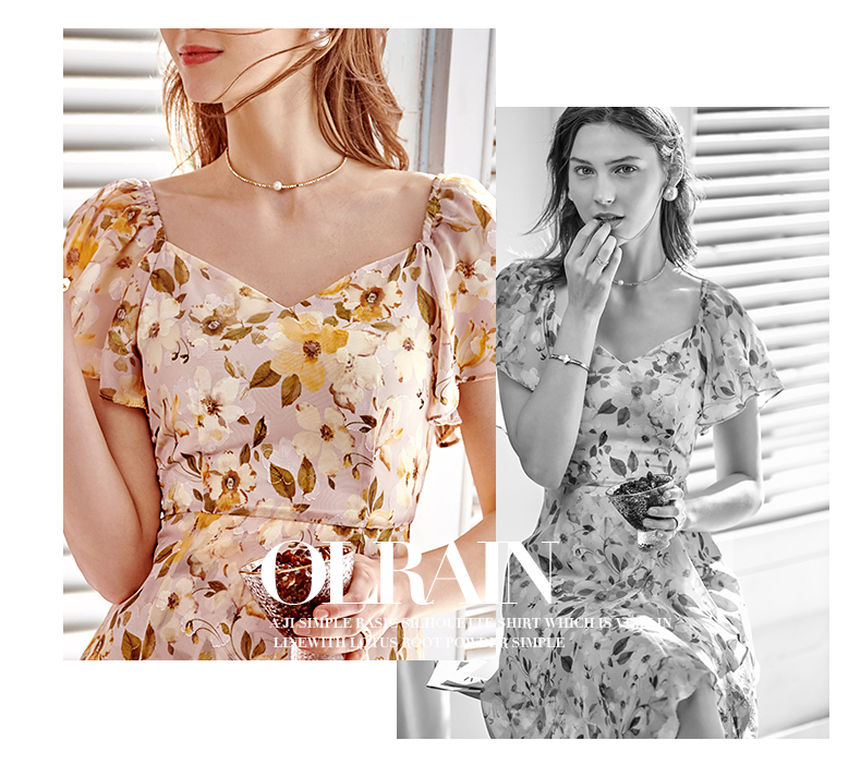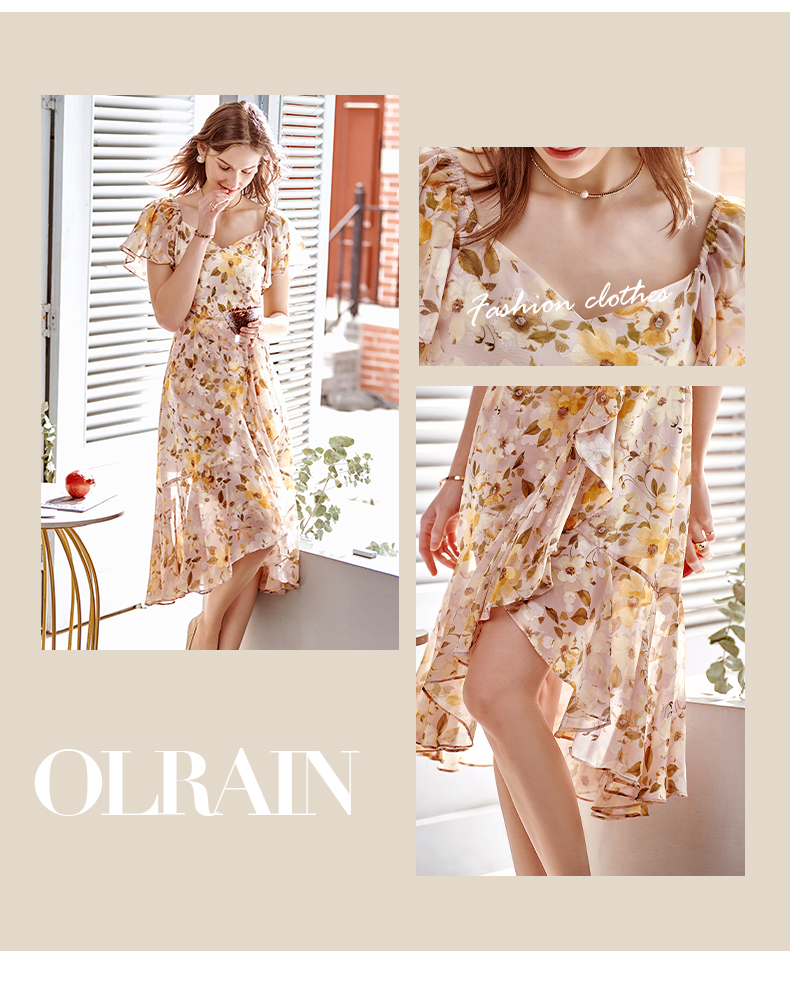 欧芮儿碎花雪纺连衣裙2021新款夏收腰显瘦法式优雅复古V领中长裙