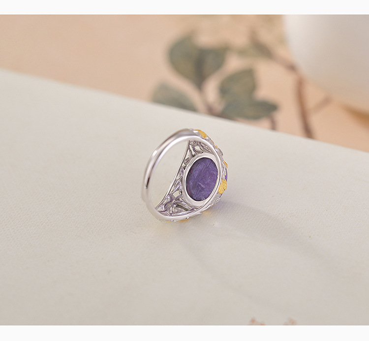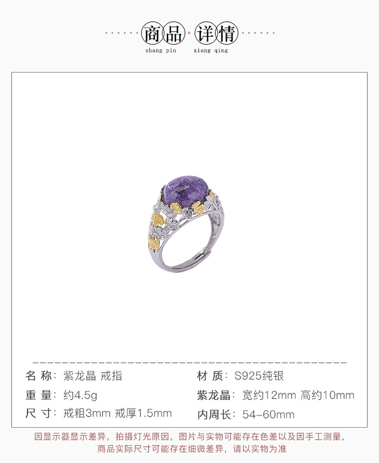 【杏运满分】S925纯银紫龙晶银杏叶椭圆形开口戒指【CW-JZ07082】