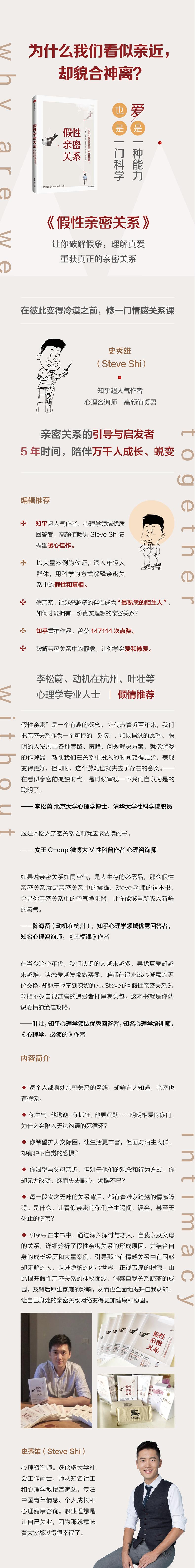 史秀雄(Steve Shi)在《假性亲密关系》一书中,通过深入探讨与恋人、自我以及父母的关系,详细分析了假性亲密关系的形成原因,并结合自身的成长经历和大量案例,引导那些在情感关系中有困惑却无解的人,走进隐秘的内心世界,正视苦痛的根源,由此揭开假性亲密关系的神秘面纱,洞察自我关系疏离的成因,及背后原生家庭的影响,从而更地提升自我认知,让自己身处的亲密关系网络变得更加健康和稳固。