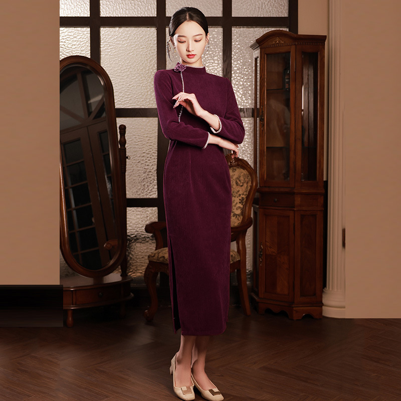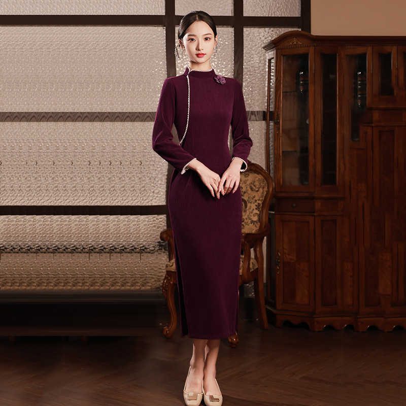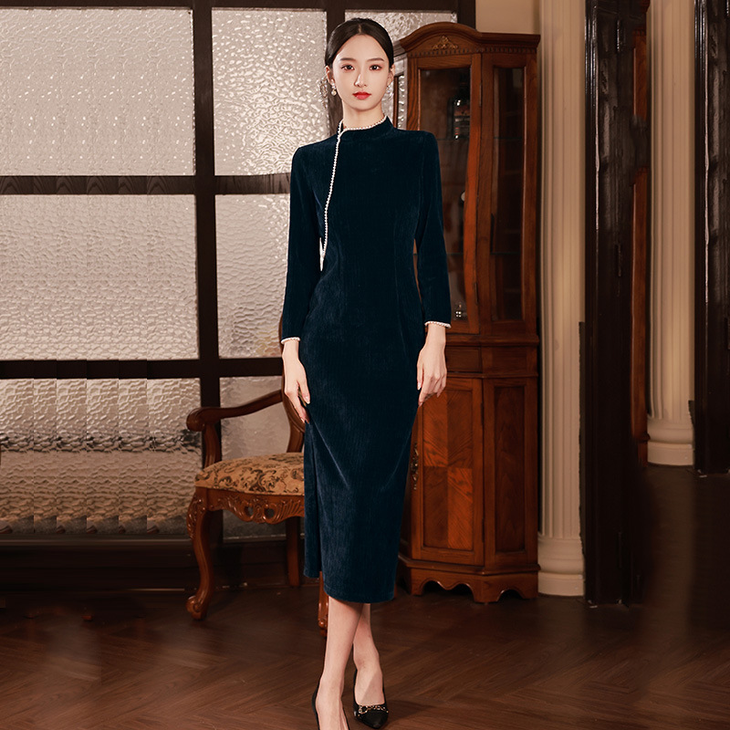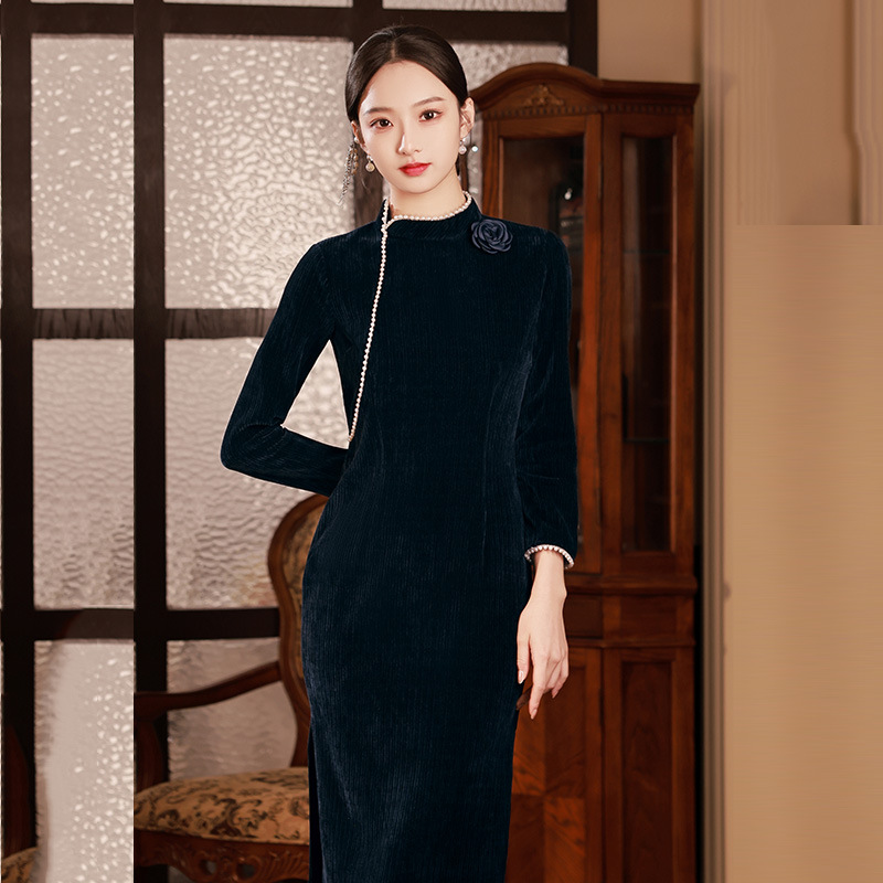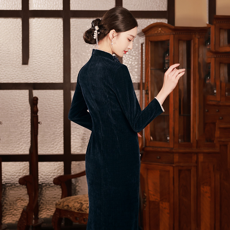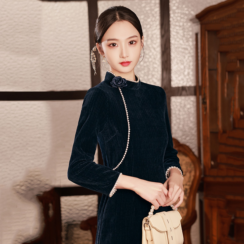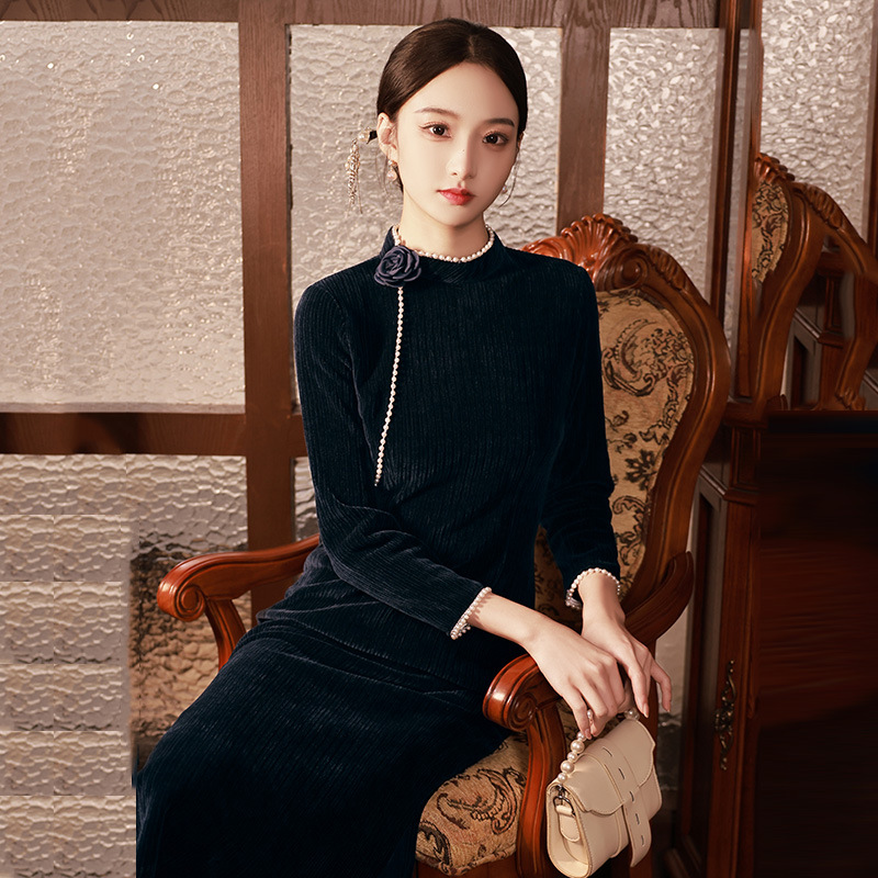 藏青色新中式国风,长款改良旗袍 SC18060