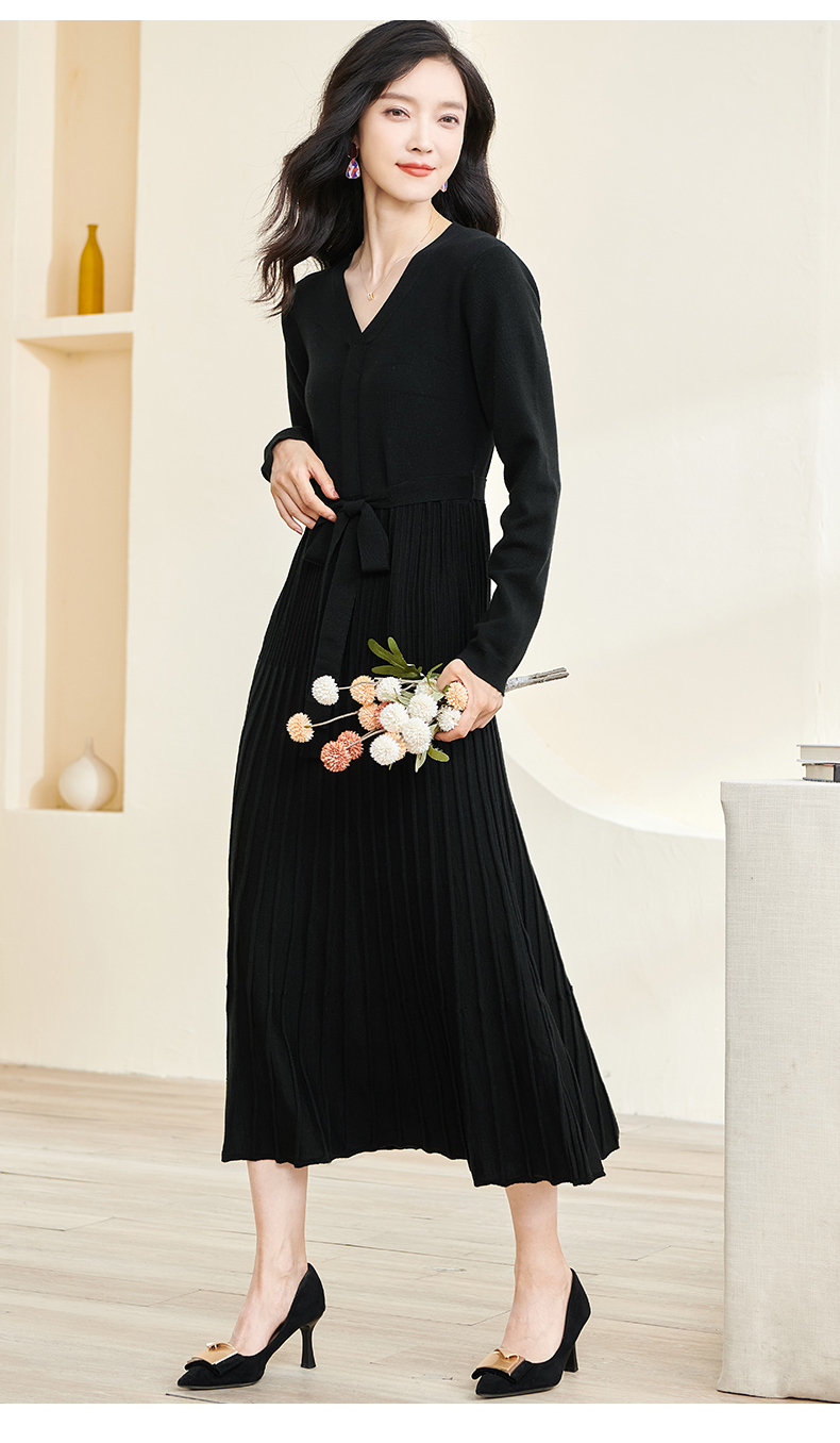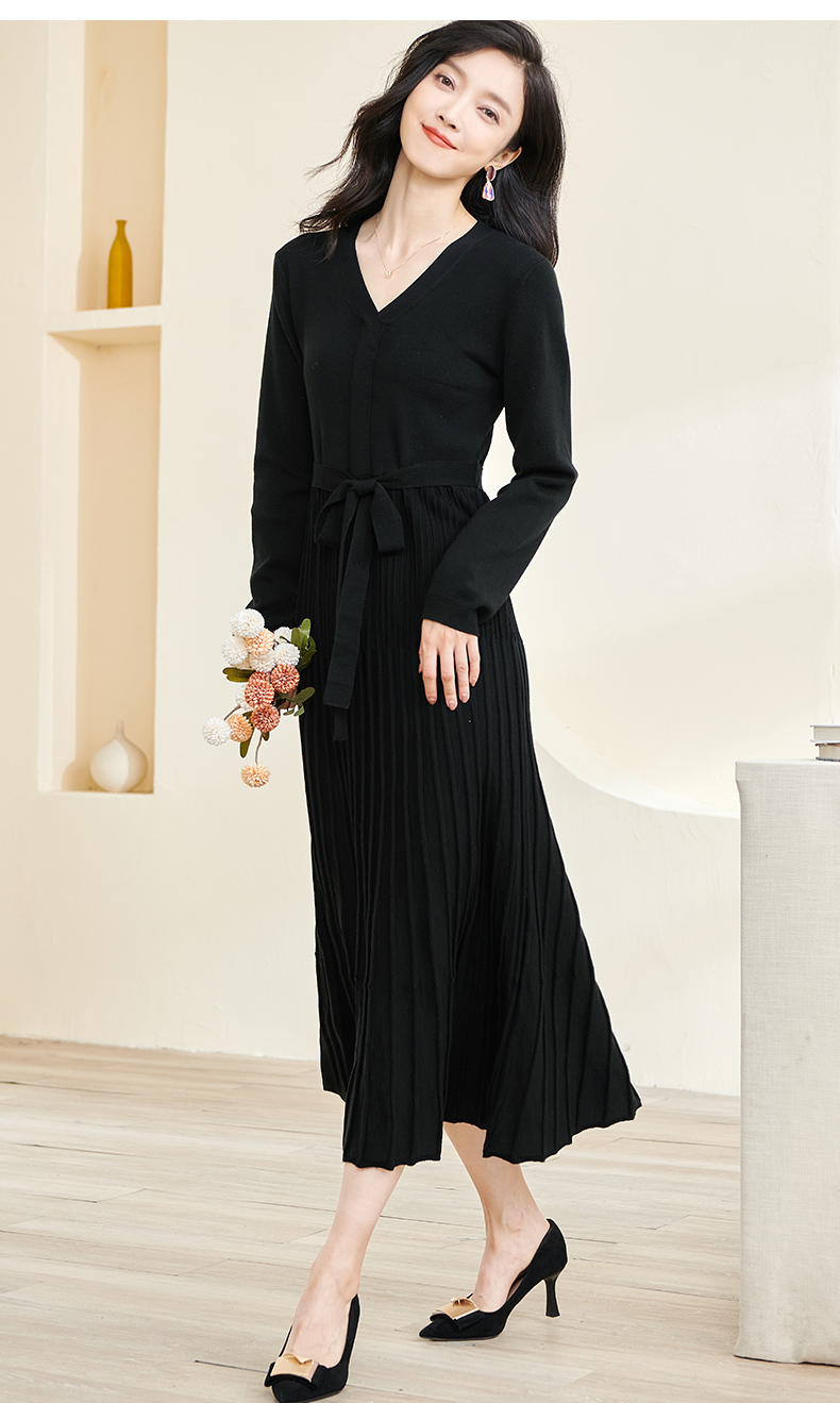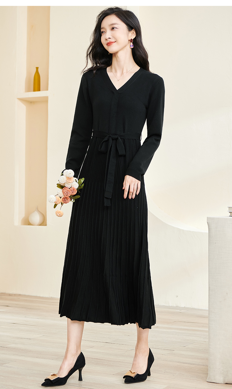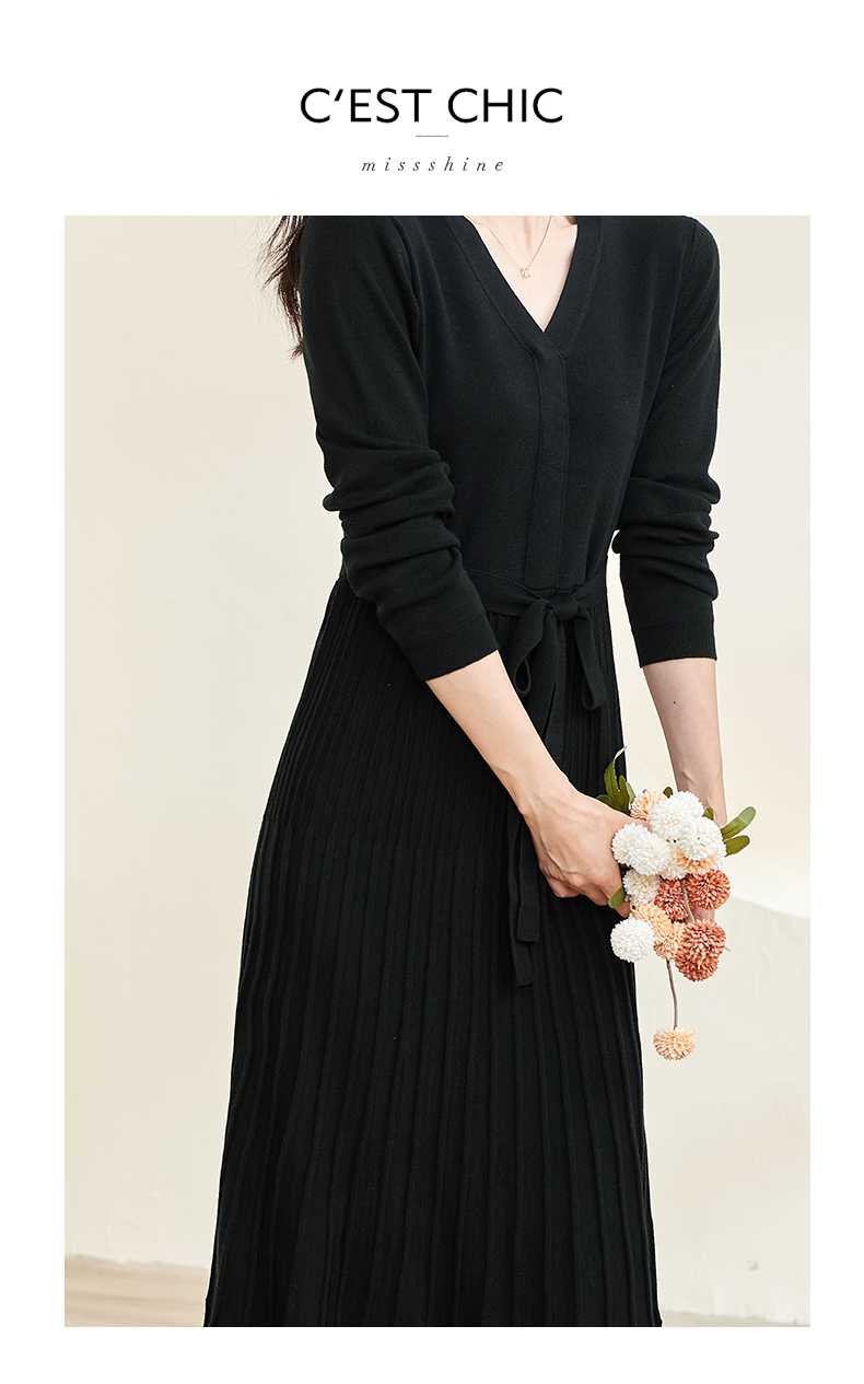 剩S/M/L/XL 米思阳2026春冬知性优雅V领长袖连衣裙黑色针织中长裙子3199