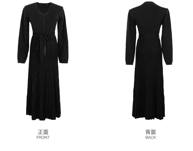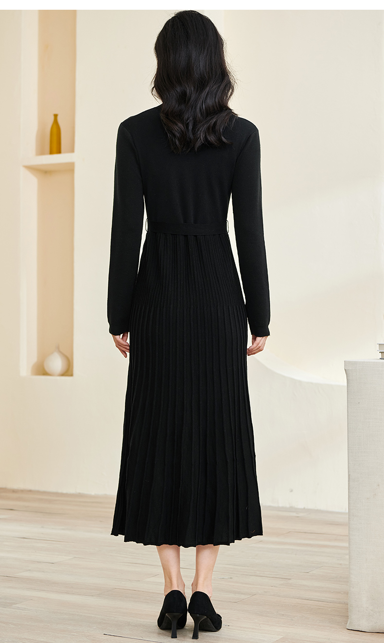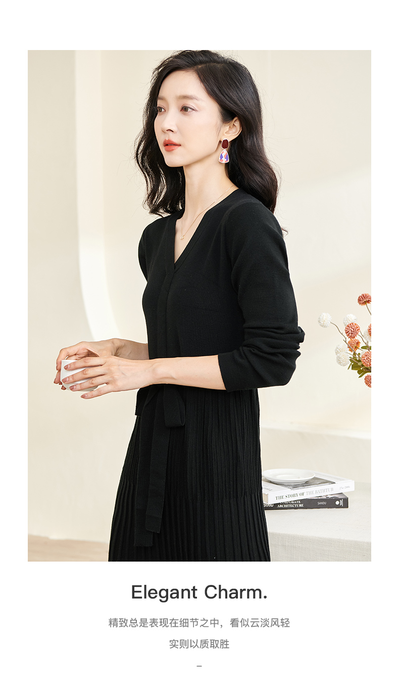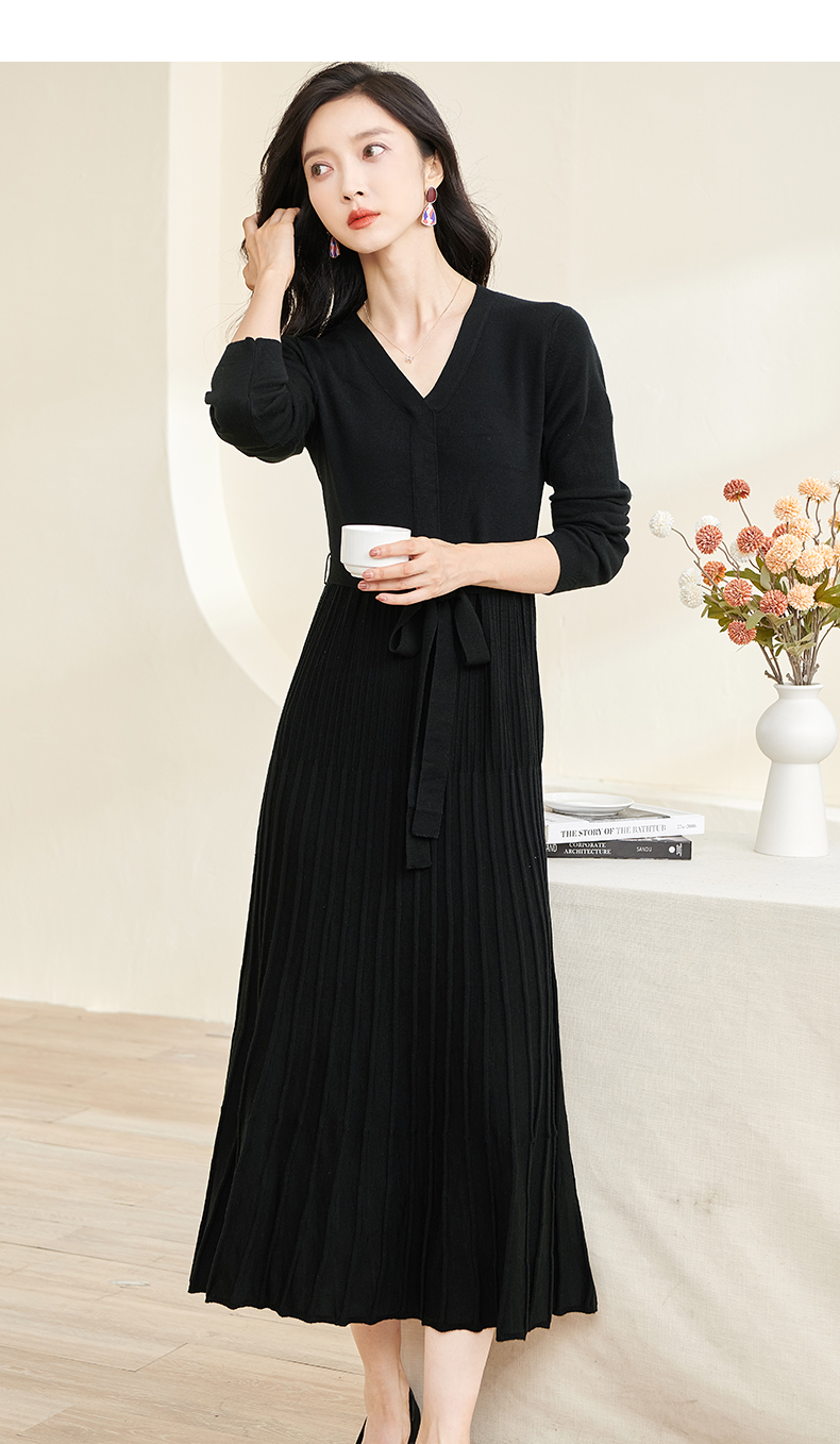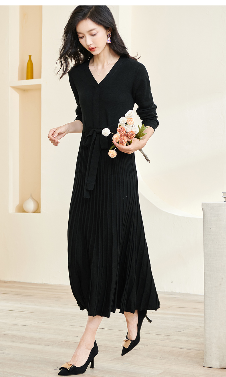 剩S/M/L/XL 米思阳2026春冬知性优雅V领长袖连衣裙黑色针织中长裙子3199