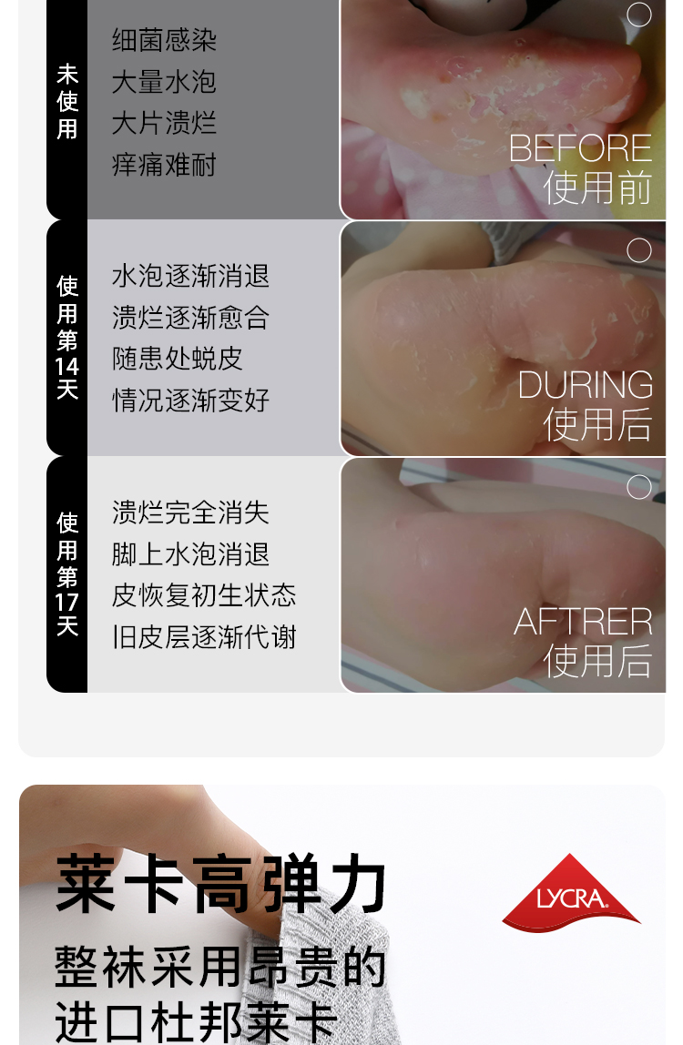 3、脚部脱皮可以修复皮肤,直到全部愈合为止;(坚持穿 整个过程基本5-10天左右)