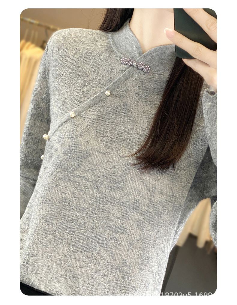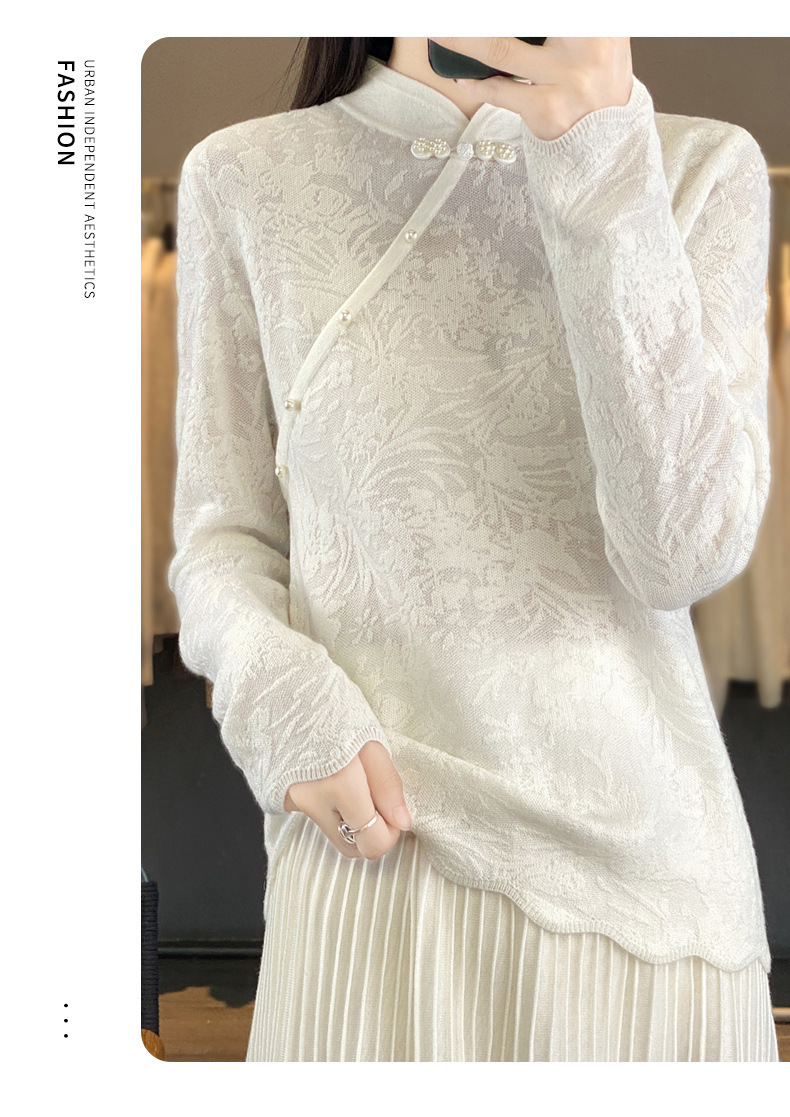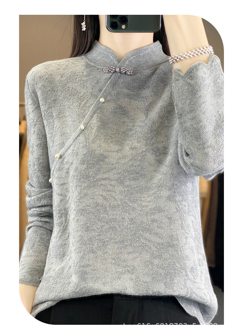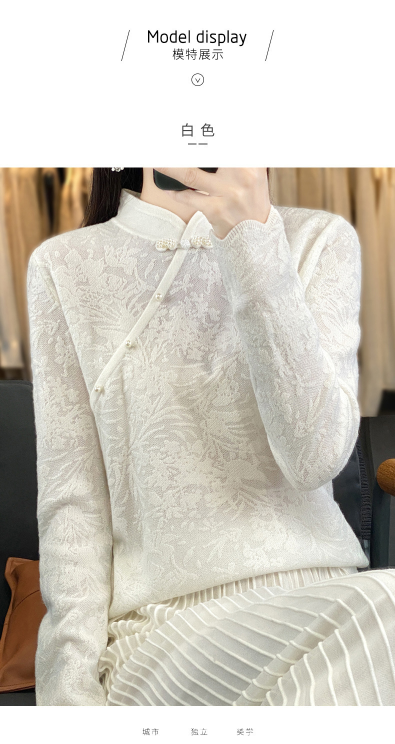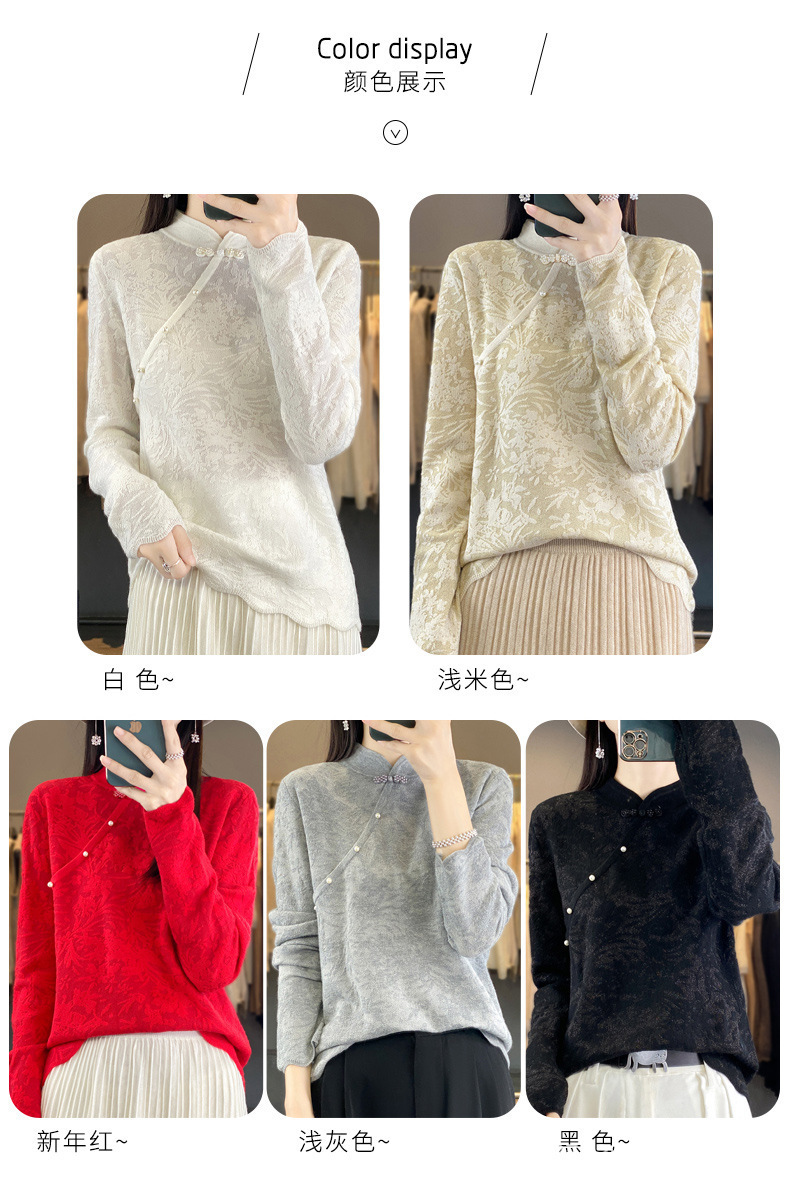 秋冬精纺羊毛衫纯色内搭毛衣蕾丝中式盘扣针织衫百搭QH-ZH2347