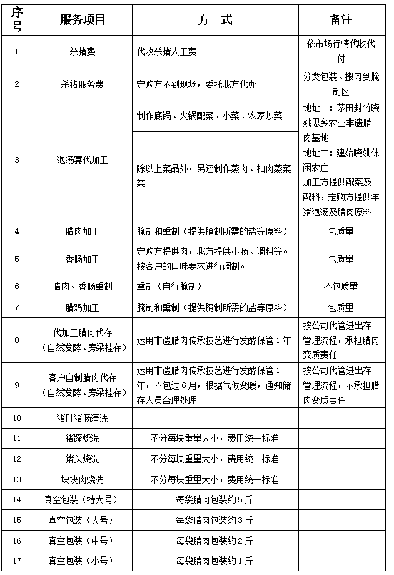 其它可选服务刨汤宴代加工腊肉加工 / 腊肉、香肠加工熏制腊肉代工/ 代存/ 烧洗/ 代发等
