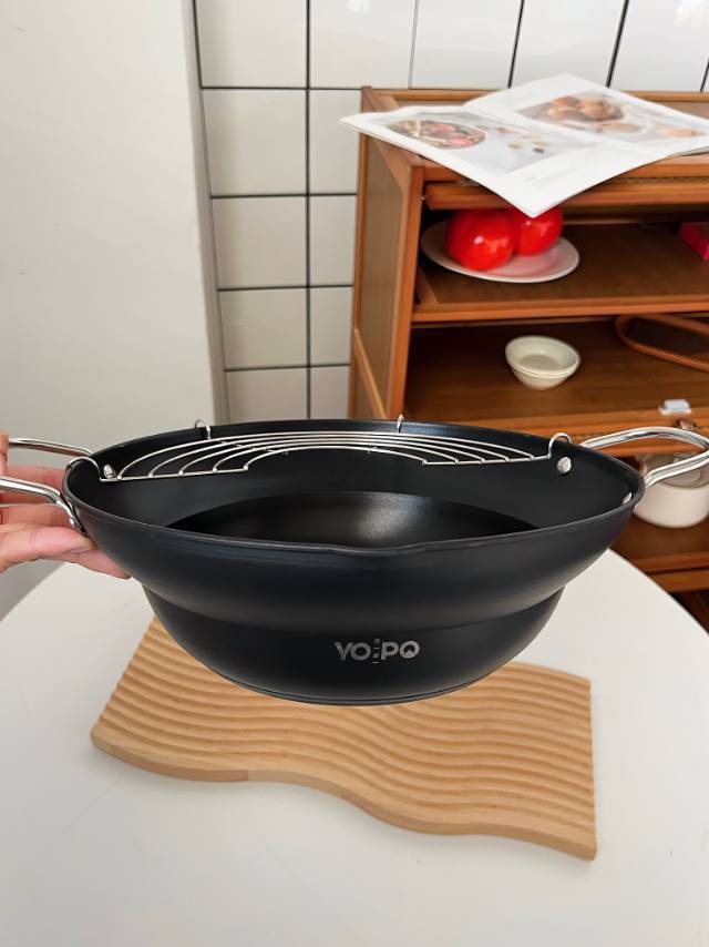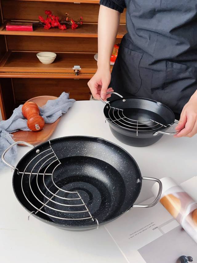 ✅ 不粘保护层 可拆卸沥油架 ✅ 鸟嘴导流口 不锈钢手柄 ✅ 双柳钉固定 一体成型锅底
