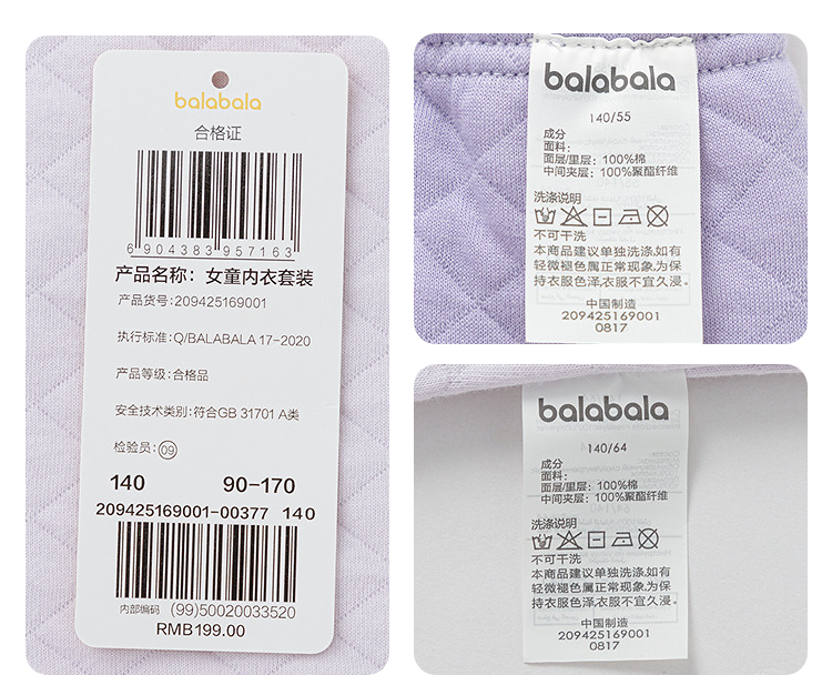 巴拉巴拉balaOne女童内衣套装儿童2件套新款童装2025秋冬夹棉保暖
