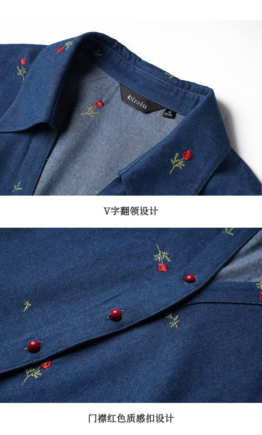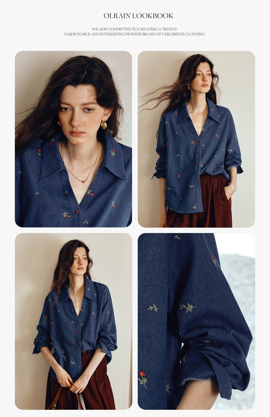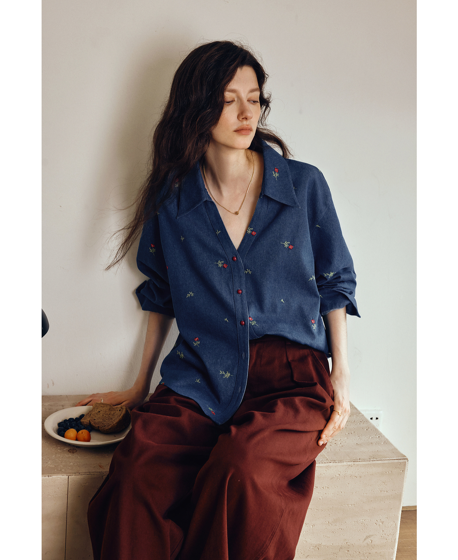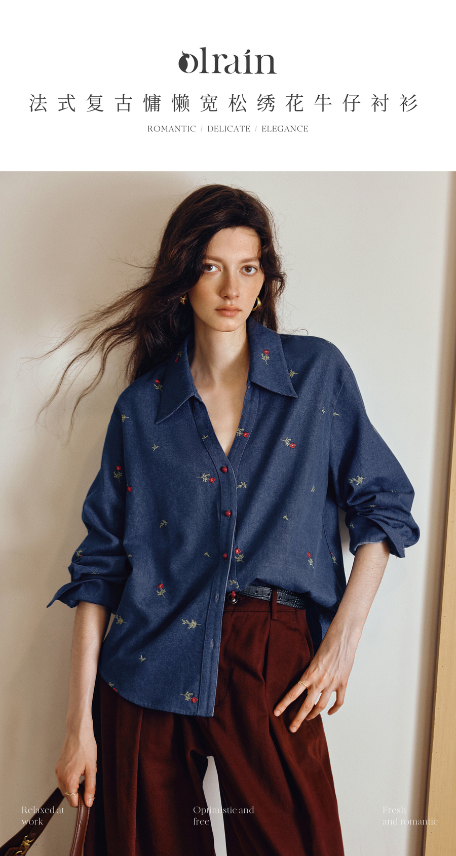 OLrain欧芮儿2025新款女秋季法式复古慵懒宽松绣花牛仔长袖衬衫