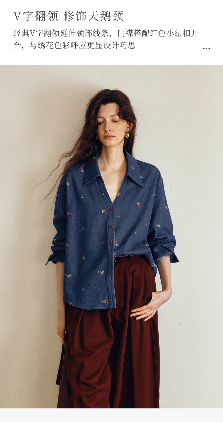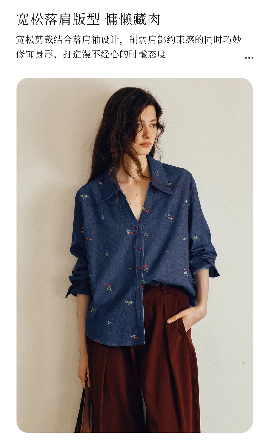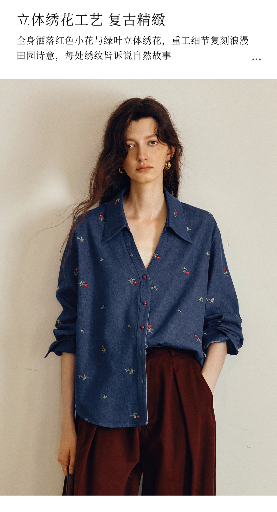 OLrain欧芮儿2025新款女秋季法式复古慵懒宽松绣花牛仔长袖衬衫
