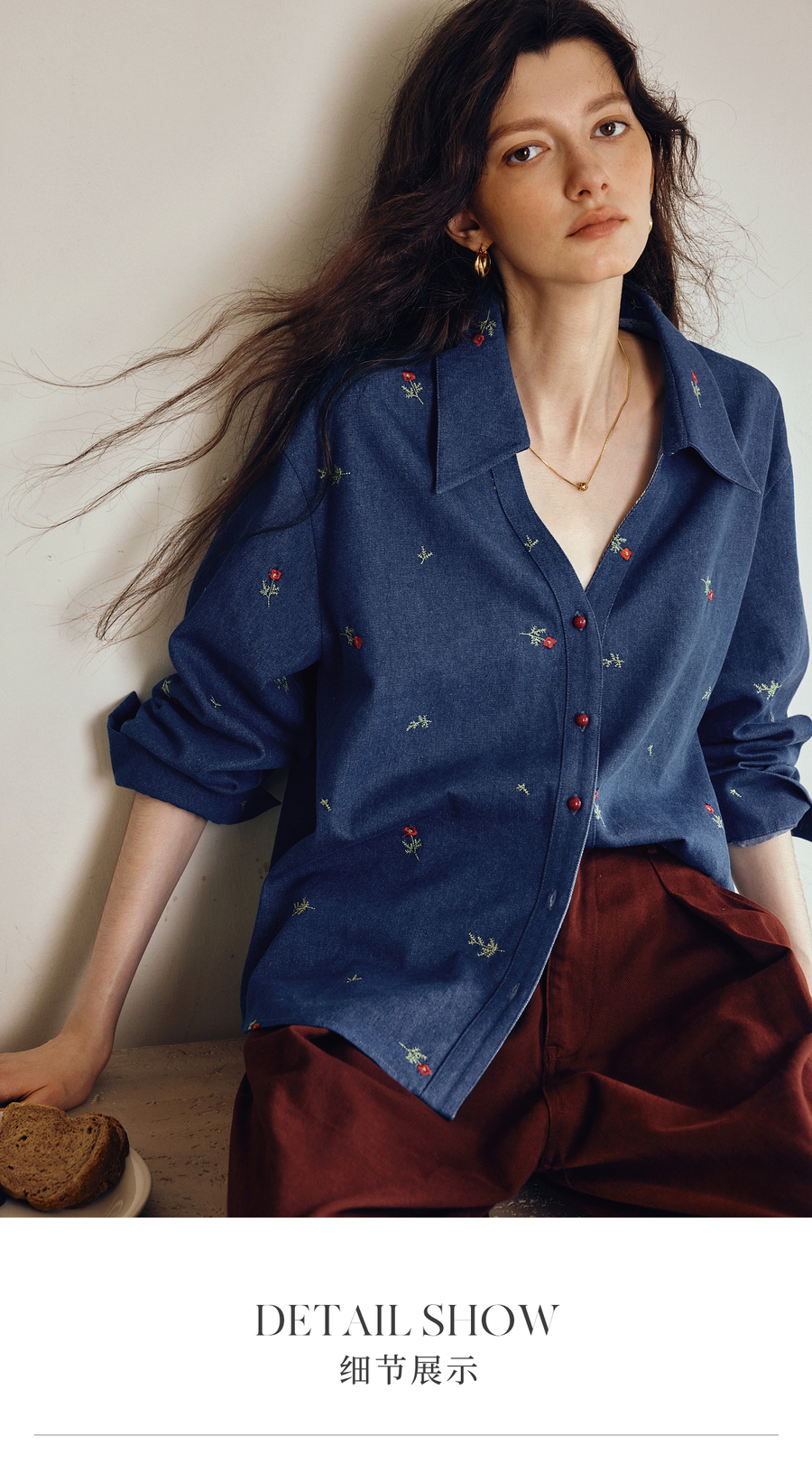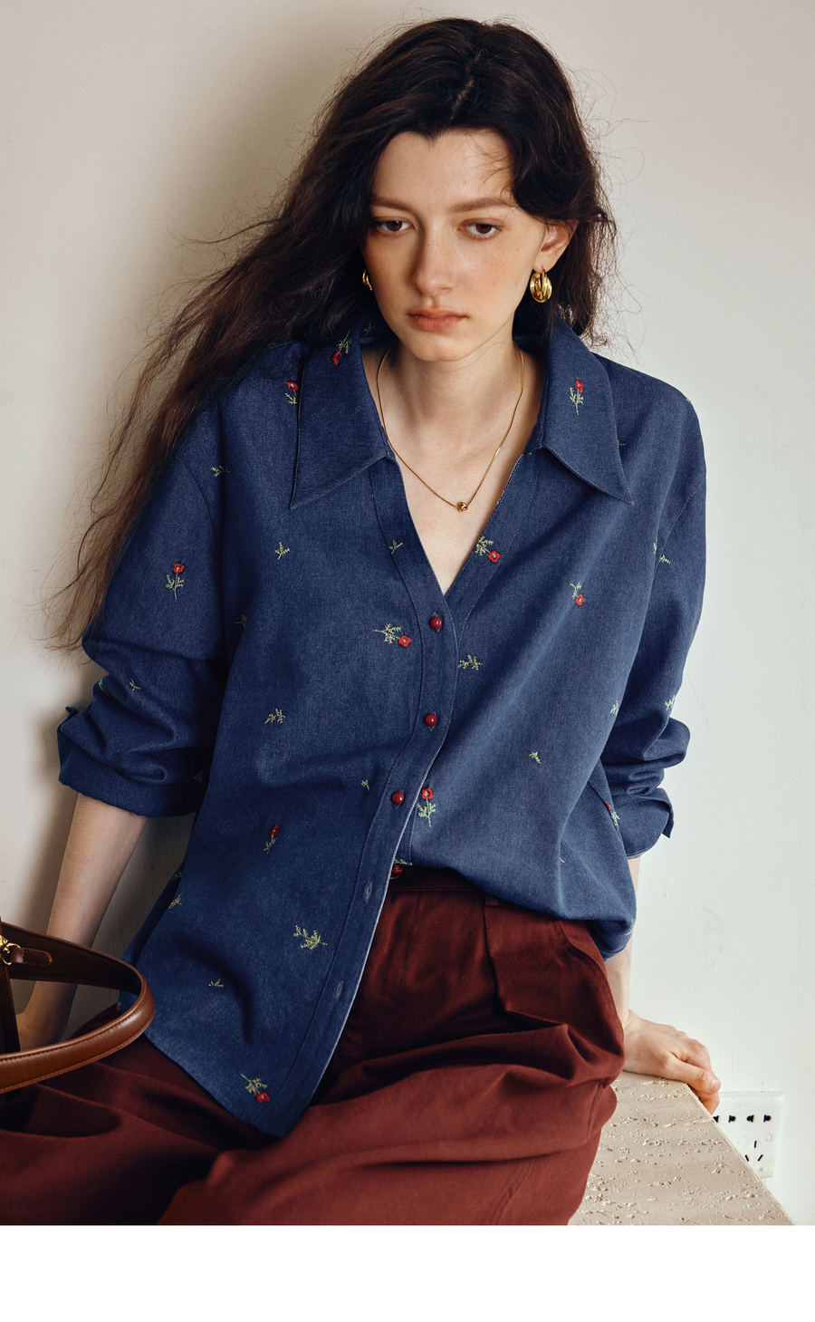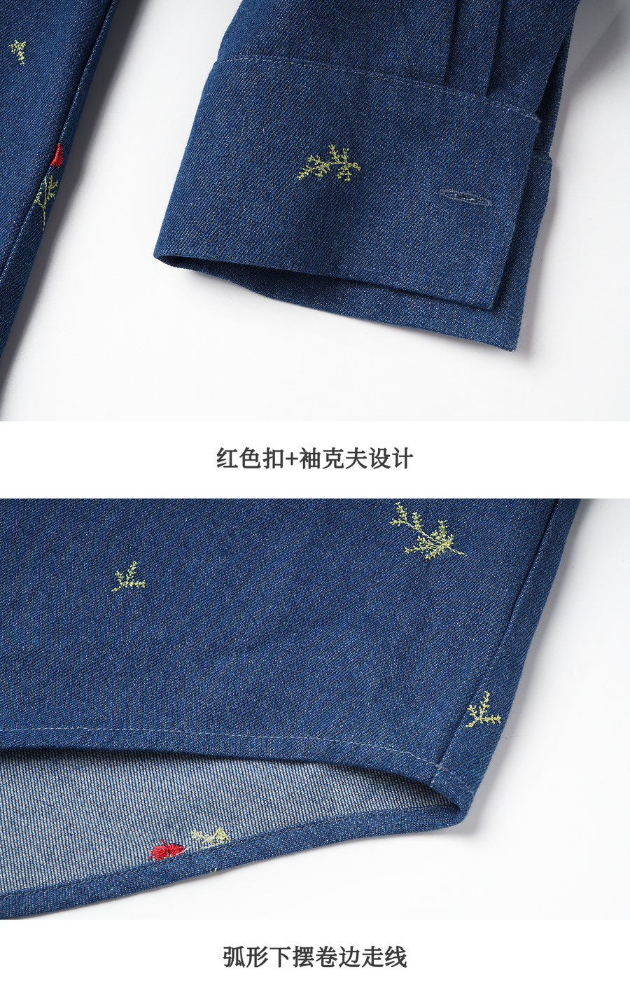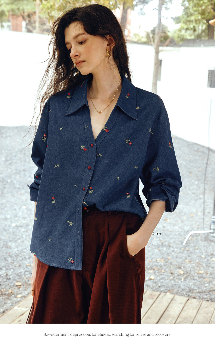 OLrain欧芮儿2025新款女秋季法式复古慵懒宽松绣花牛仔长袖衬衫