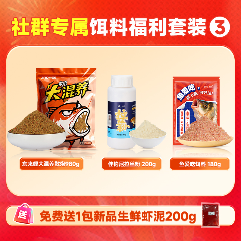 佳钓尼新品饵料套装(东来鲤大混养+拉丝粉+鱼爱吃饵料)下单任意套装 加赠:新品鲜虾虾泥 200克一包