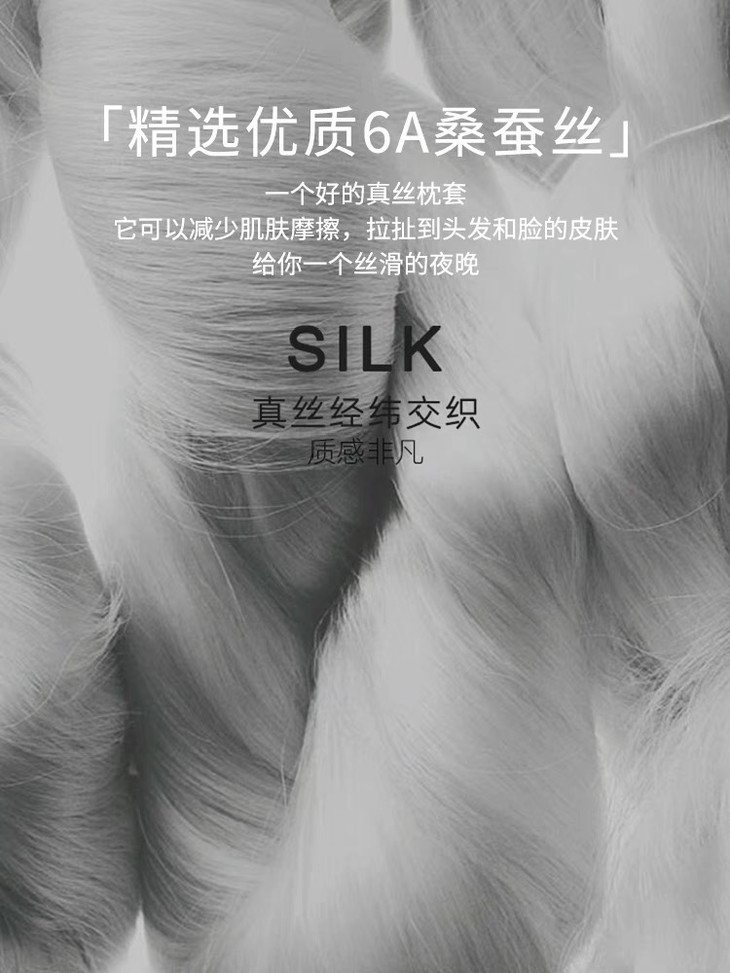 桑蚕丝富含18种氨基酸、蛋白质 天然蚕丝蛋白,滋养肌肤、发丝 摩擦系数仅为7.4% 面部不留压痕 丝滑细润,延缓细纹加深 与人体角质、胶原结构相近 帮助缓解皮肤过敏 好多用过的姐妹说换成真丝枕套后, 头发都不毛躁了、顺滑、 不容易油了、掉发少了!!!!