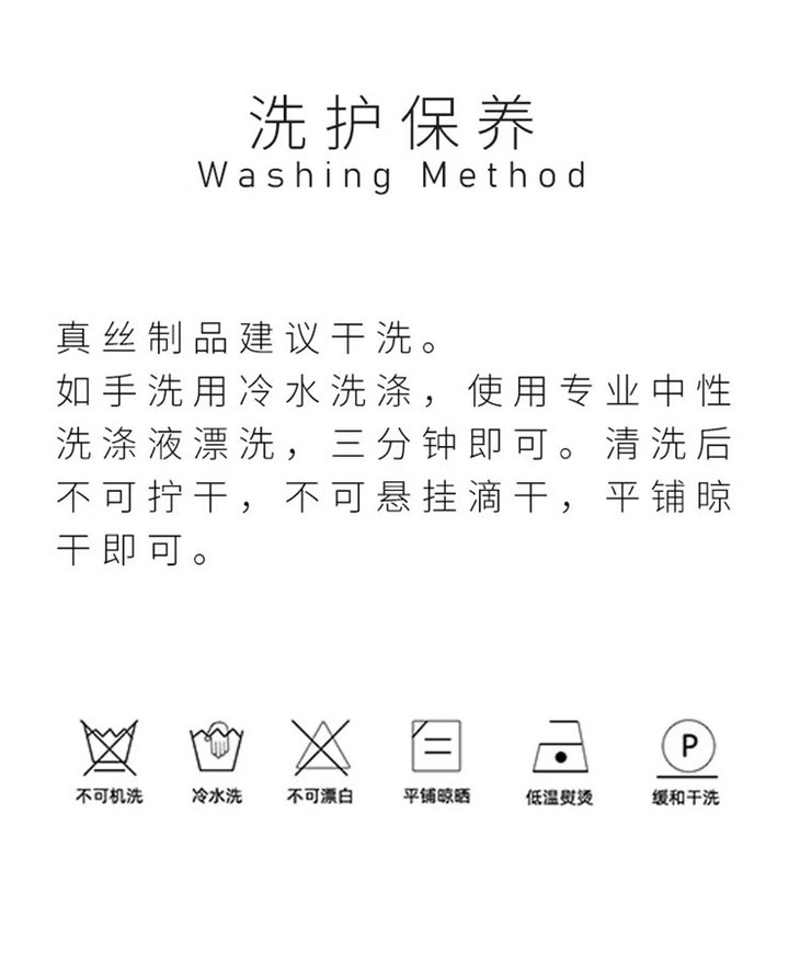 ⚠【使用注意】 1、真丝属于蛋白性娇嫩保健纤维织造而成,最好是手洗!!洗涤不适宜在粗糙物品揉擦和用洗衣机洗涤。 2、应浸入冷水中5-10分钟用专用真丝洗涤剂合成低泡洗衣粉或者中性肥皂轻柔搓洗净即可。 3、丝绸易起皱,洗后熨烫很有必要,但是注意:熨烫时,不宜高温、不宜直接熨烫。必须在上面加盖一层湿布,适宜的温度还能使晾干后粗硬的手感变得柔软如初,但温度超过130℃后会导致泛黄。 4、熨烫时切忌喷水,以防产生水迹痕影响美观。