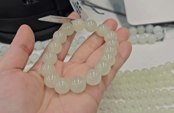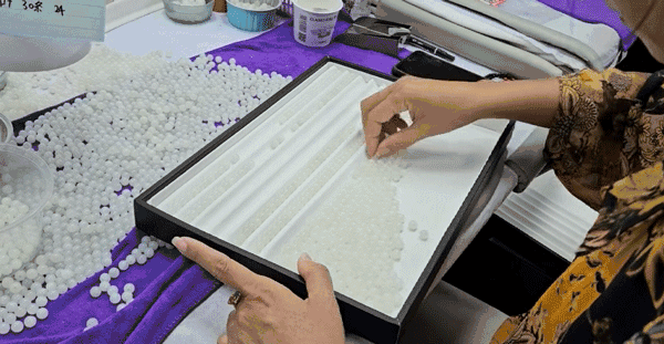 ▲哪怕是6mm的小玉珠也做到颗颗人工挑选,这些都是从事玉石行业多年的熟练挑选师傅。