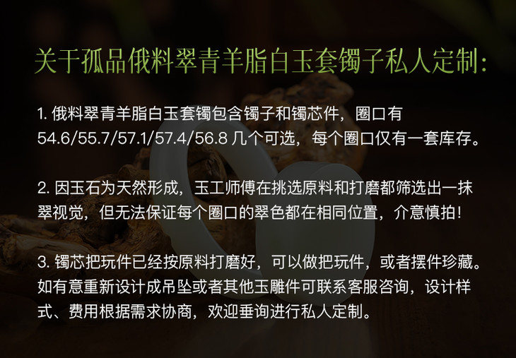 圈口54.6、55.7、57.1、57.4、56.8五只孤品镯,每个圈口仅有一个库存,但因飘翠料为自然天成,无法保证飘翠的位置和翠色大小面积,如有兴趣可垂询。