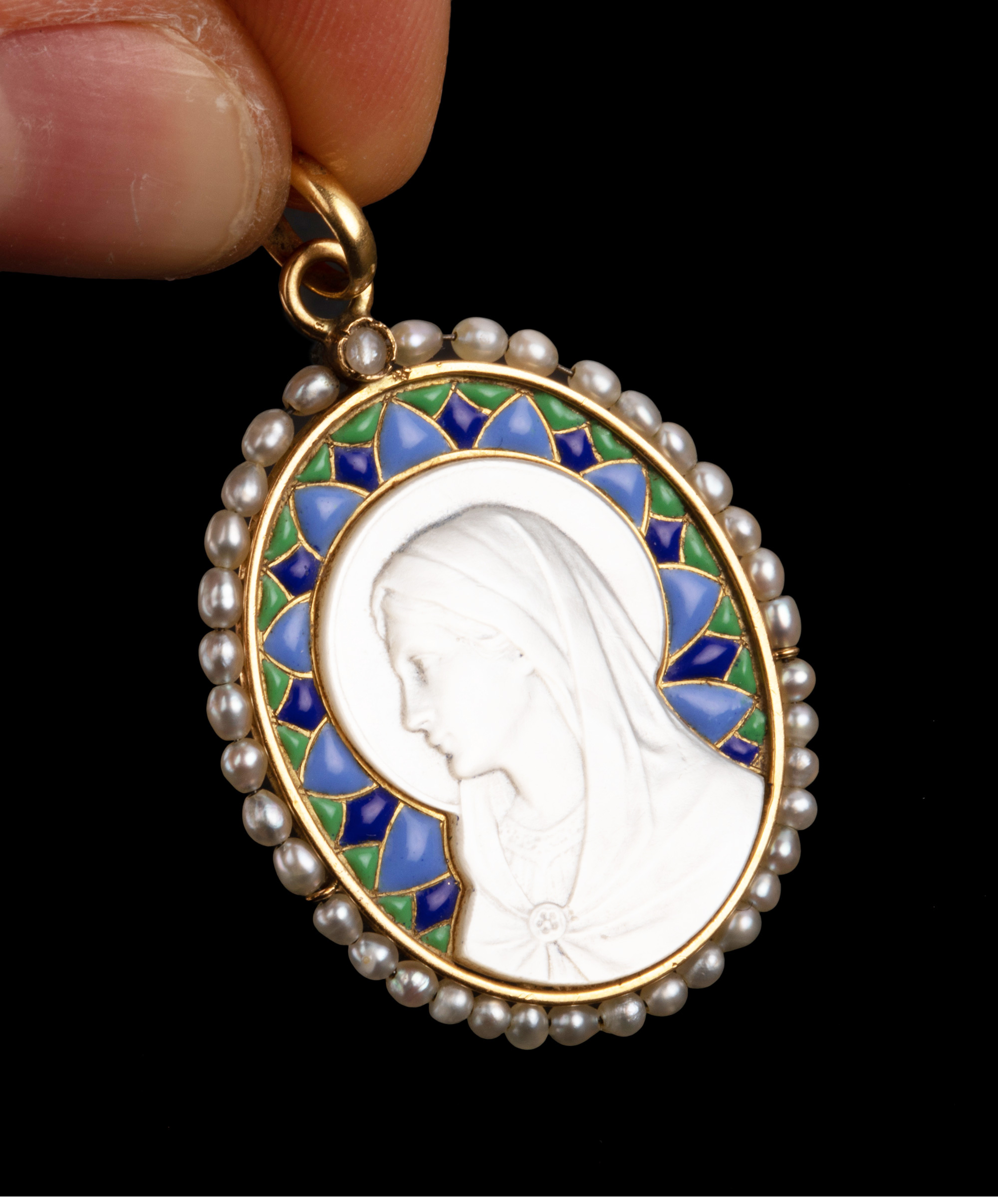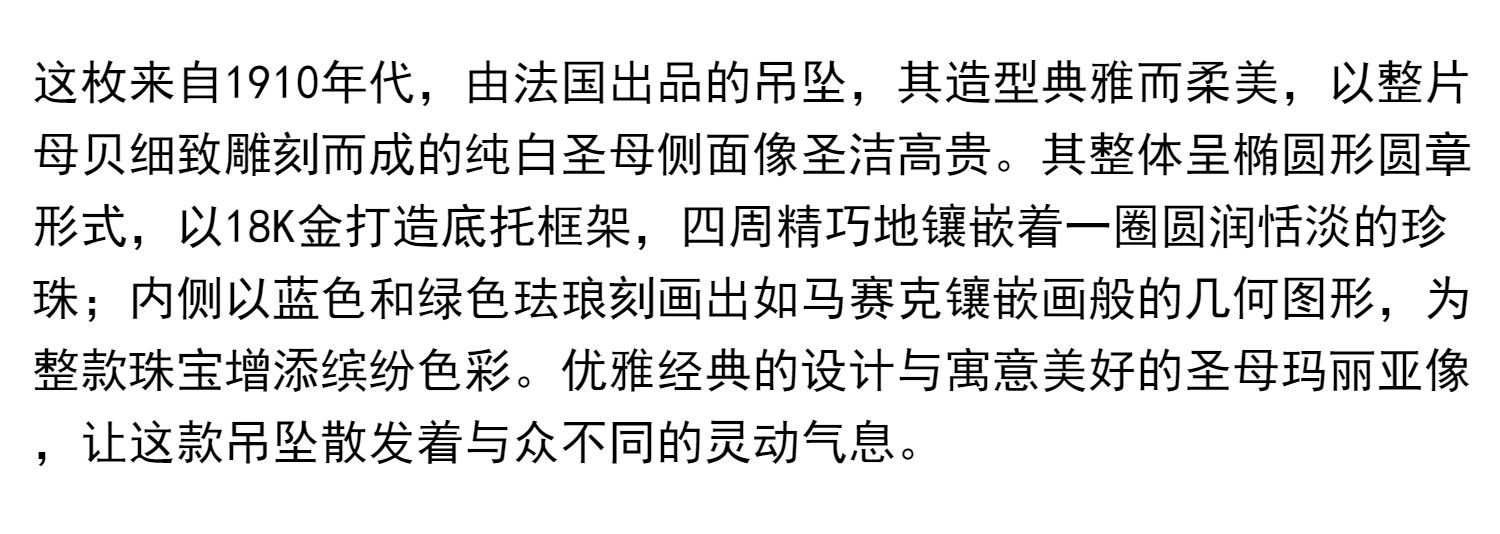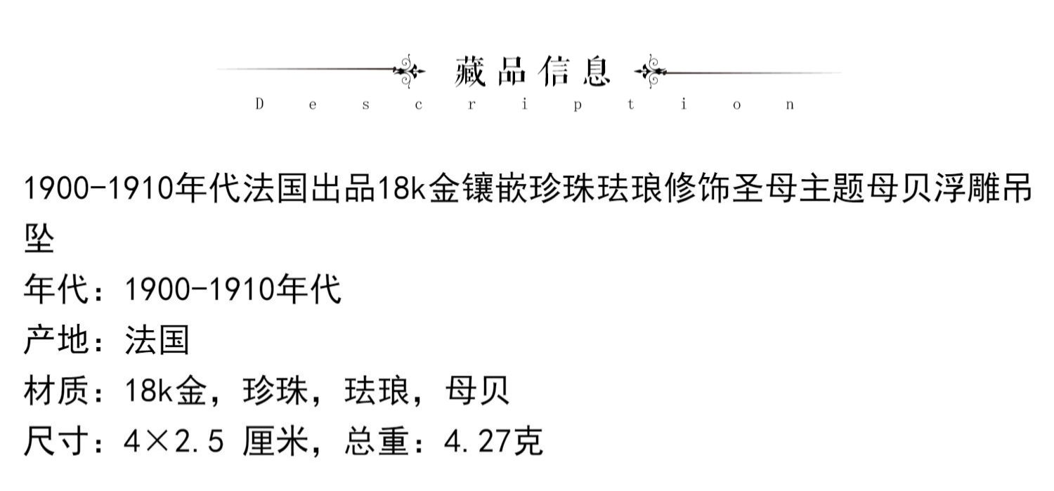 独角鹿西洋古董珠宝18k金镶嵌珍珠珐琅修饰圣母主题母贝浮雕吊坠