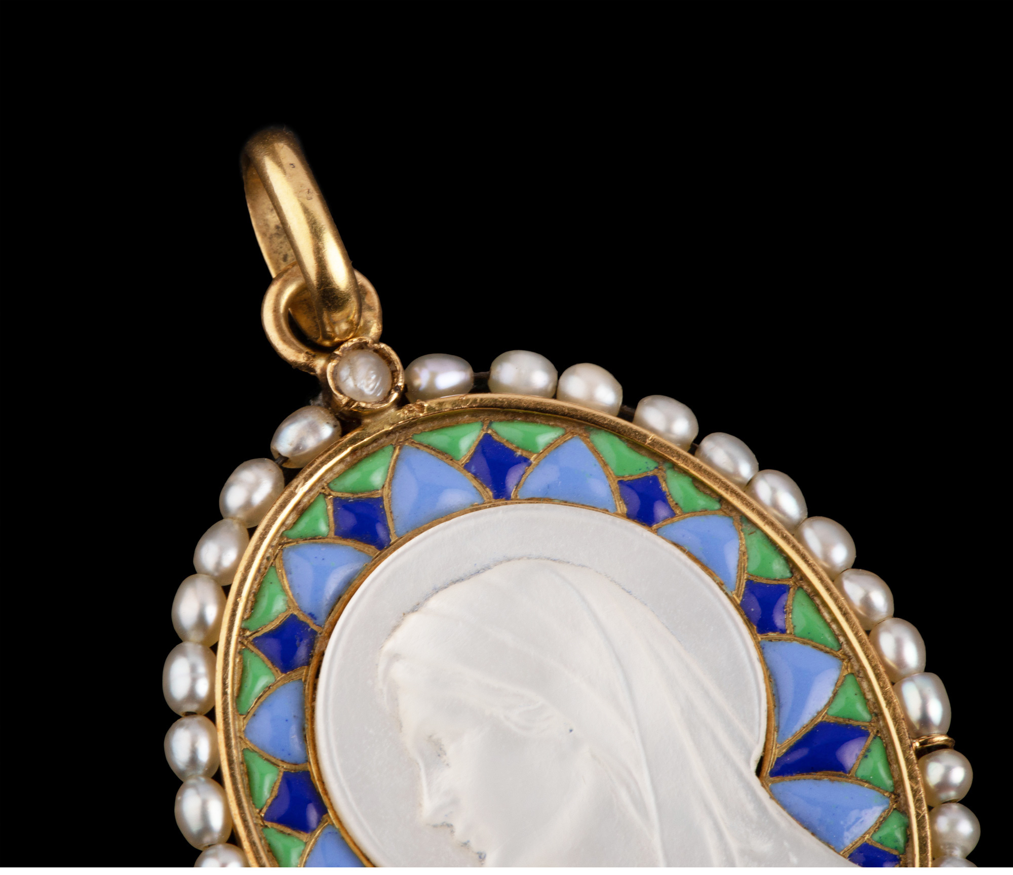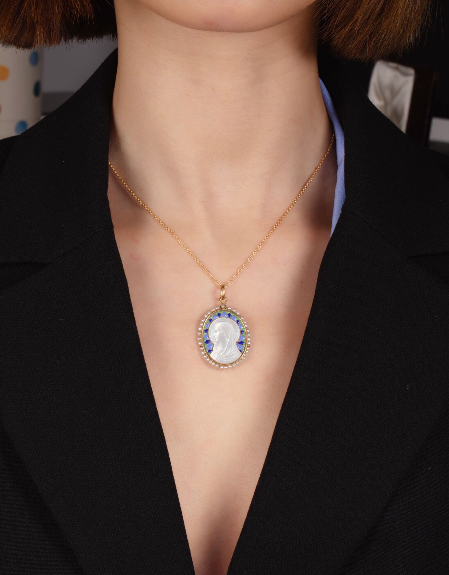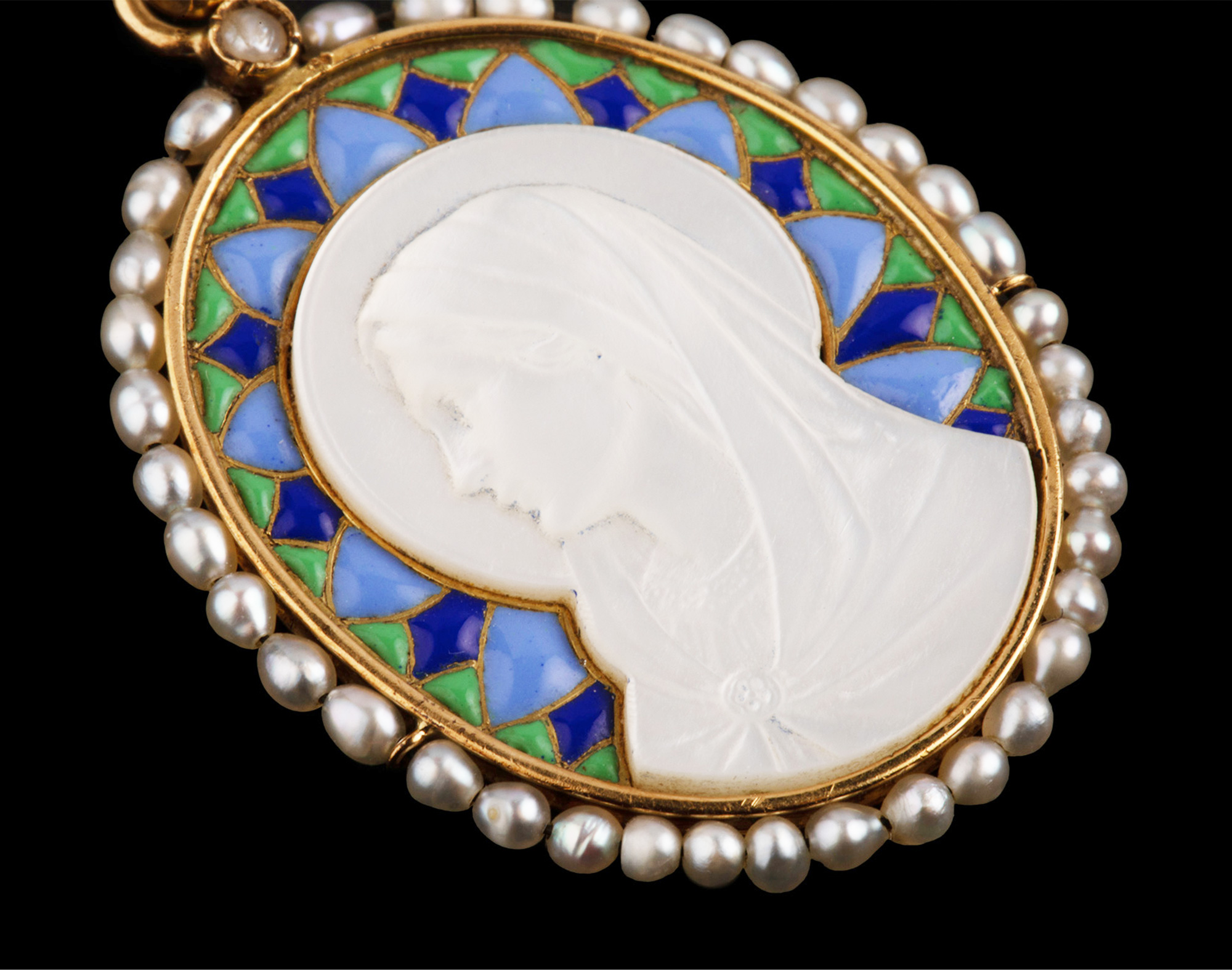 独角鹿西洋古董珠宝18k金镶嵌珍珠珐琅修饰圣母主题母贝浮雕吊坠