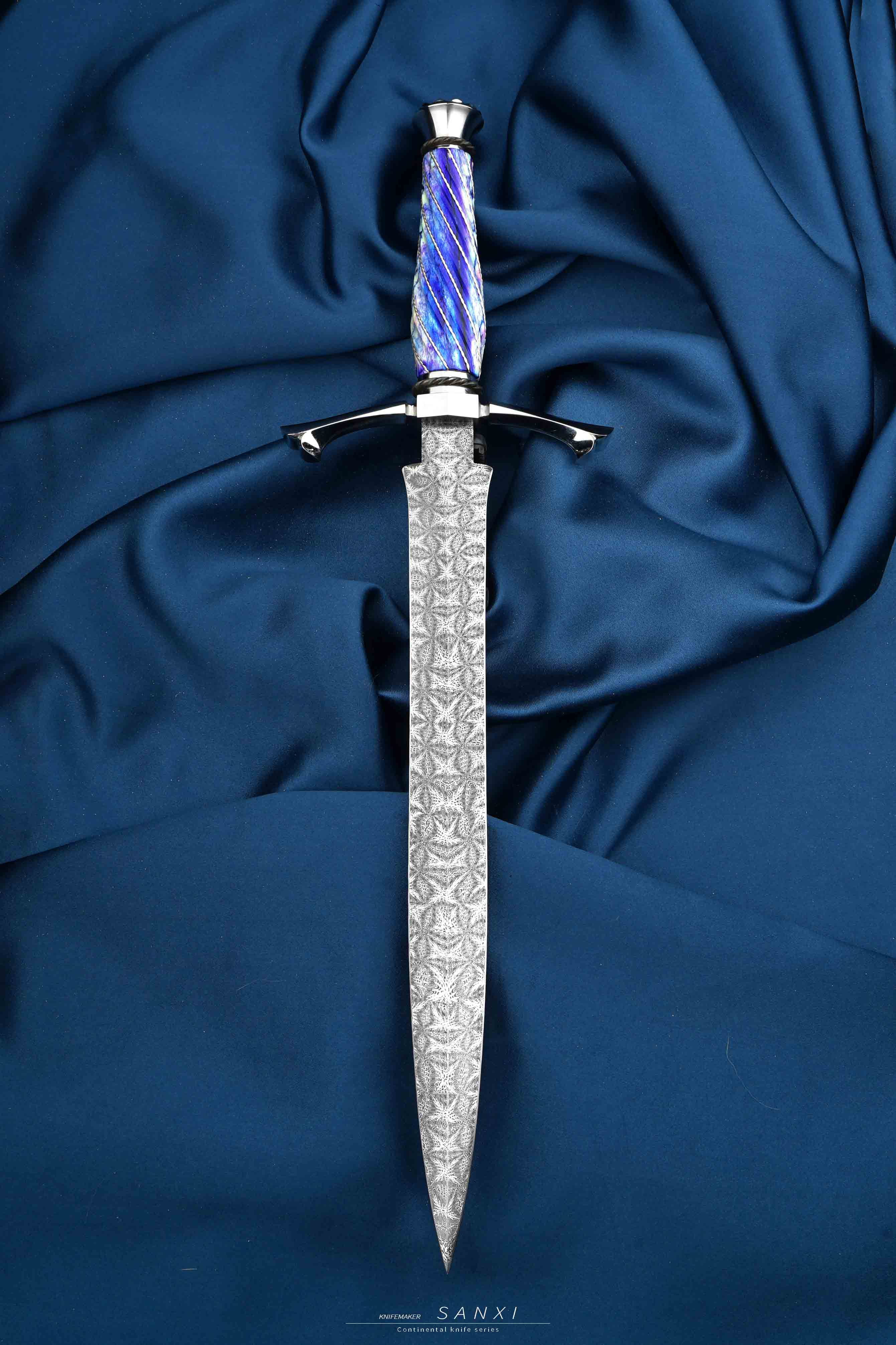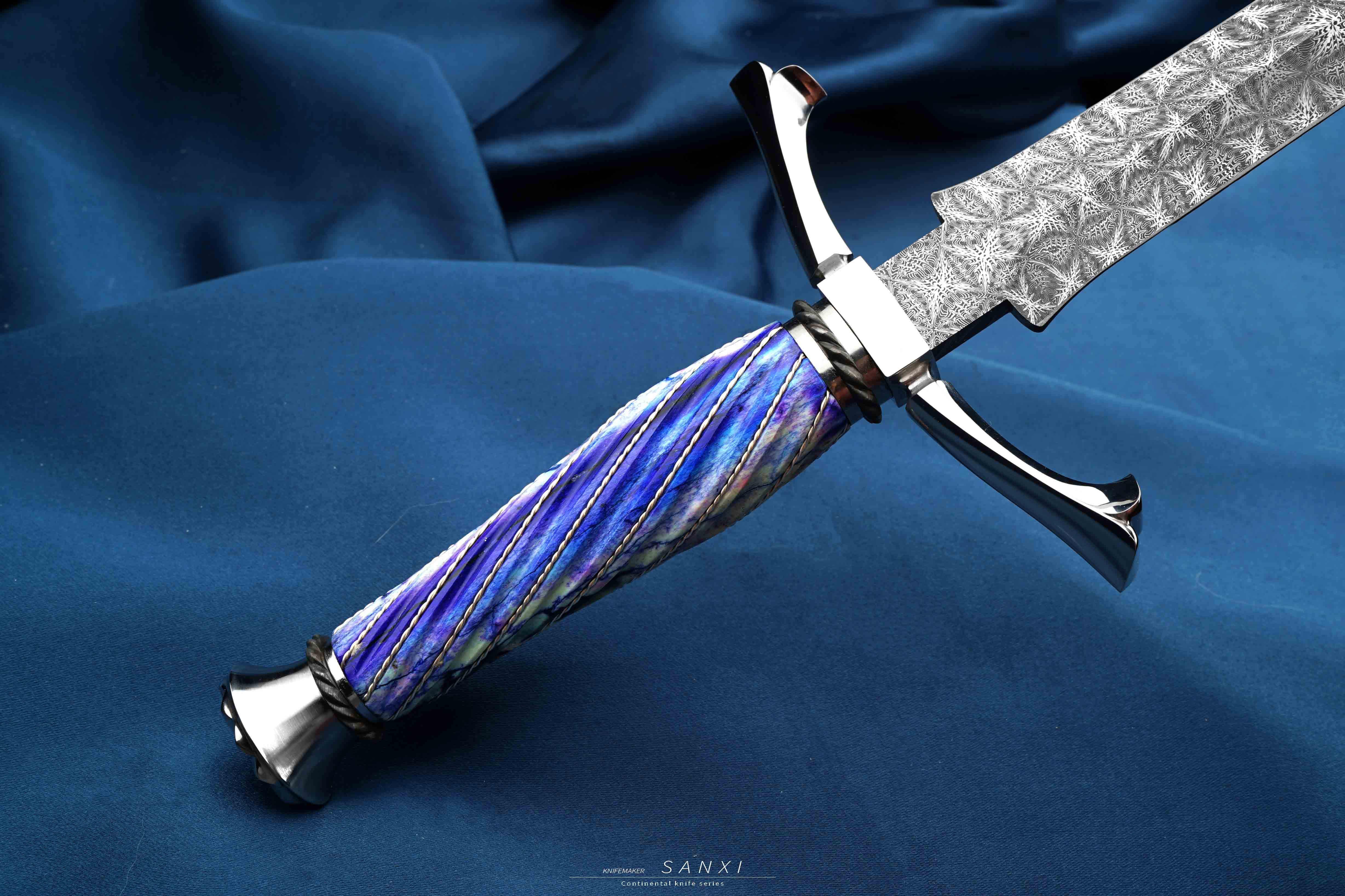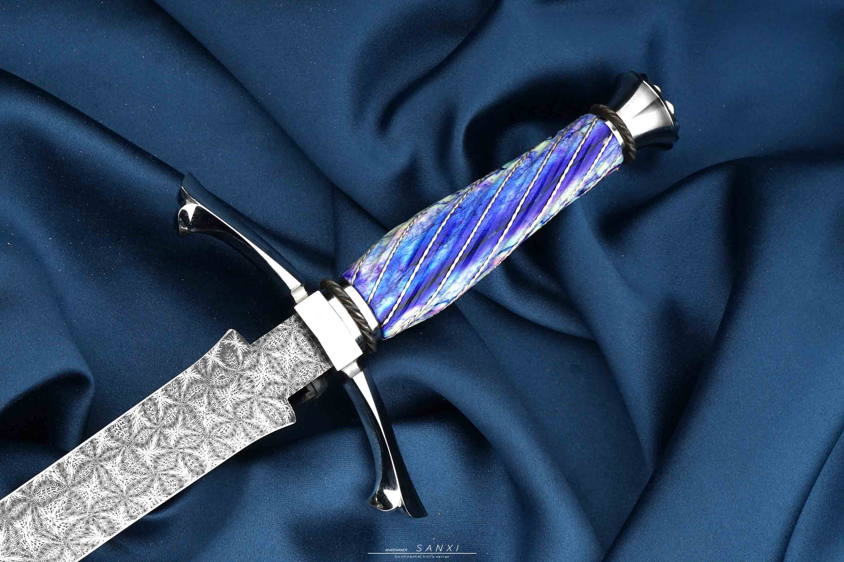 新做的高配大马短剑,西子师傅全手工制作,他做东西不需要机器,一把锉刀手工全搞定,四芒星大马+玉化螺旋猛犸柄