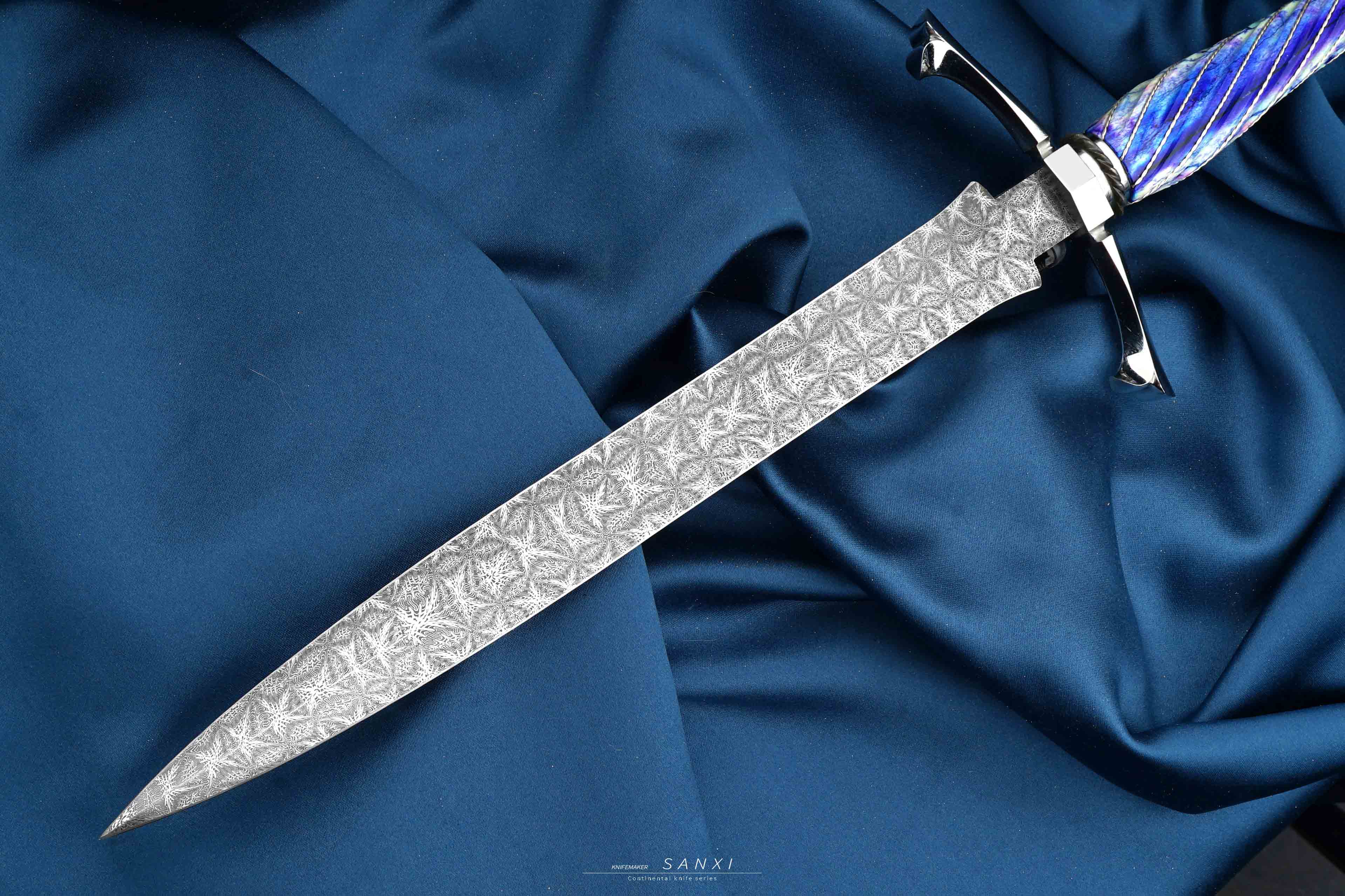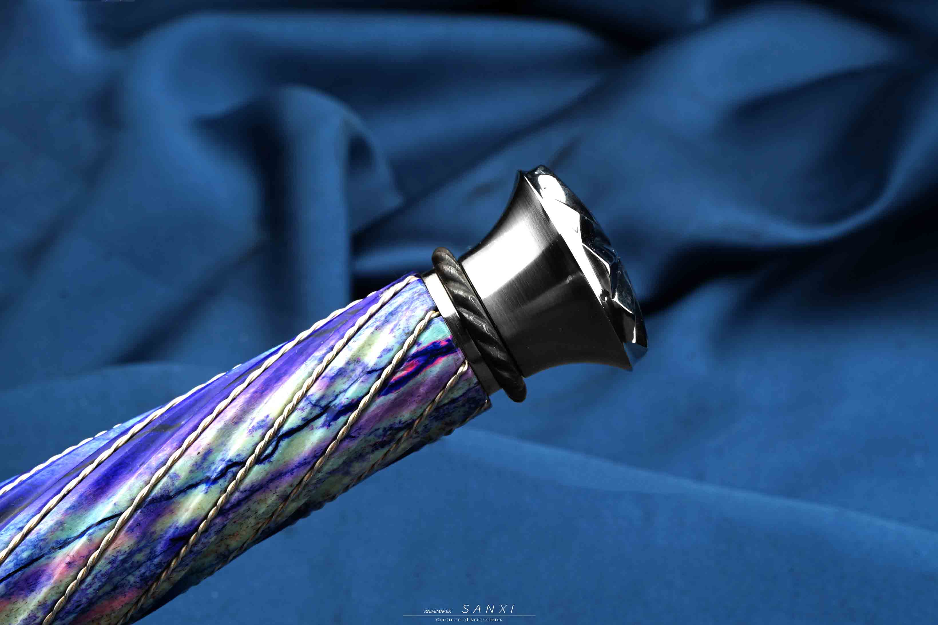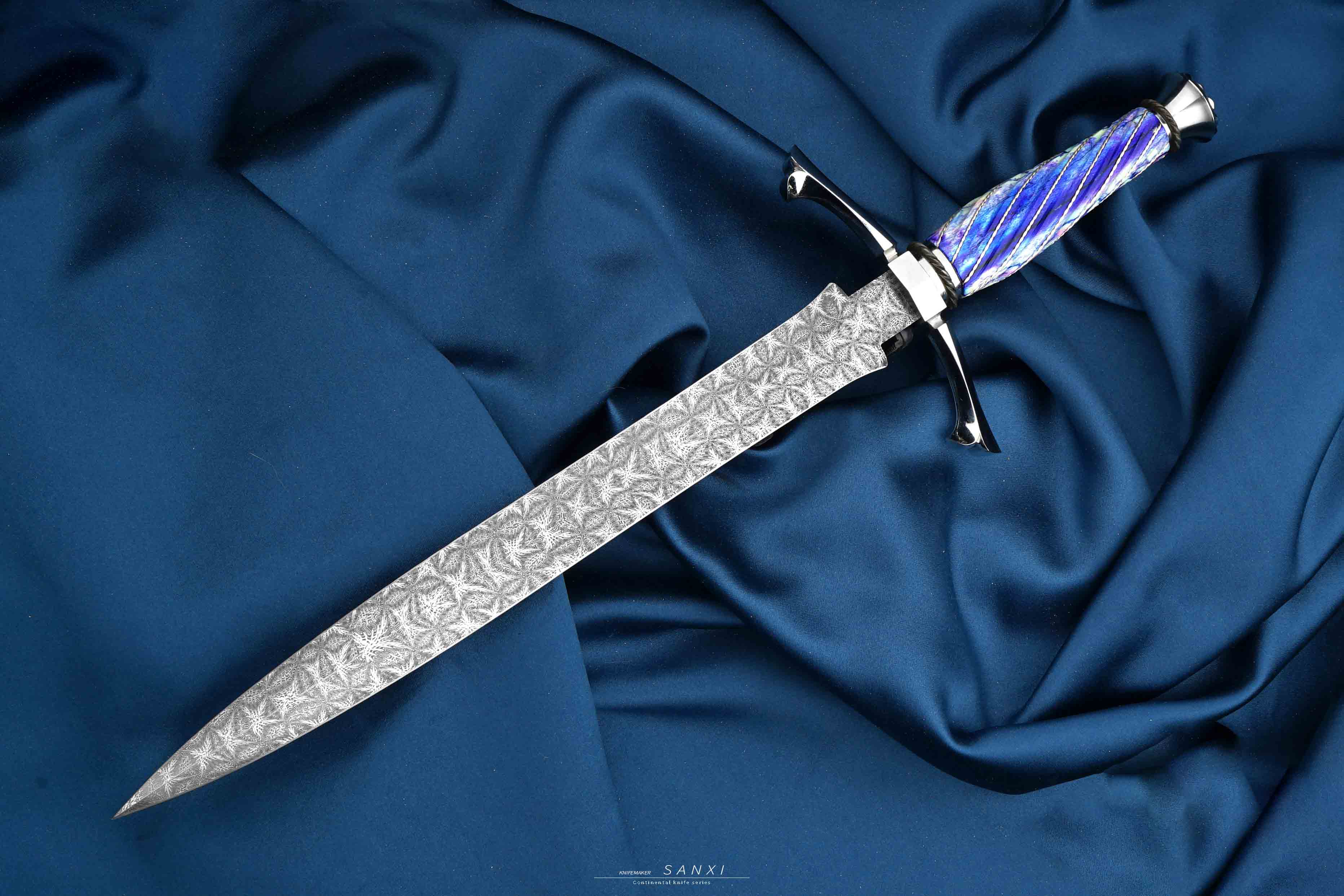 新做的高配大马短剑,西子师傅全手工制作,他做东西不需要机器,一把锉刀手工全搞定,四芒星大马+玉化螺旋猛犸柄
