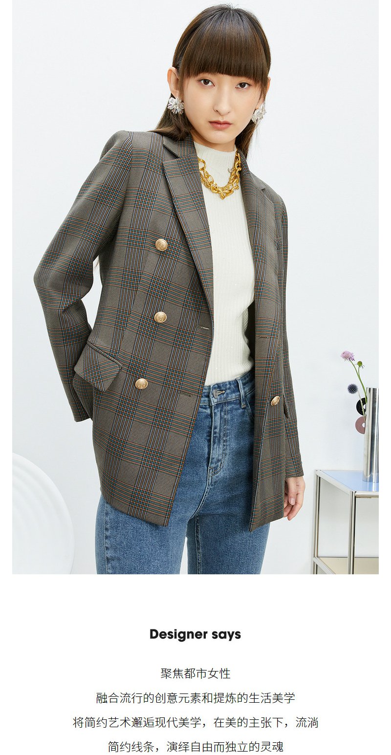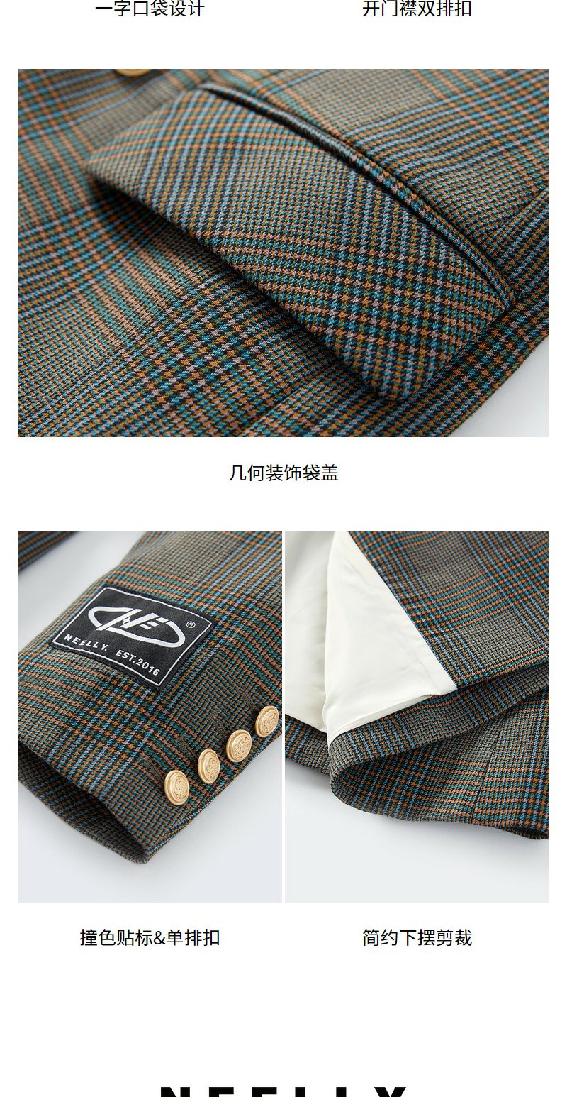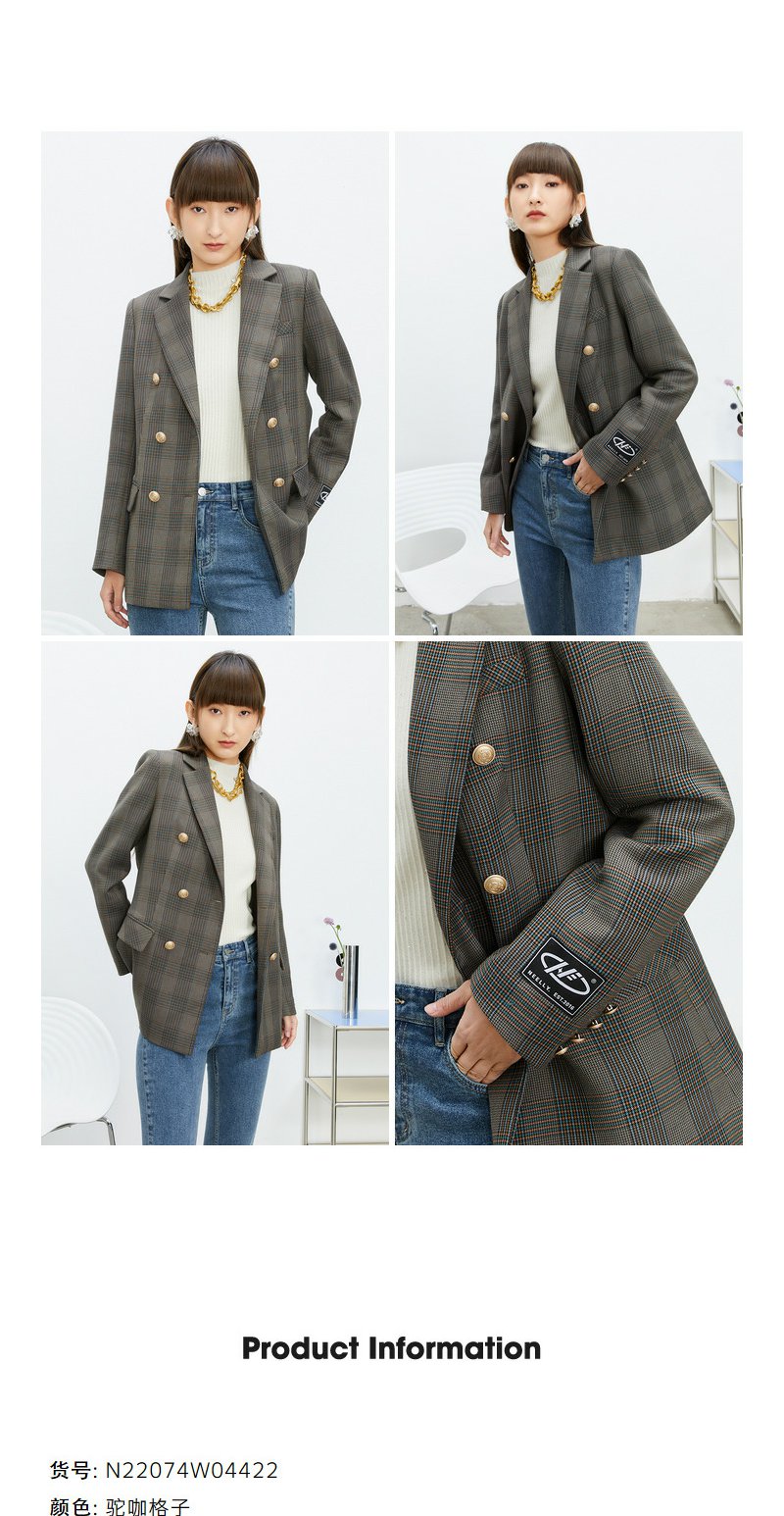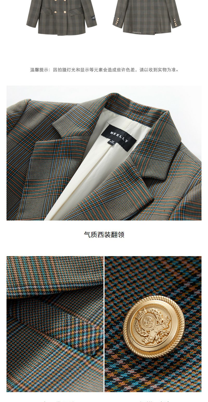 NEELLY纳俪商场同款休闲西装外套女双排扣格纹西服简约通勤外套春N22074W04422
