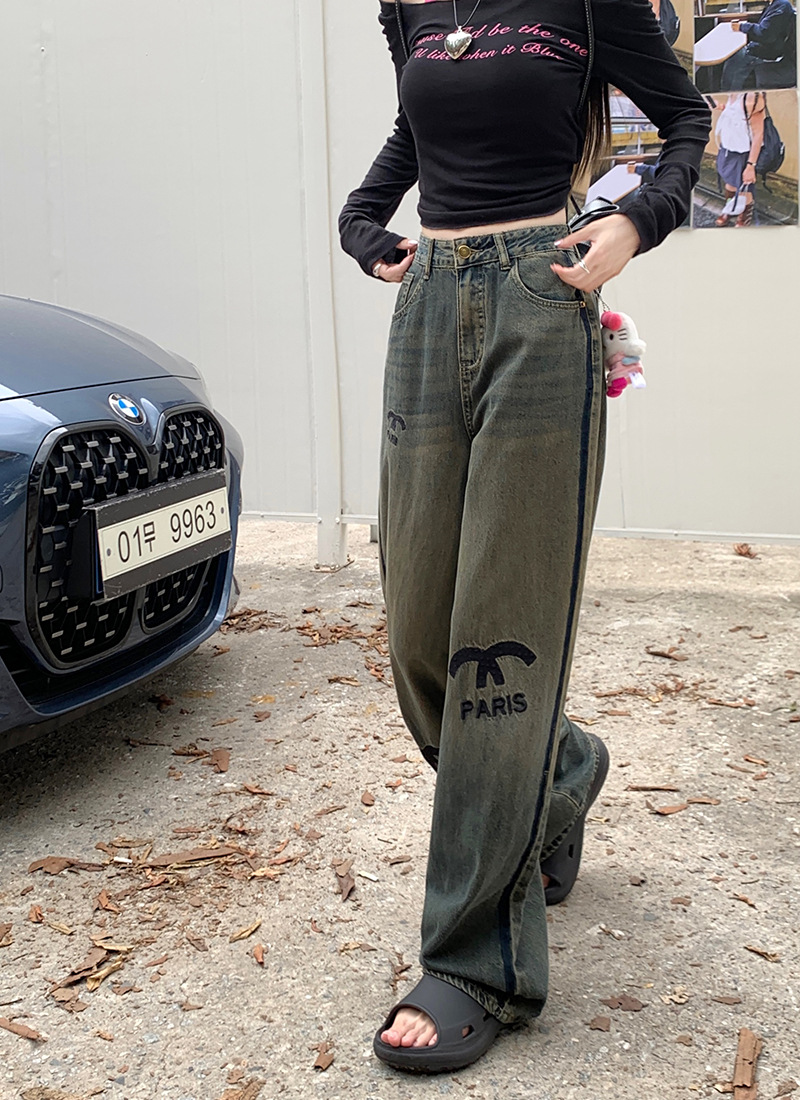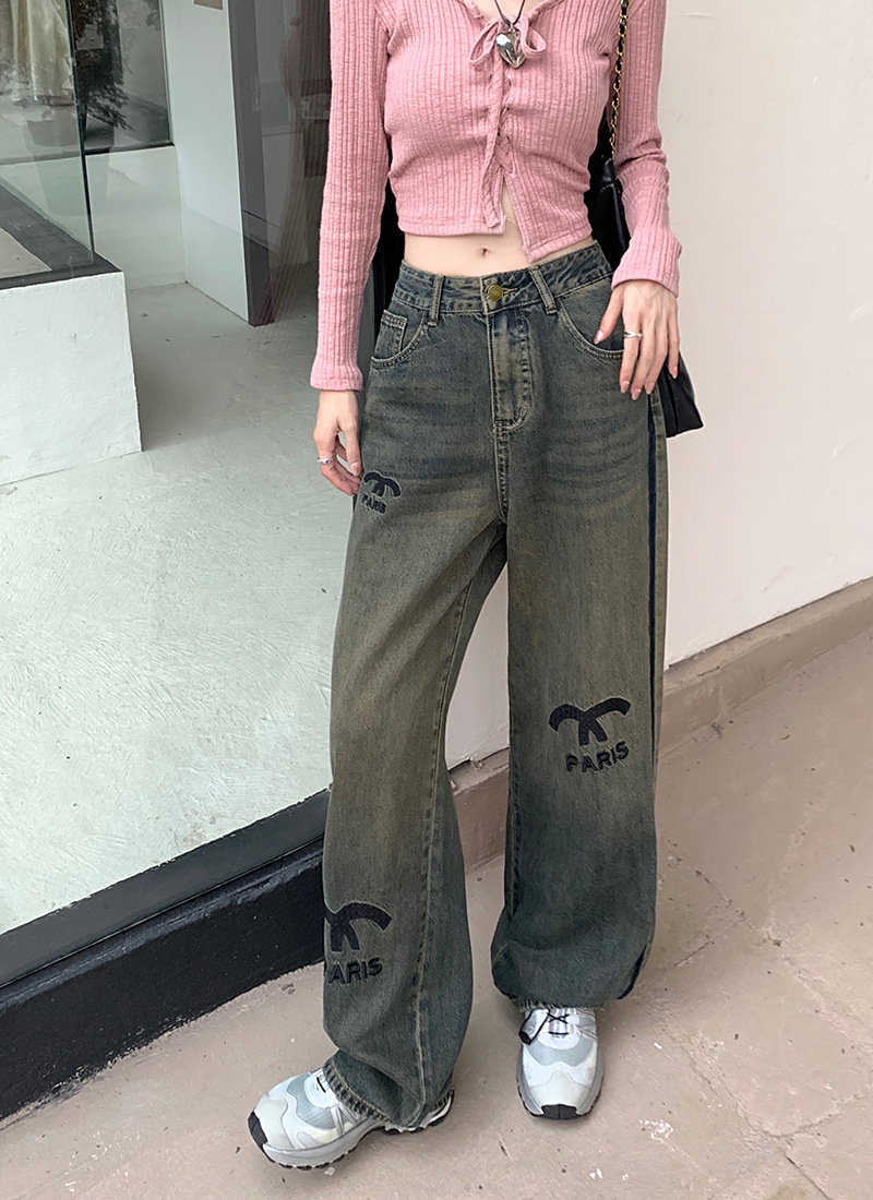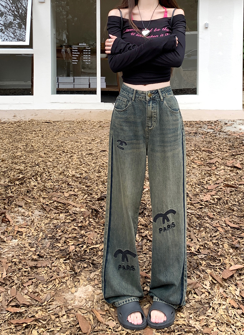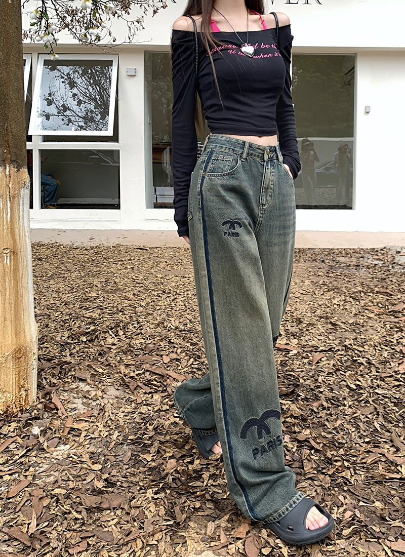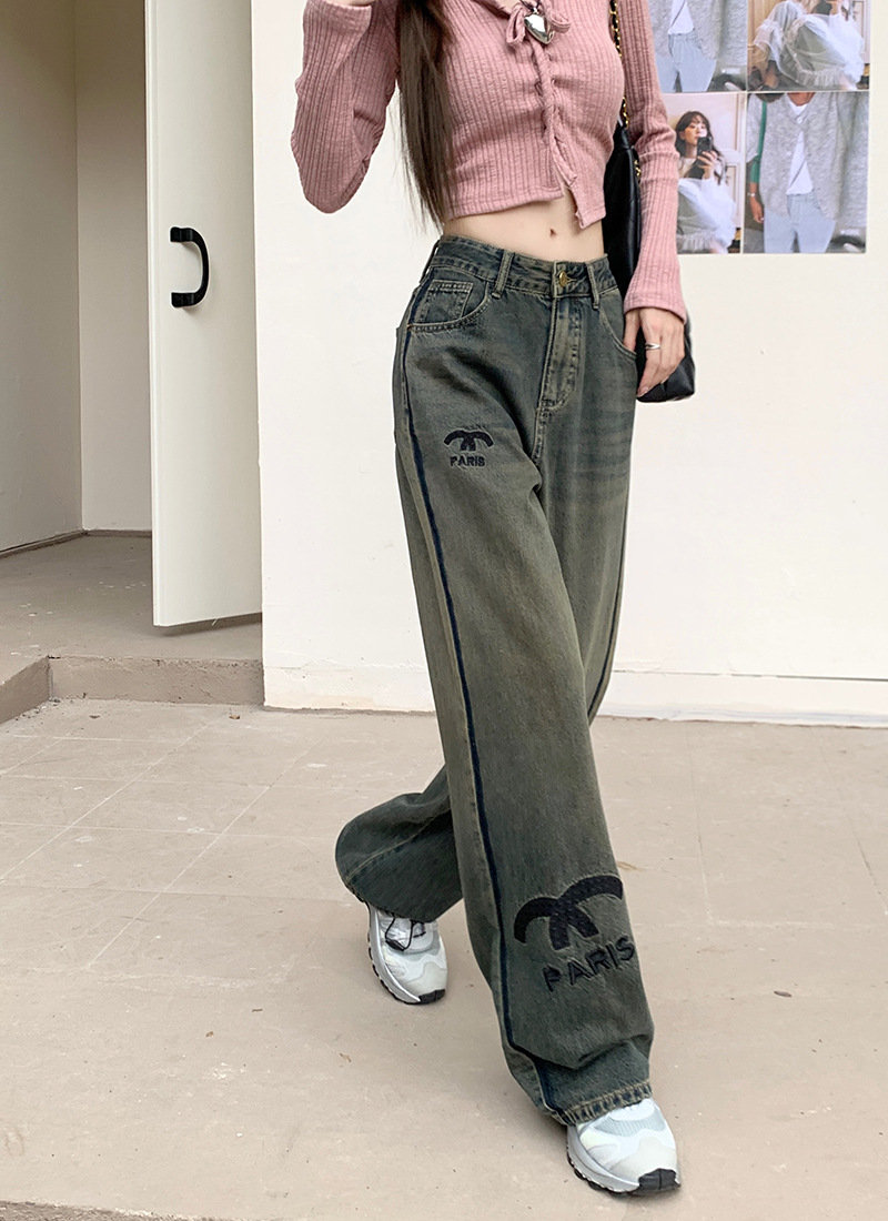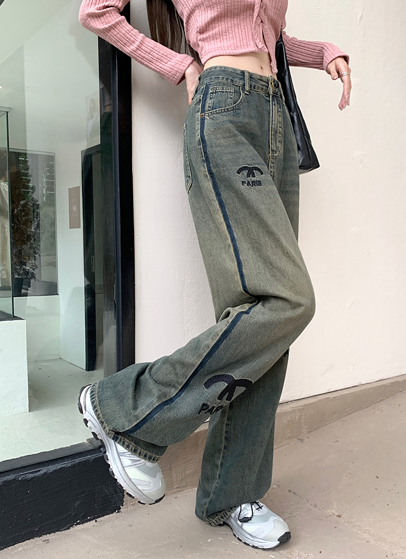 春秋季【新款宽松 字母刺绣复古牛仔裤女】牛仔长裤 高腰遮胯 直筒裤