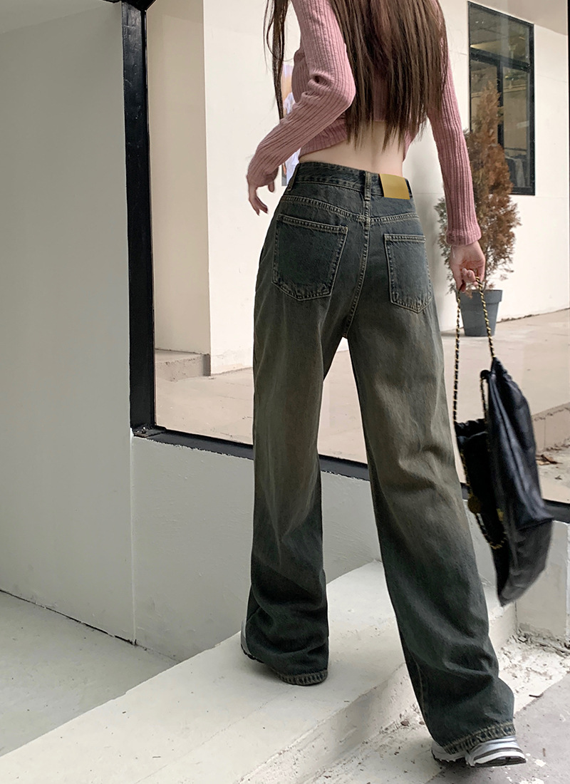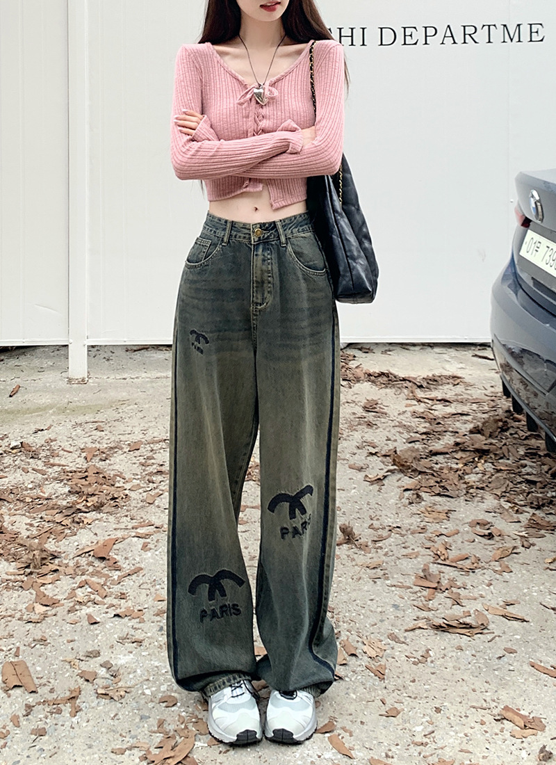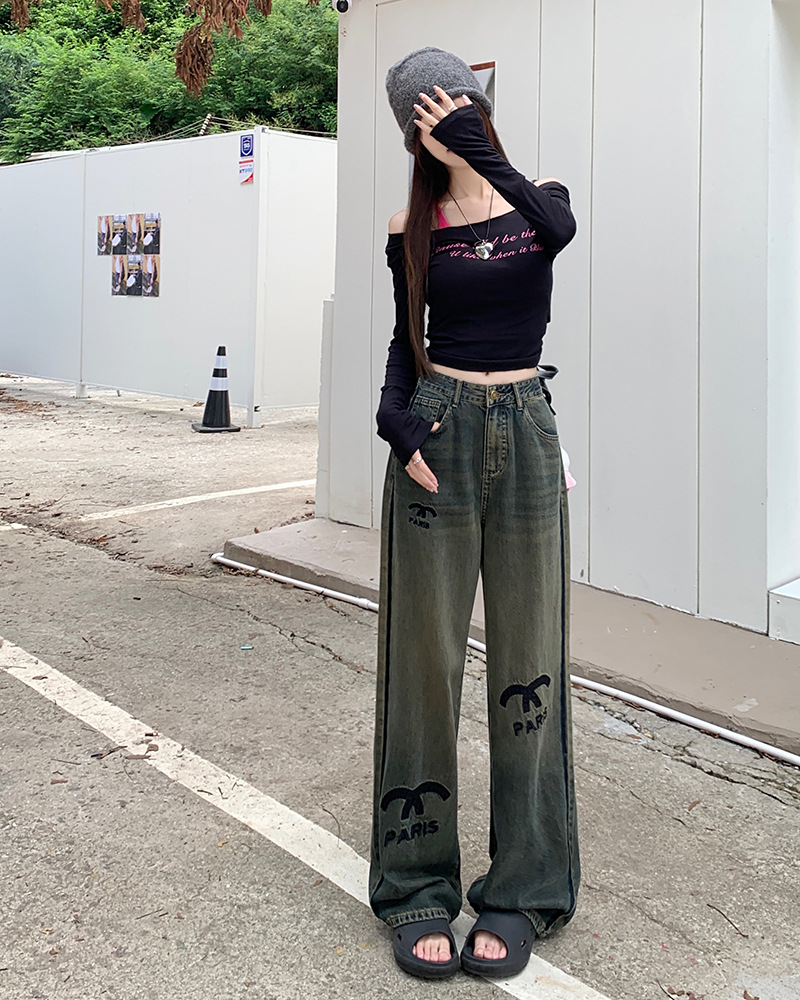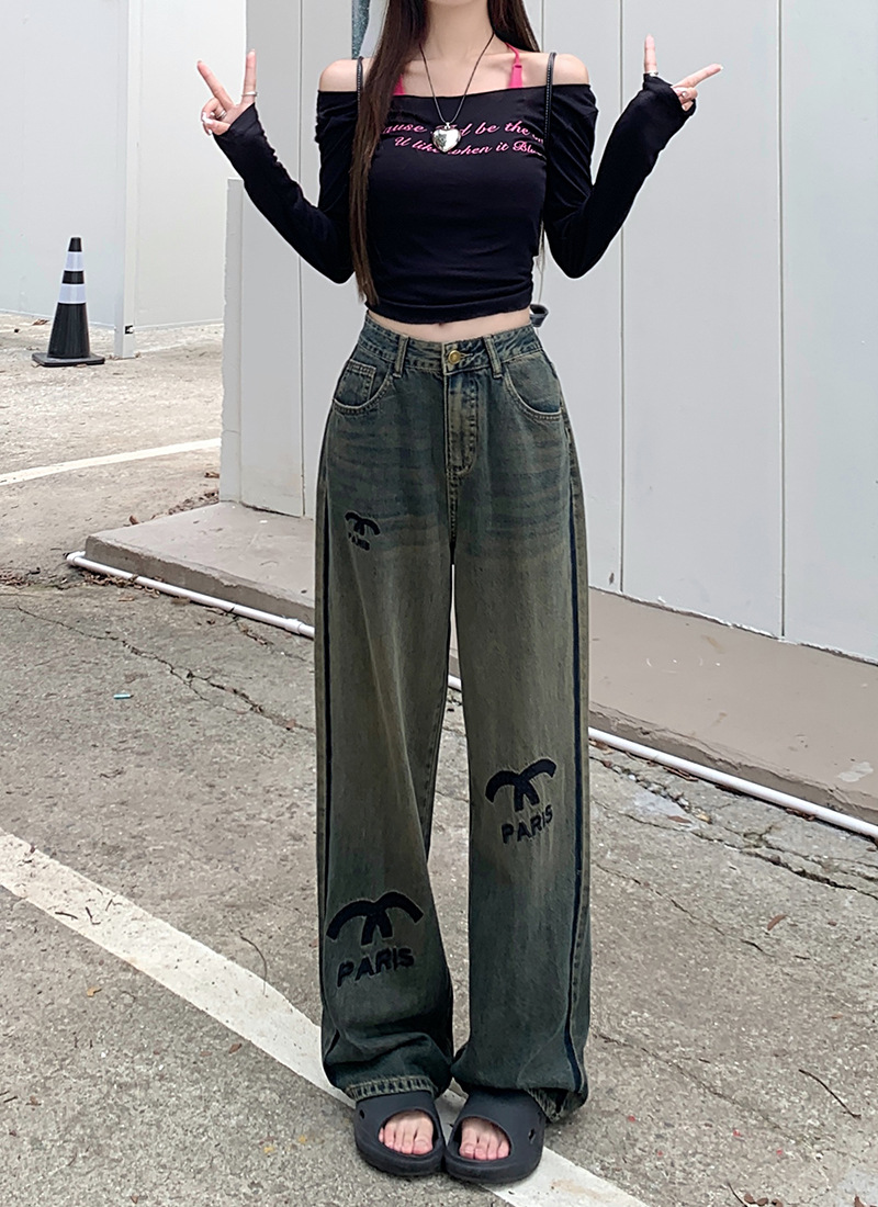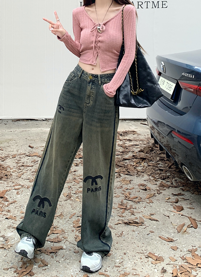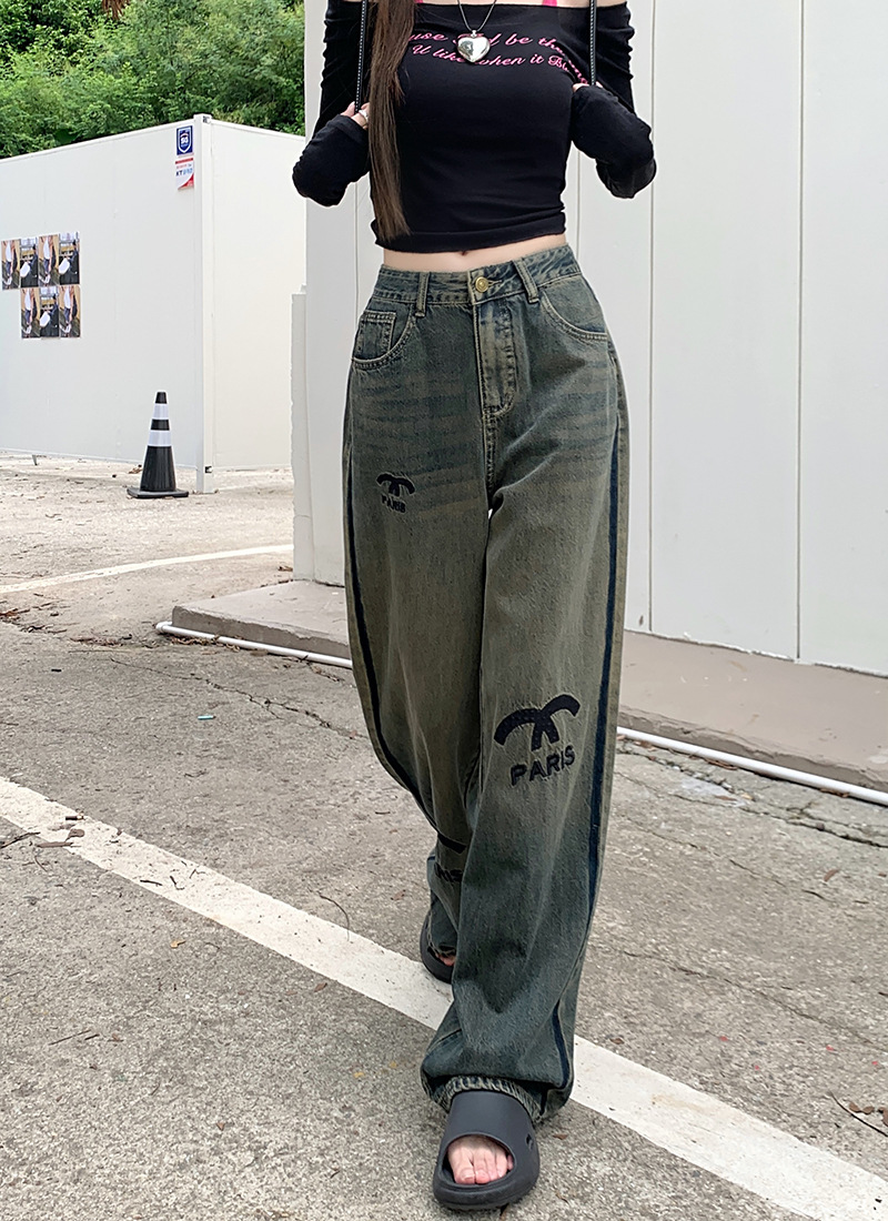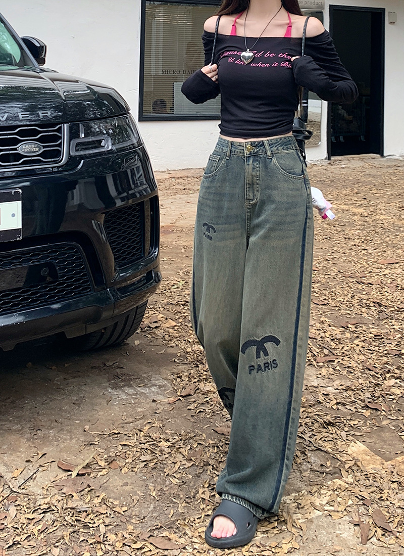 春秋季【新款宽松 字母刺绣复古牛仔裤女】牛仔长裤 高腰遮胯 直筒裤