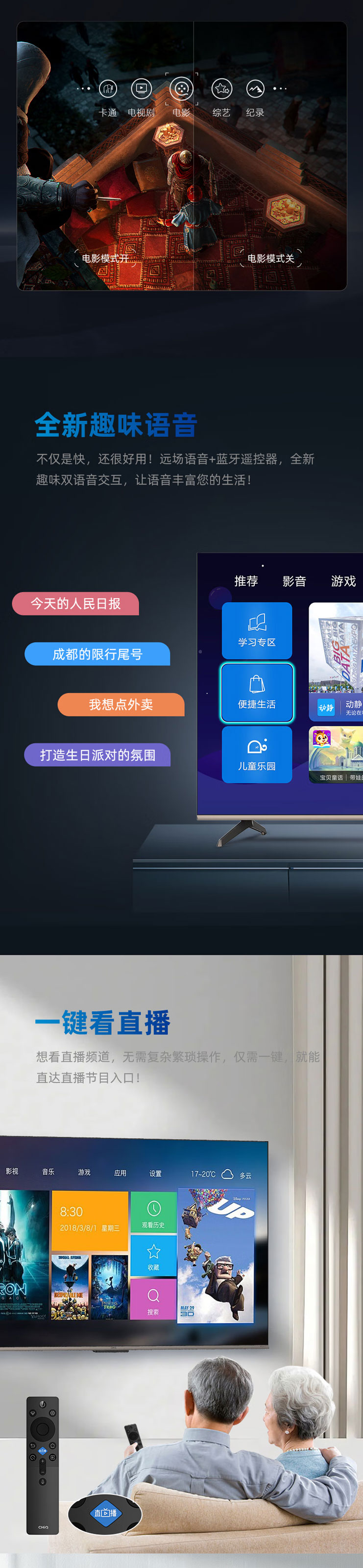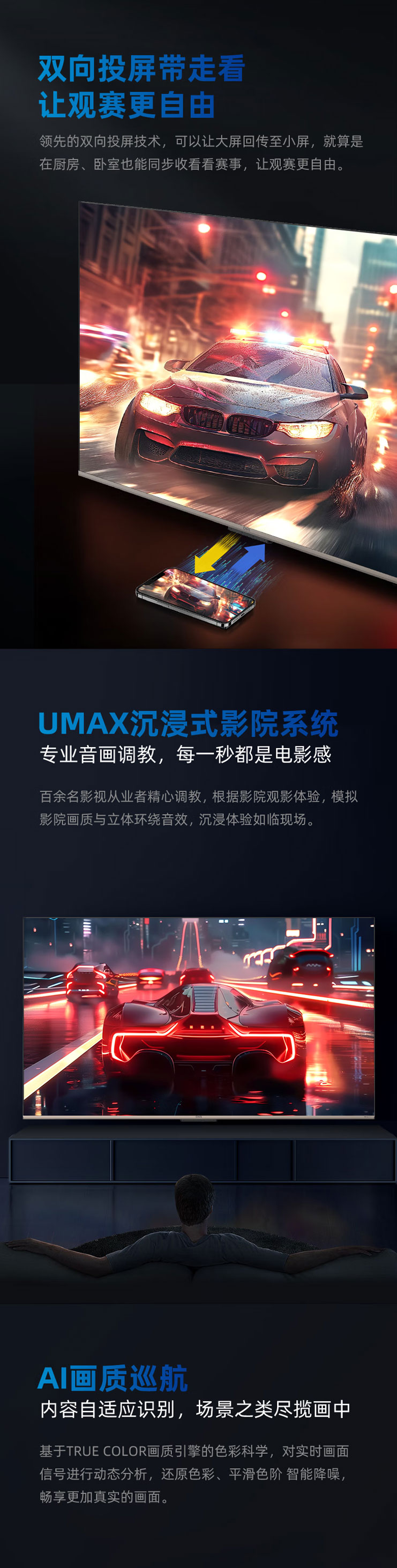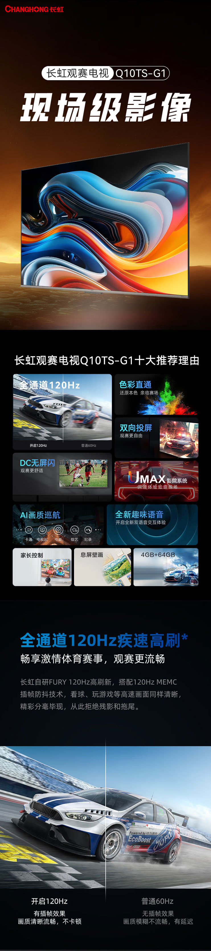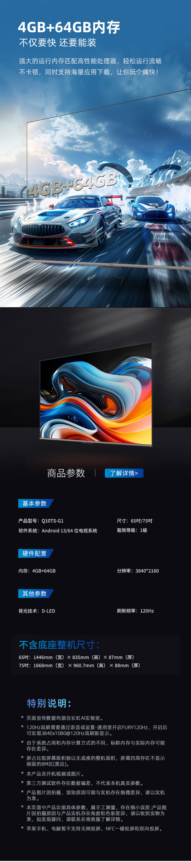 长虹(912834) 75Q10TS-G1 75英寸 观赛电视 全通道120Hz DC无屏闪 UMAX影院系统 4+64GB 平板液晶电视机 75英寸