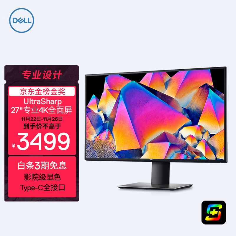 戴尔(DELL)UltraSharp 27英寸 专业显示器 4K IPS Type-C90W反向充电 HDR400 旋转升降 四边微边 U2720QM