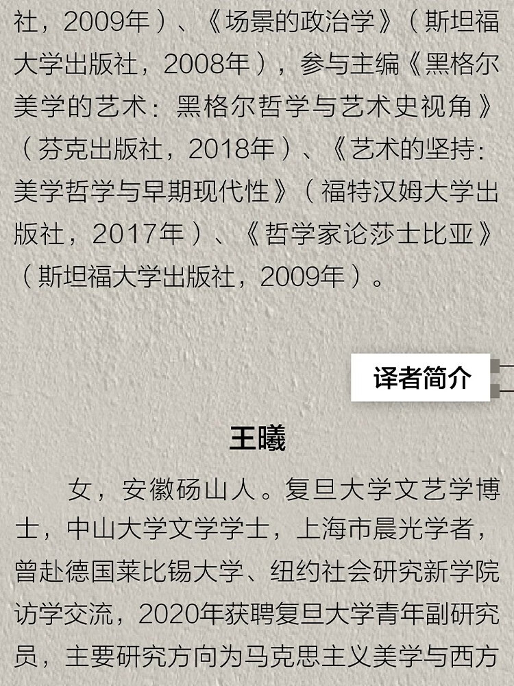 保罗•A.考特曼(Paul A. Kottman),加州大学伯克利分校文学博士,纽约社会研究新学院(New School for Social Research)文学系主席,比较文学与哲学系教授,曾任东京大学、科隆大学形态学国际学院、意大利维罗纳大学等多所国际院校的客座教授。著有《作为人类自由的爱》(斯坦福大学出版社,2017年)、《莎士比亚作品中的悲剧性状况》(约翰•霍普金斯大学出版社,2009年)、《场景的政治学》(斯坦福大学出版社,2007年),参与主编《黑格尔美学的艺术:黑格尔哲学与艺术史视角》(芬克出版社,2018年)、《艺术的坚持:美学哲学与早期现代性》(福特汉姆大学出版社,2017年)、《哲学家论莎士比亚》(斯坦福大学出版社,2009年)。