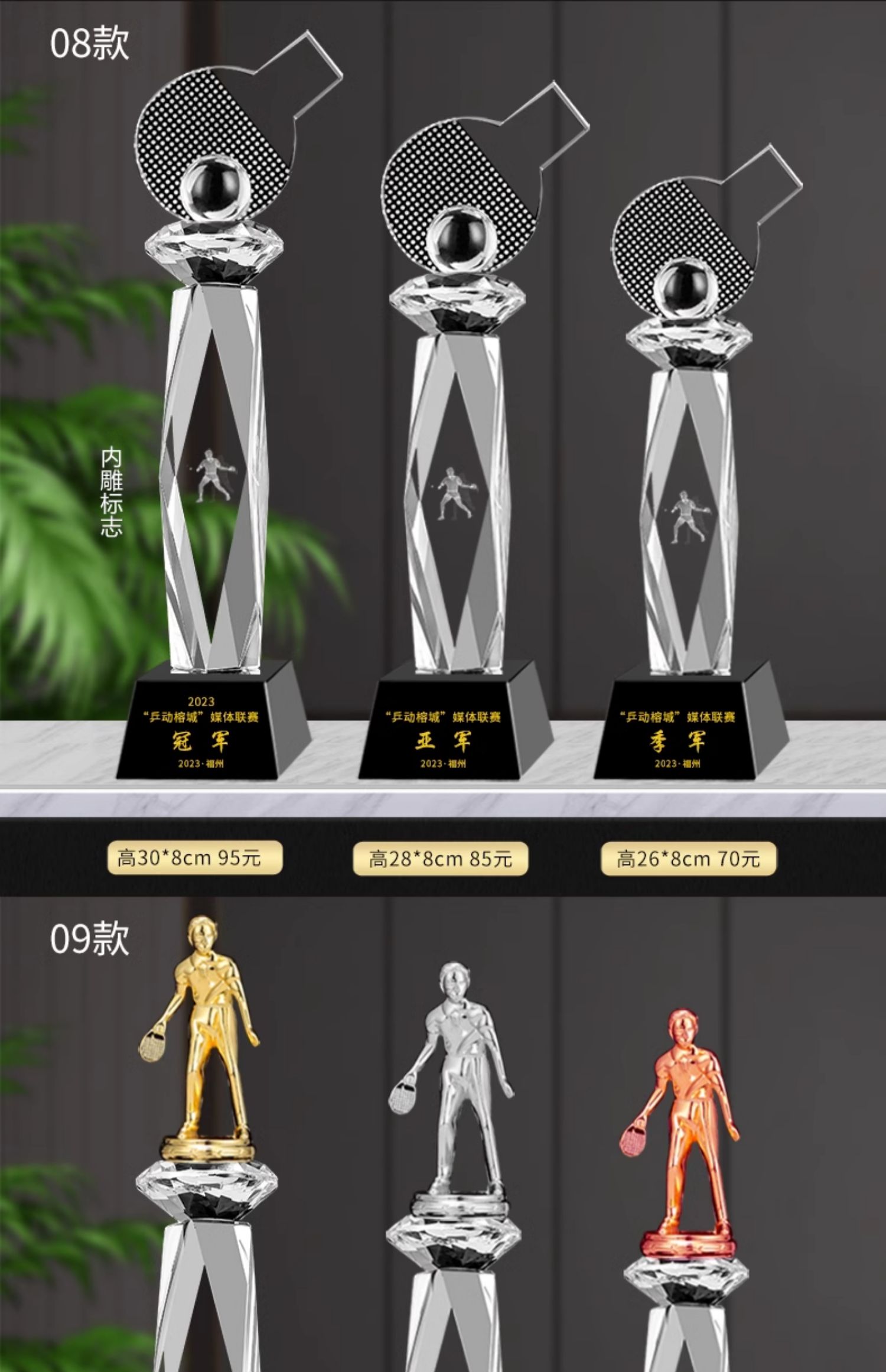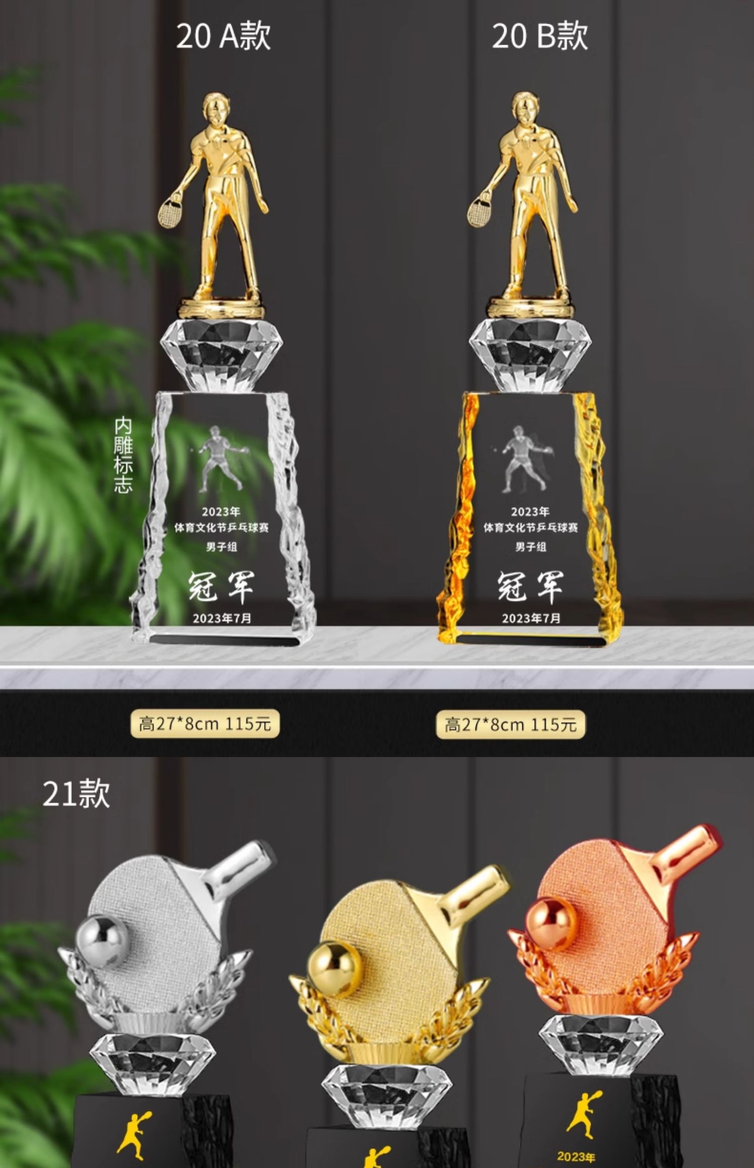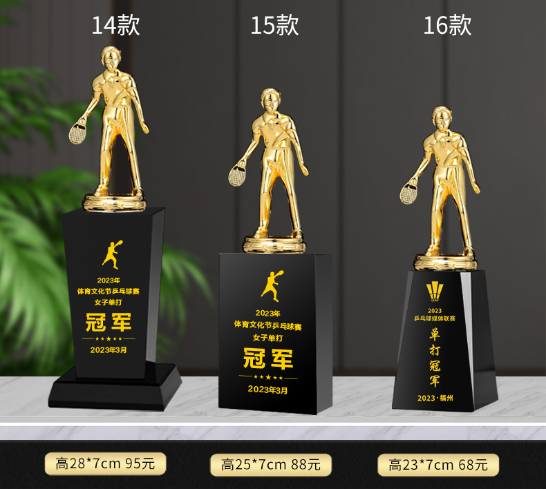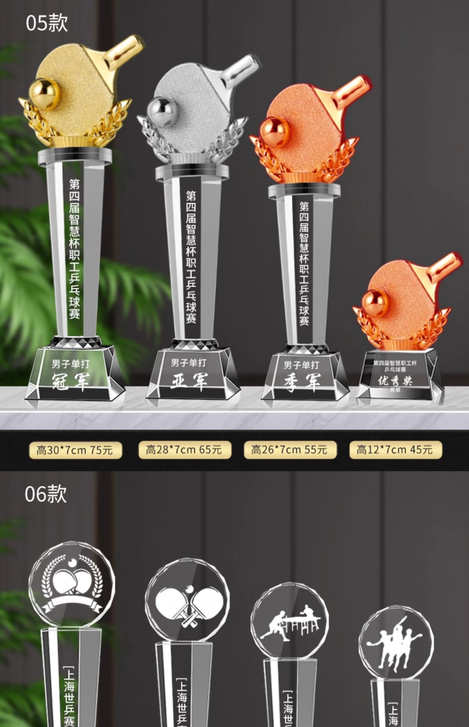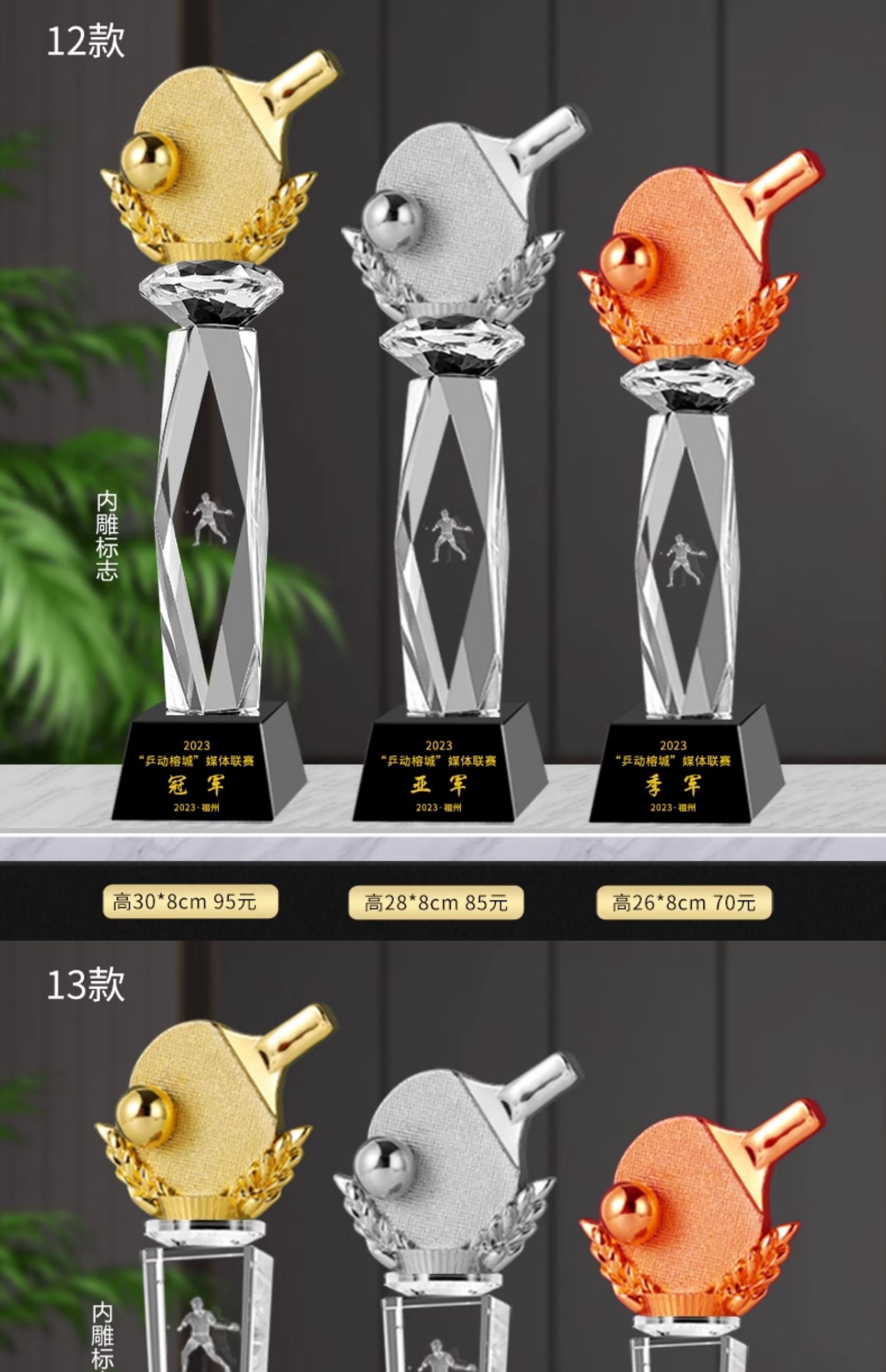 乒乓球水晶奖杯定制定做单打冠军双打团体赛校园体育运动会比赛