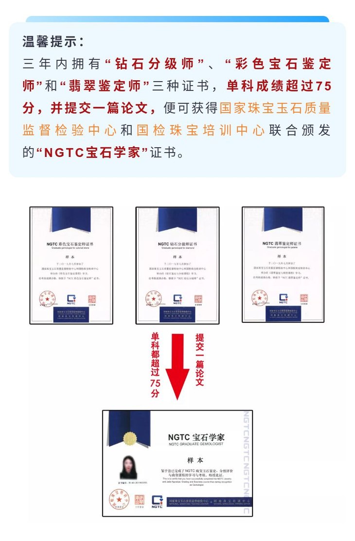 参加课程培训的学生,经考试成绩合格,可获得国家珠宝玉石质量监督检验中心和国检珠宝培训中心联合颁发的“NGTC翡翠鉴定师”证书。