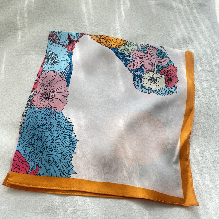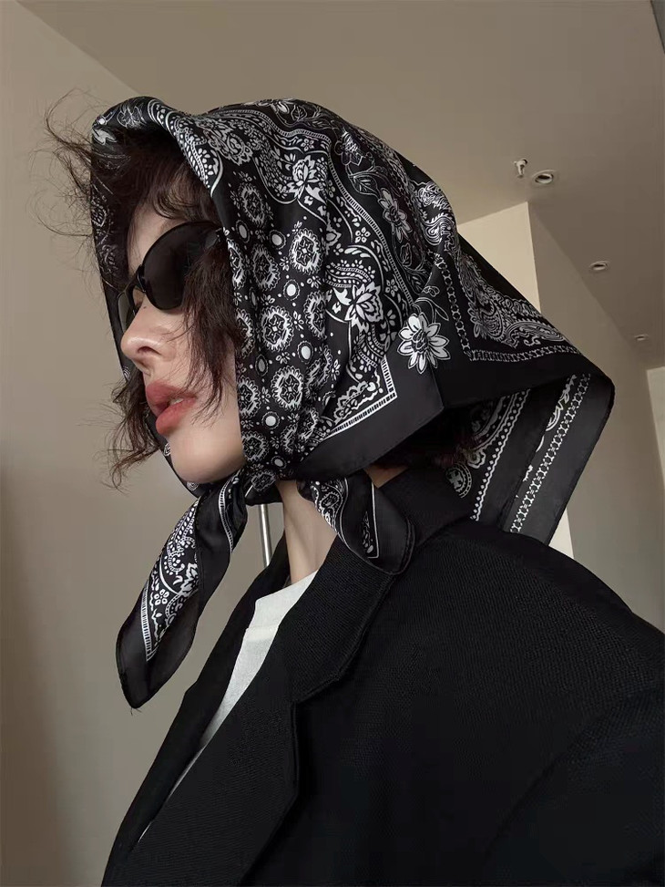 在搭配方面,国风油画风花卉丝巾同样展现出其独特的魅力。 它可以被轻盈地系在颈间,为简约的装扮增添一抹亮色让人眼前一亮。 或是将其作为头巾,搭配复古发型,瞬间提升整体造型的复古韵味。 此外,它还可以被巧妙地用作手腕上的装饰,或是系在包包上,为日常出行增添一份别样的风情。