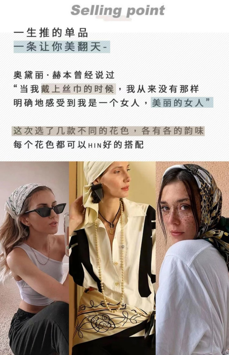 春日出街手册颈上添花,get赫本式优雅 丝巾在时尚搭配中有着百变可塑性,多样化的系法,呈现出不同风格的混搭时尚。 记得奥黛丽赫本说过:"我只有一件衬衫,一条裙子,一顶贝雷帽,一双鞋,却足足有14条丝巾。" 图中十款丝巾灵动多变,可与各种时尚造型搭配,无论是系绕在颈间、或作为上衣、腰带及头巾发带佩戴,皆赏心悦目。 你离奥黛丽.赫本,也许就差一条丝巾。