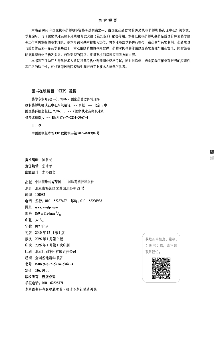 2026药学专业知识(一)(第九版·2026)(国家执业药师职业资格考试指南)可供高等医药院校师生等人员学习 中国医药科技出版社