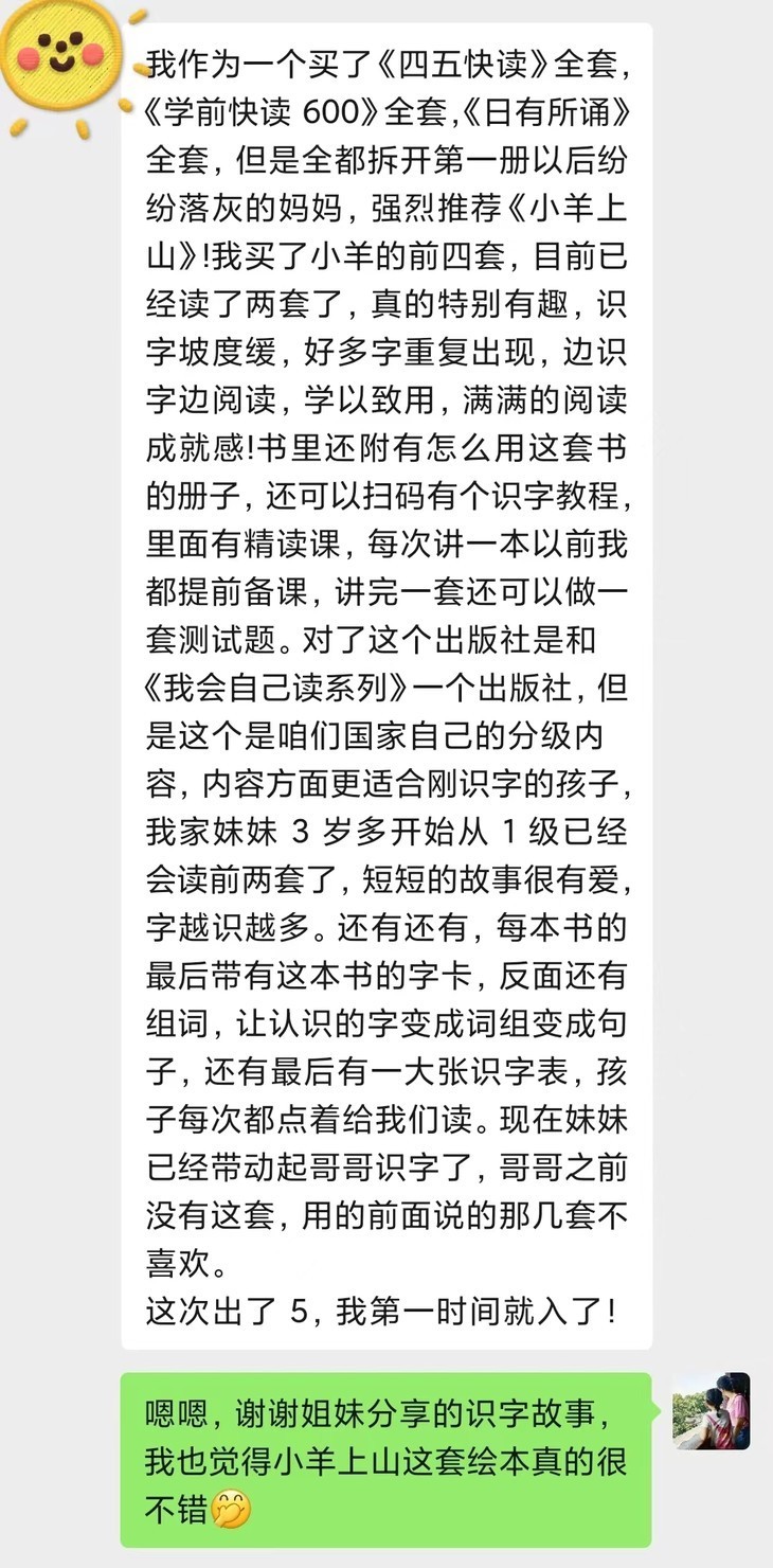 《小羊上山》是第一套真正意义上的中国汉语原创分级读物。用创新研发的科学方法,让孩子自主阅读,全面提升阅读能力。全国80万家庭都在用,我们群之前也有非常多的孩子学会了自主阅读!