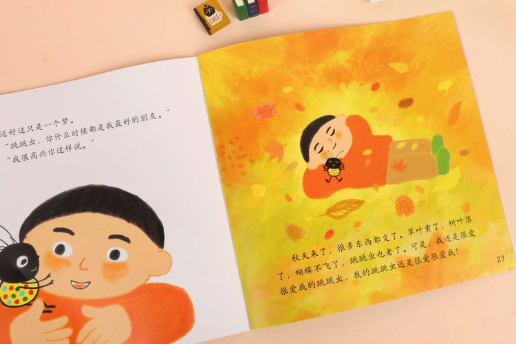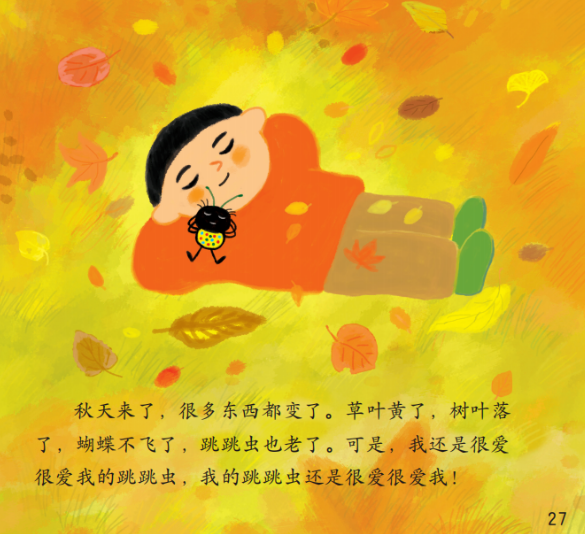 《跳跳虫老了》和前几级欢乐的跳跳虫不一样,跳跳虫老了,跳不动了。它再也不能和小男孩一起,在田野里、在家里尽情地跳跃了……读完这个故事,孩子能感悟到,生命的“老去”无法避免,但我们仍然可以抛开忧伤和消沉,珍惜和身边人在一起的每一刻。