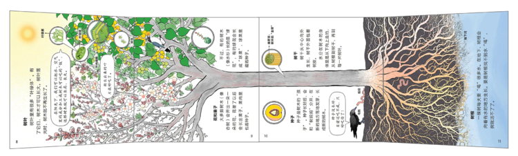 《树木》还首次采用了四折页的形式,给孩子带来了更震撼的科普体验,相信孩子们看完一定会惊叹:从树根、树干到树叶,再到花朵、果实和种子,树木的有趣真是超乎想象!