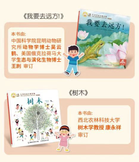《我要去远方!》 由:中国科学院昆明动物研究所动物学(两栖爬行动物方向)博士 吴云鹤、美国俄克拉荷马大学生态与演化生物学 (两栖爬行动物方向)博士 王剀 审订。《树木》由:西北农林科技大学树木学教授 康永祥 审订。