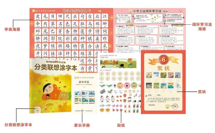 此外还有超丰富的辅助工具:字表、奖状、家长手册,贴纸、闭环学习法海报、领课卡等。