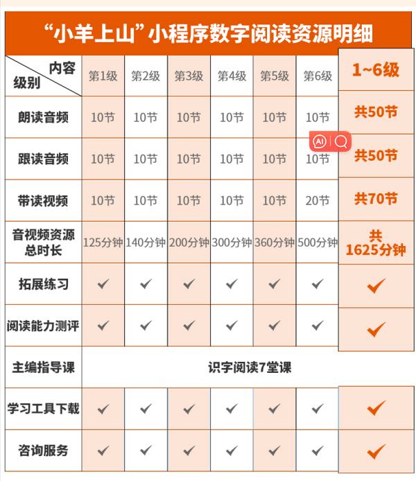 小羊上山1-6级,共包含390个儿童阅读常用核心字,基本覆盖小学一年级(上)语文课本字表。